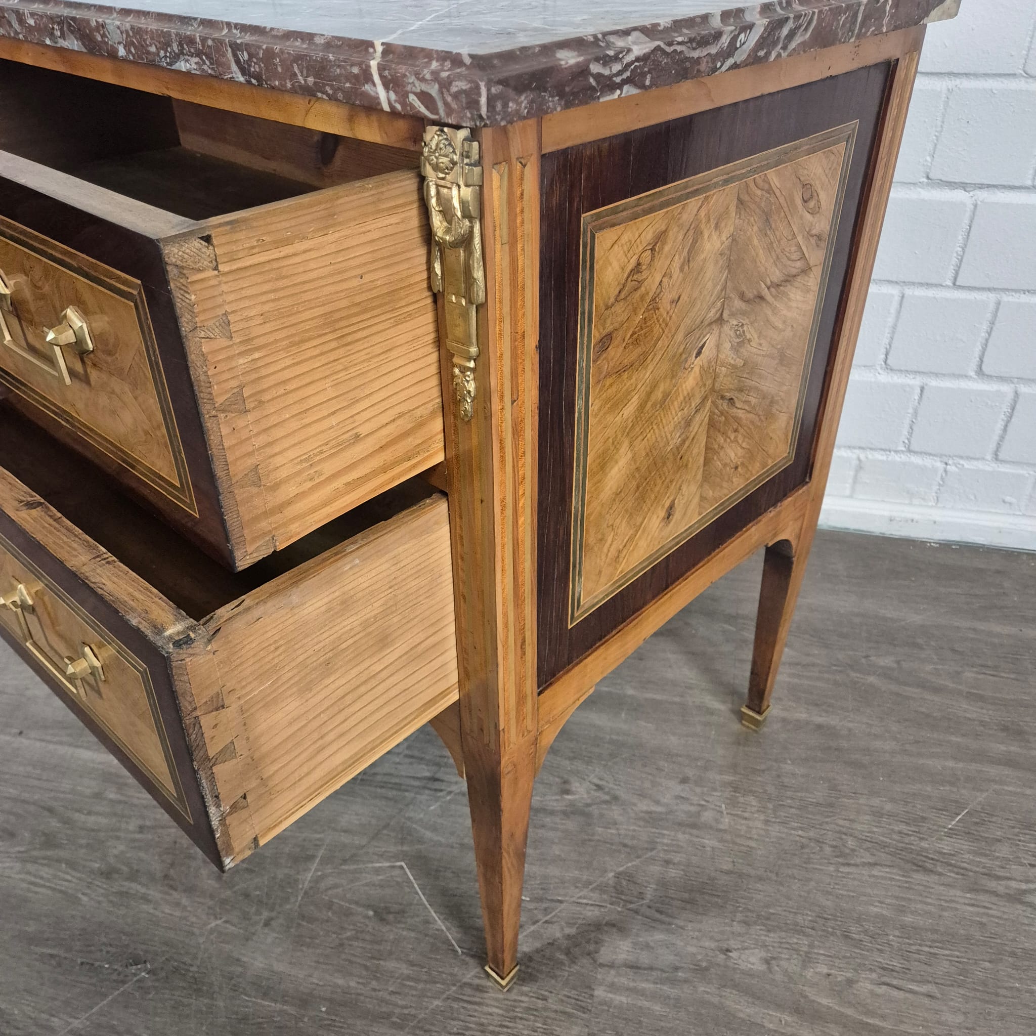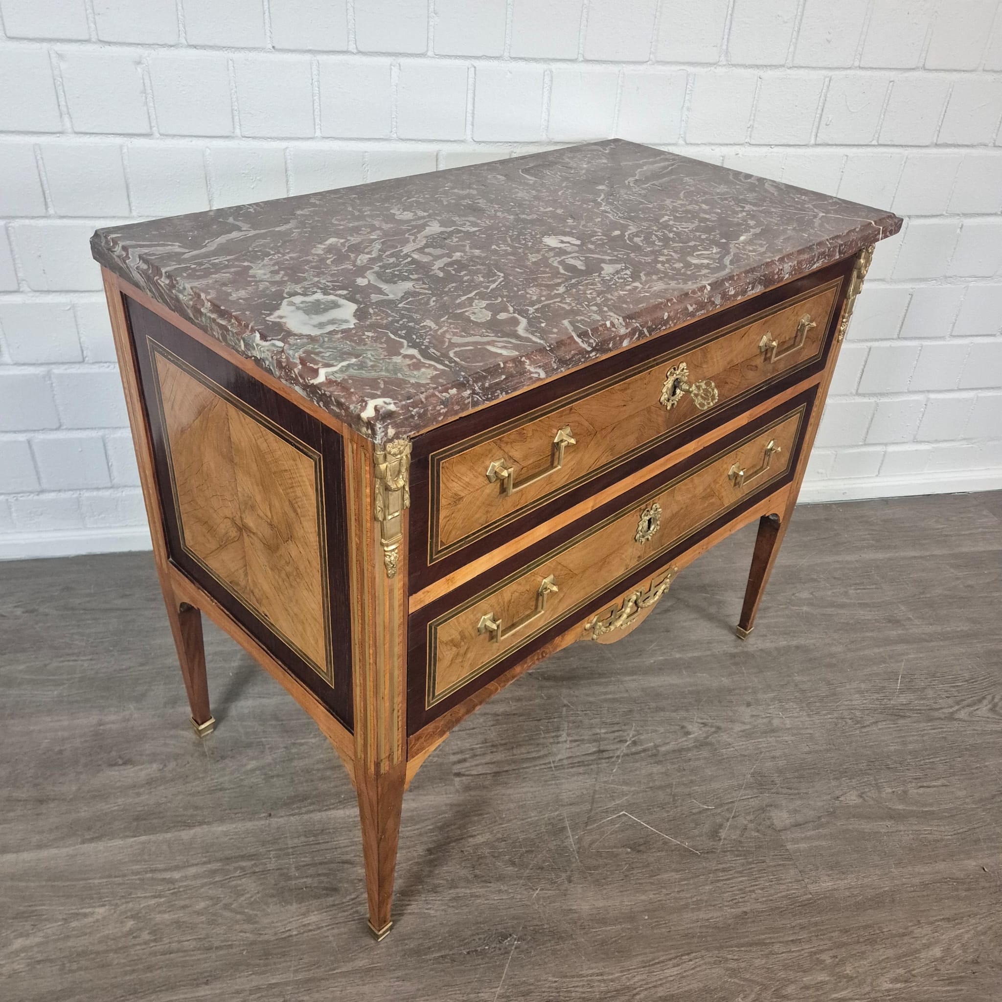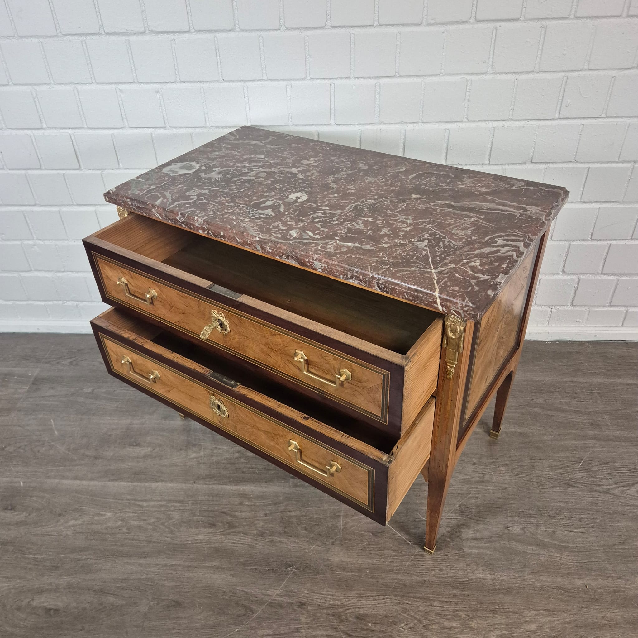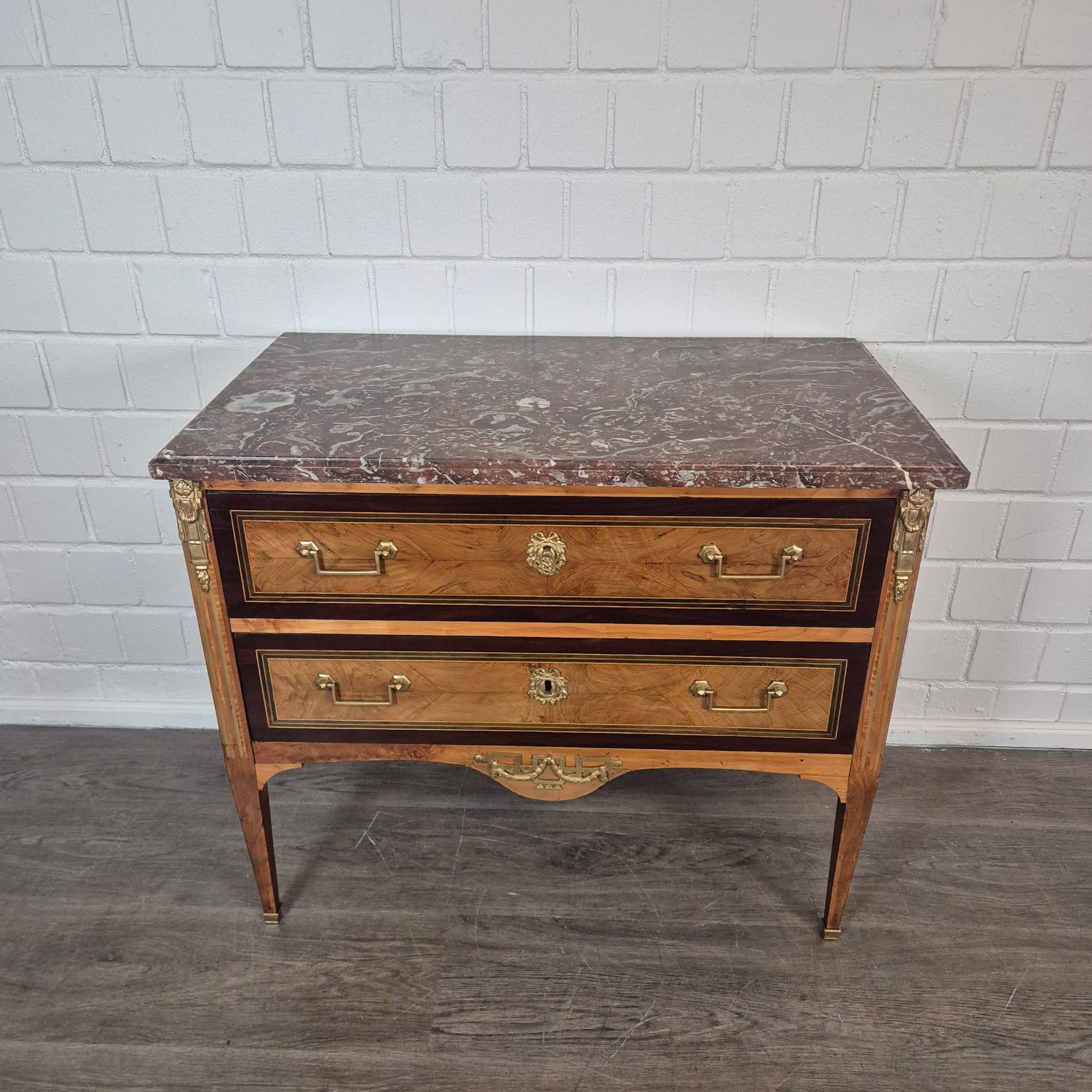 €1.679,83 Excl. btw:Prachtig gerestaureerde Empire commode, gefineerd in notenhout en van de basis af met schellak gepolijst, daterend uit circa 1790. De ladekast is voorzien van een marmeren blad en verkeert in een zeer goede staat met slechts minimale gebruikssporen.