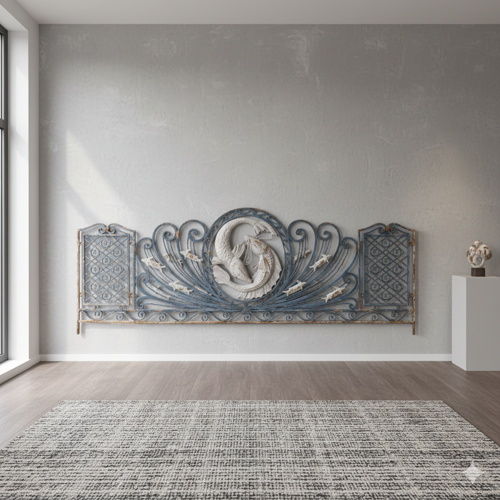 Design hoogtepunten: Het centrale motief toont twee kunstig vormgegeven vissen die in een golfachtig frame dartelen – een typisch en populair Art Nouveau-motief dat de verbondenheid met de natuur en vloeiende vormen viert. Het centrale element wordt aan de zijkanten geflankeerd door twee filigrane rankornamenten, die het totaalbeeld harmonieus afronden. De combinatie van massief smeedijzer en filigraan details maakt dit rooster tot een uniek kunstwerk.