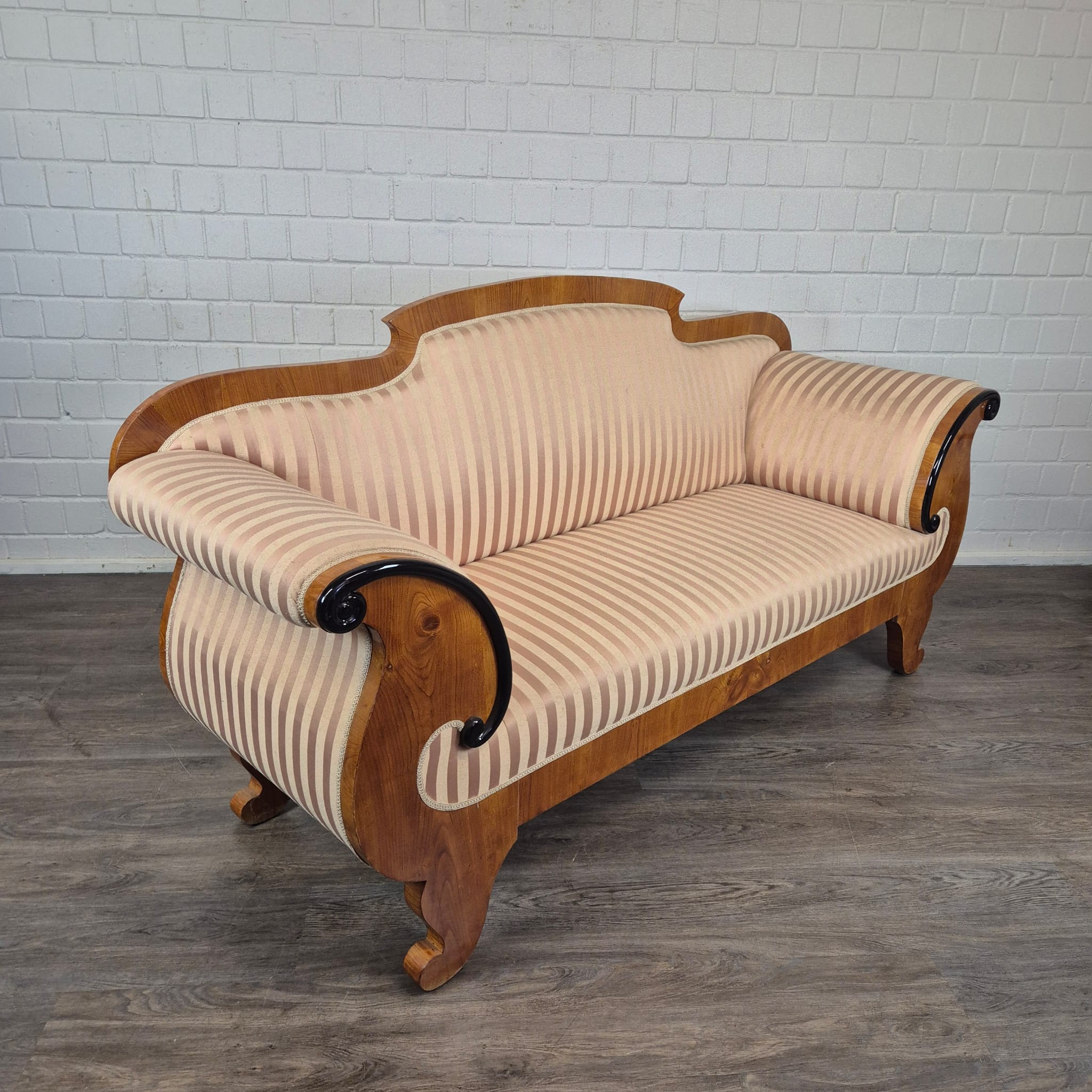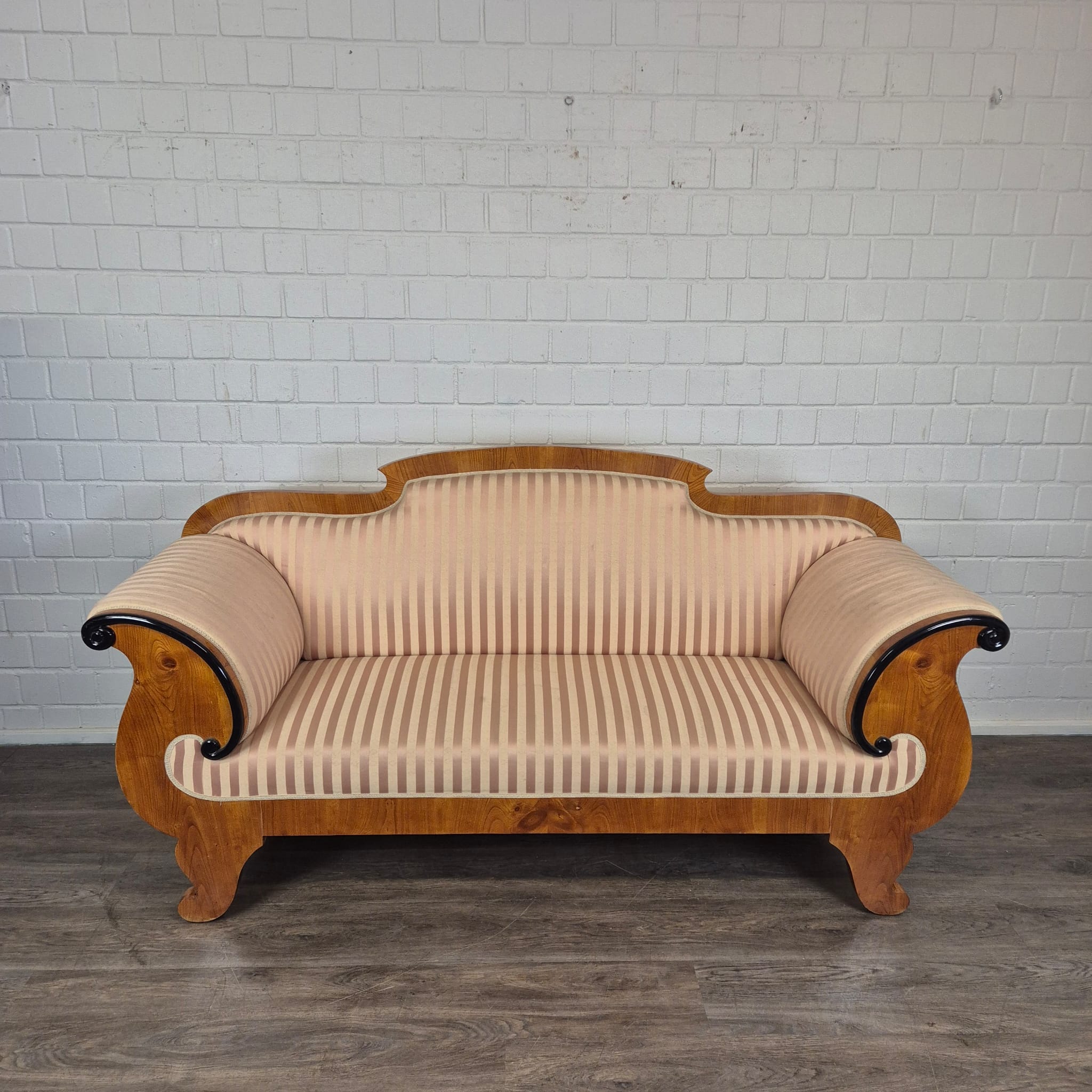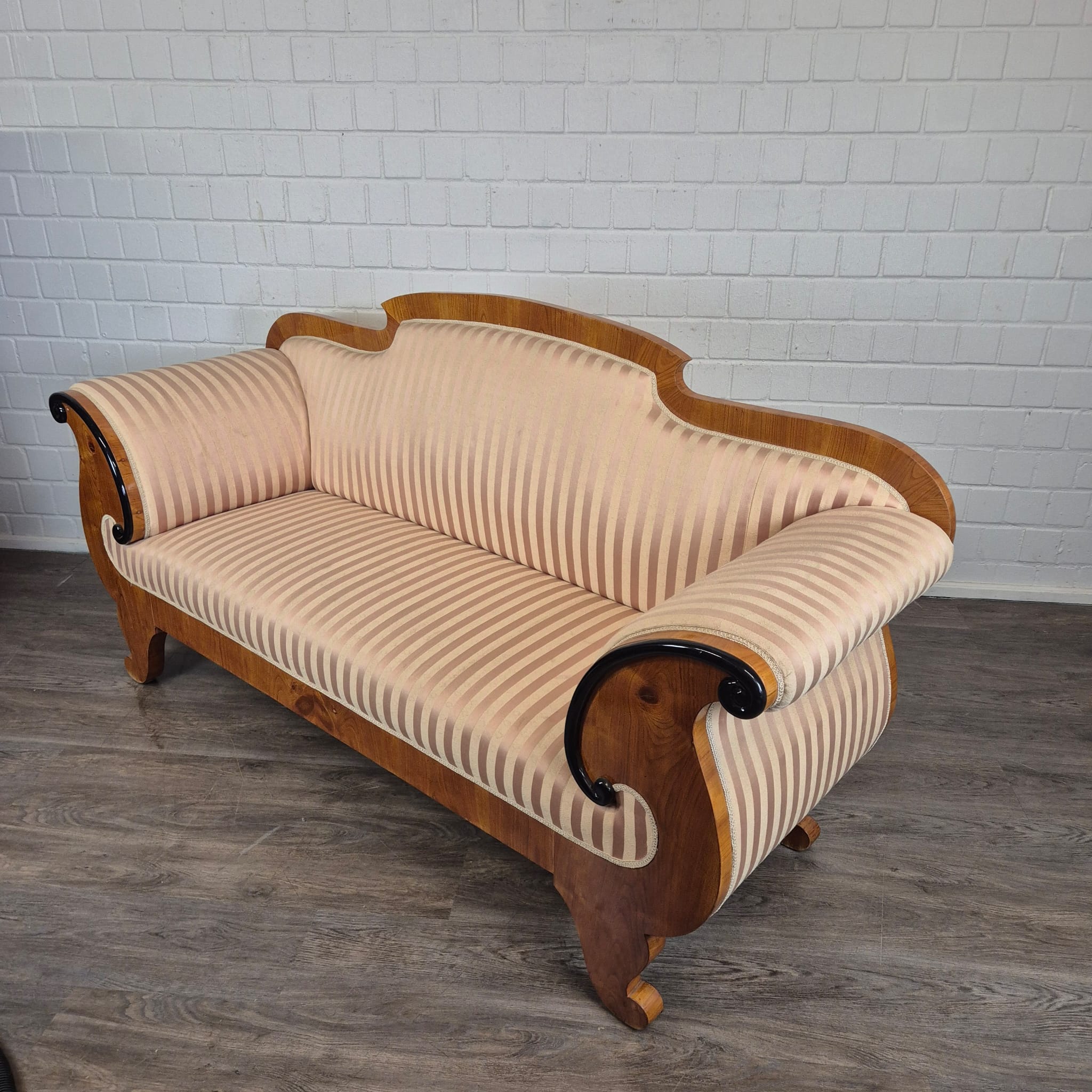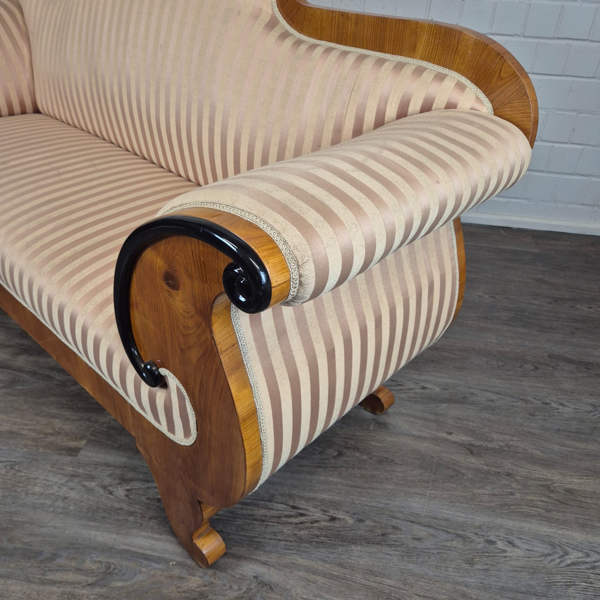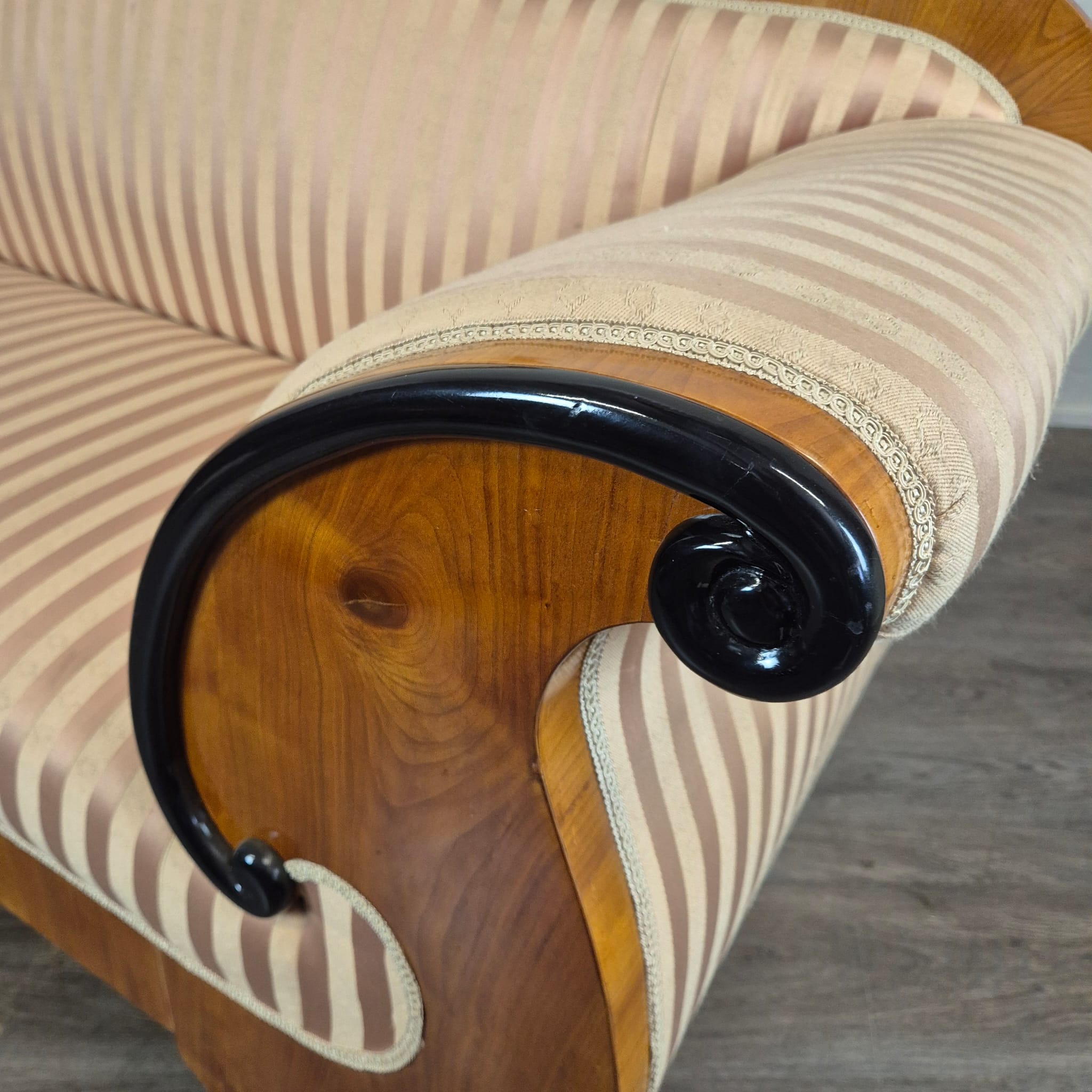Design: Klassieke Biedermeier-silhouet met elegant gebogen armleuningen die uitmonden in kunstzinnig, zwart geëboniseerd krulwerk. De gebogen rugleuning en de robuuste poten, typerend voor deze periode, maken het geheel harmonieus af.