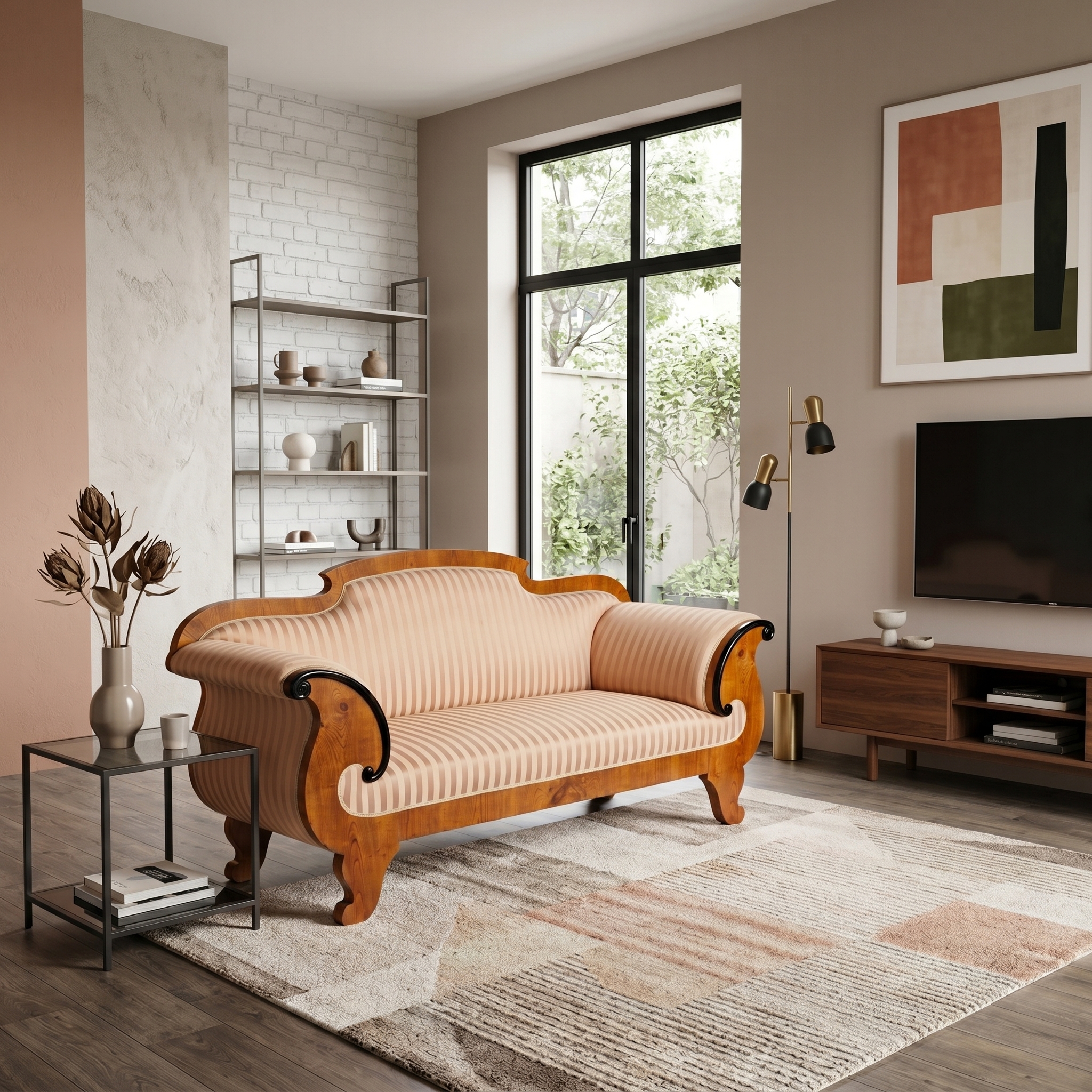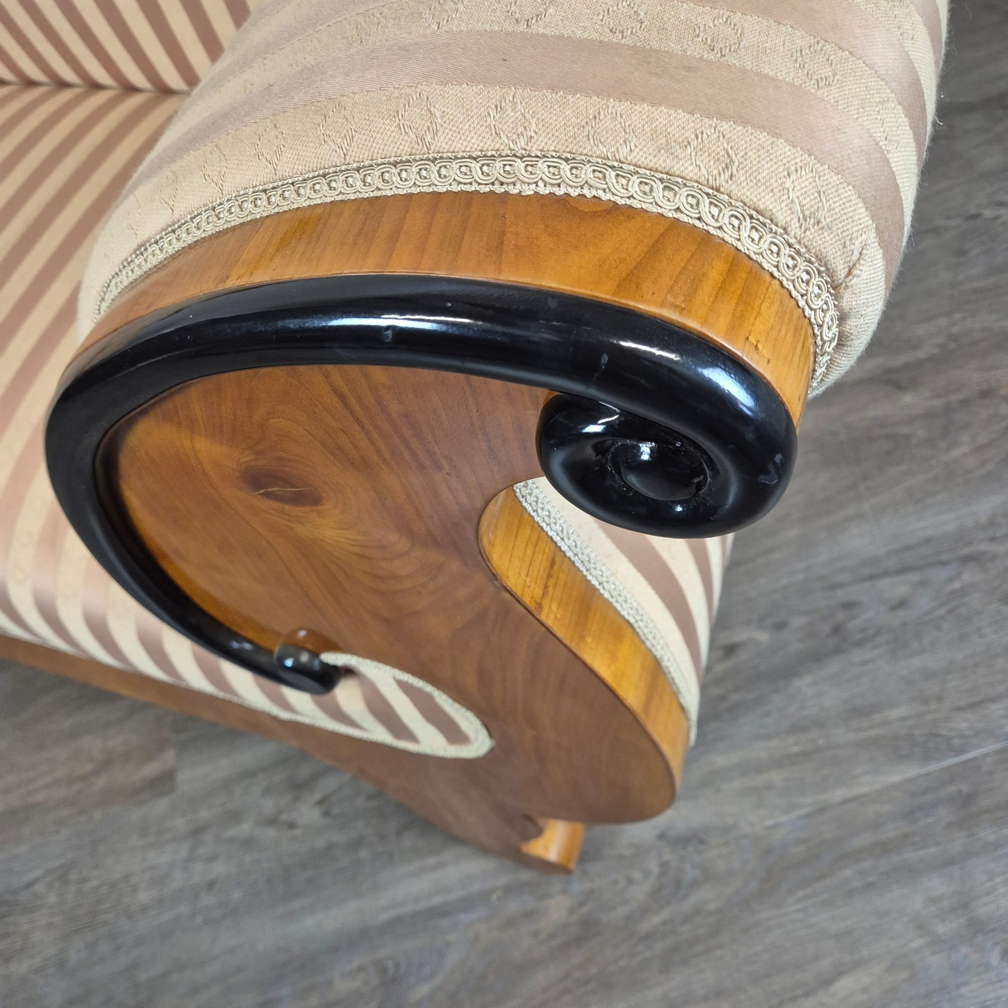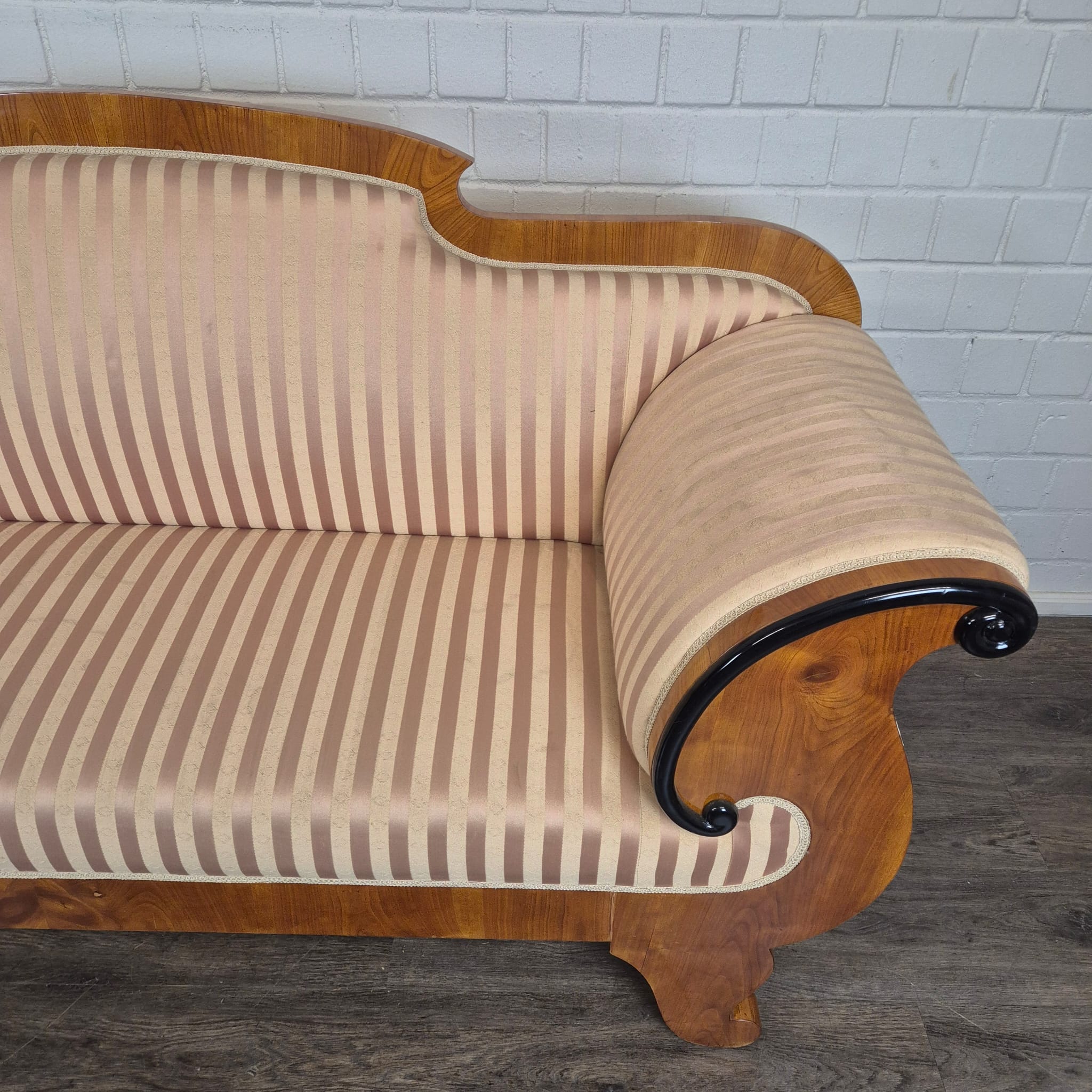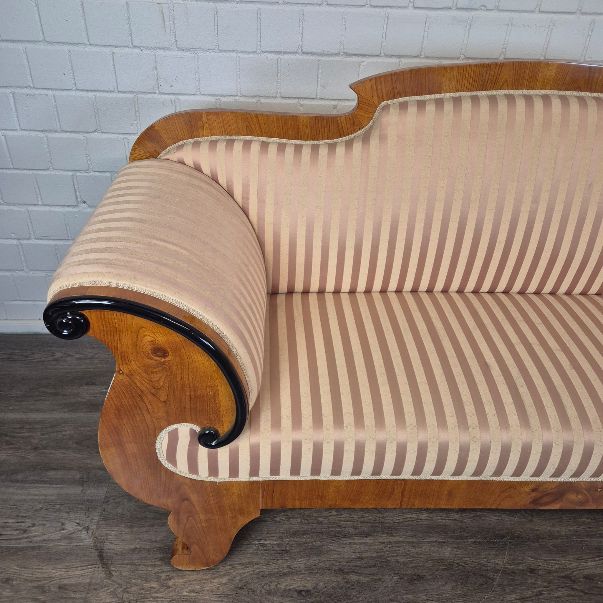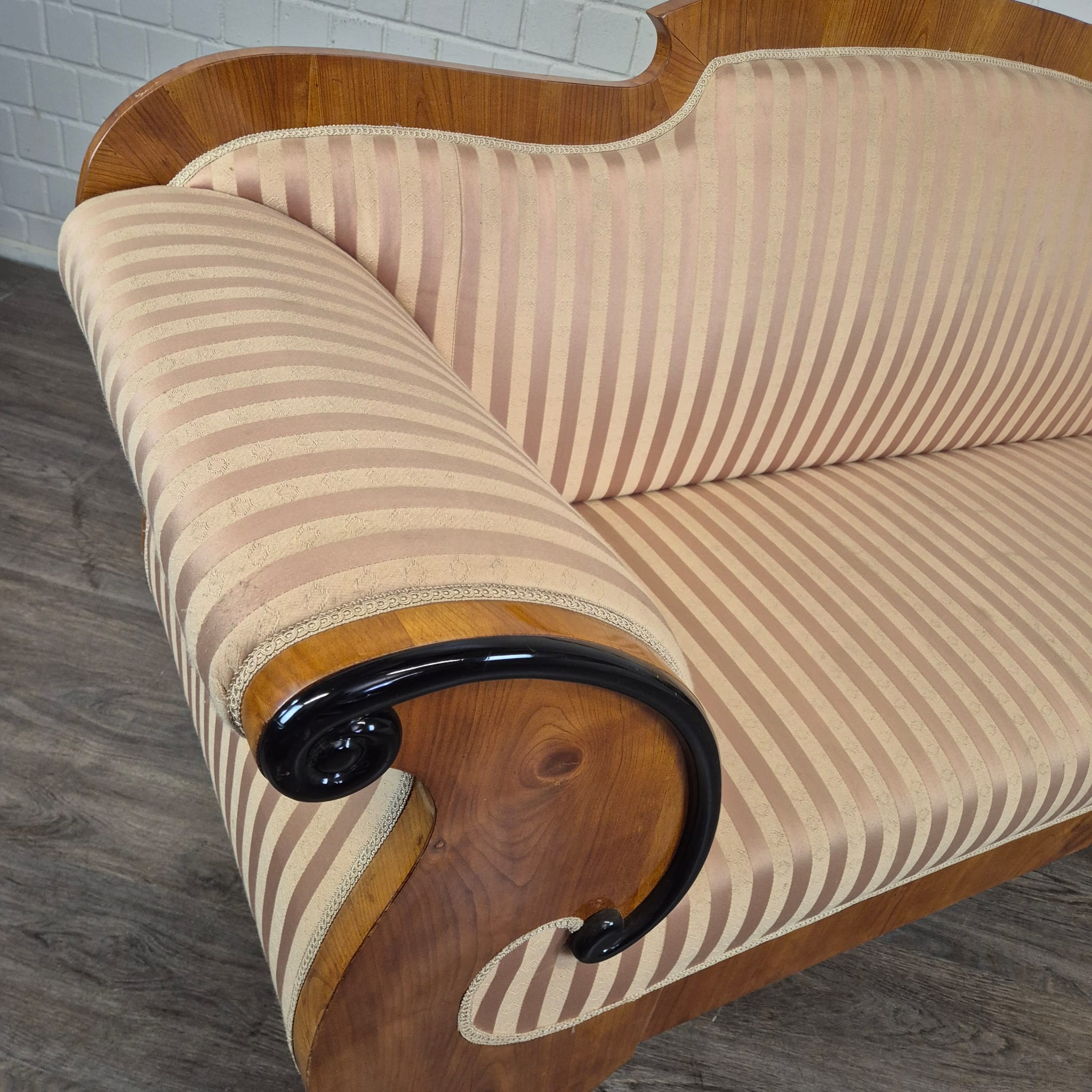 Design: Klassieke Biedermeier-silhouet met elegant gebogen armleuningen die uitmonden in kunstzinnig, zwart geëboniseerd krulwerk. De gebogen rugleuning en de robuuste poten, typerend voor deze periode, maken het geheel harmonieus af.
