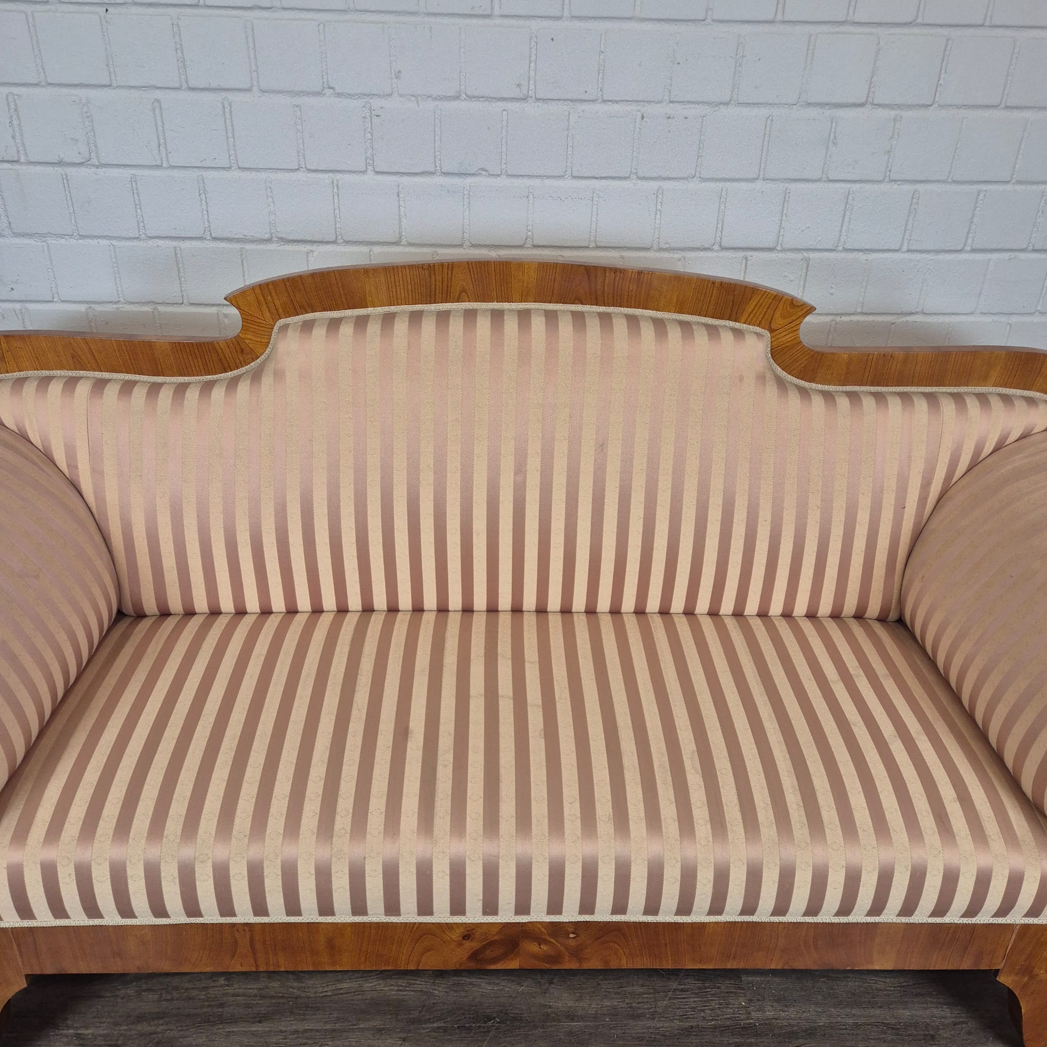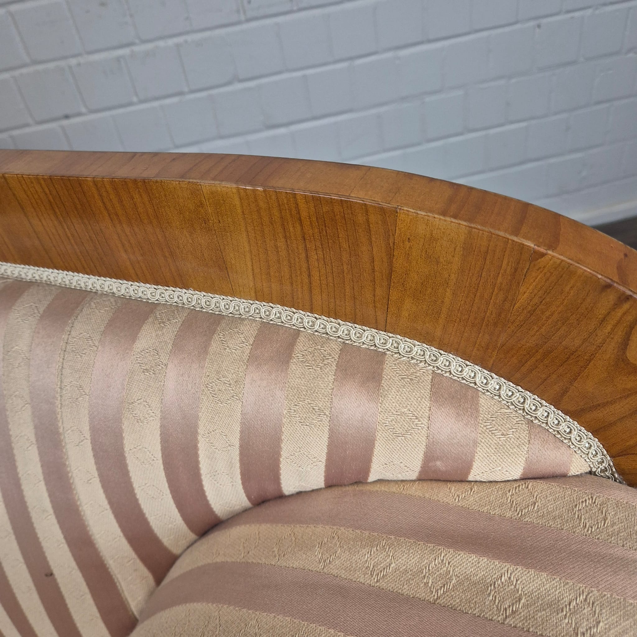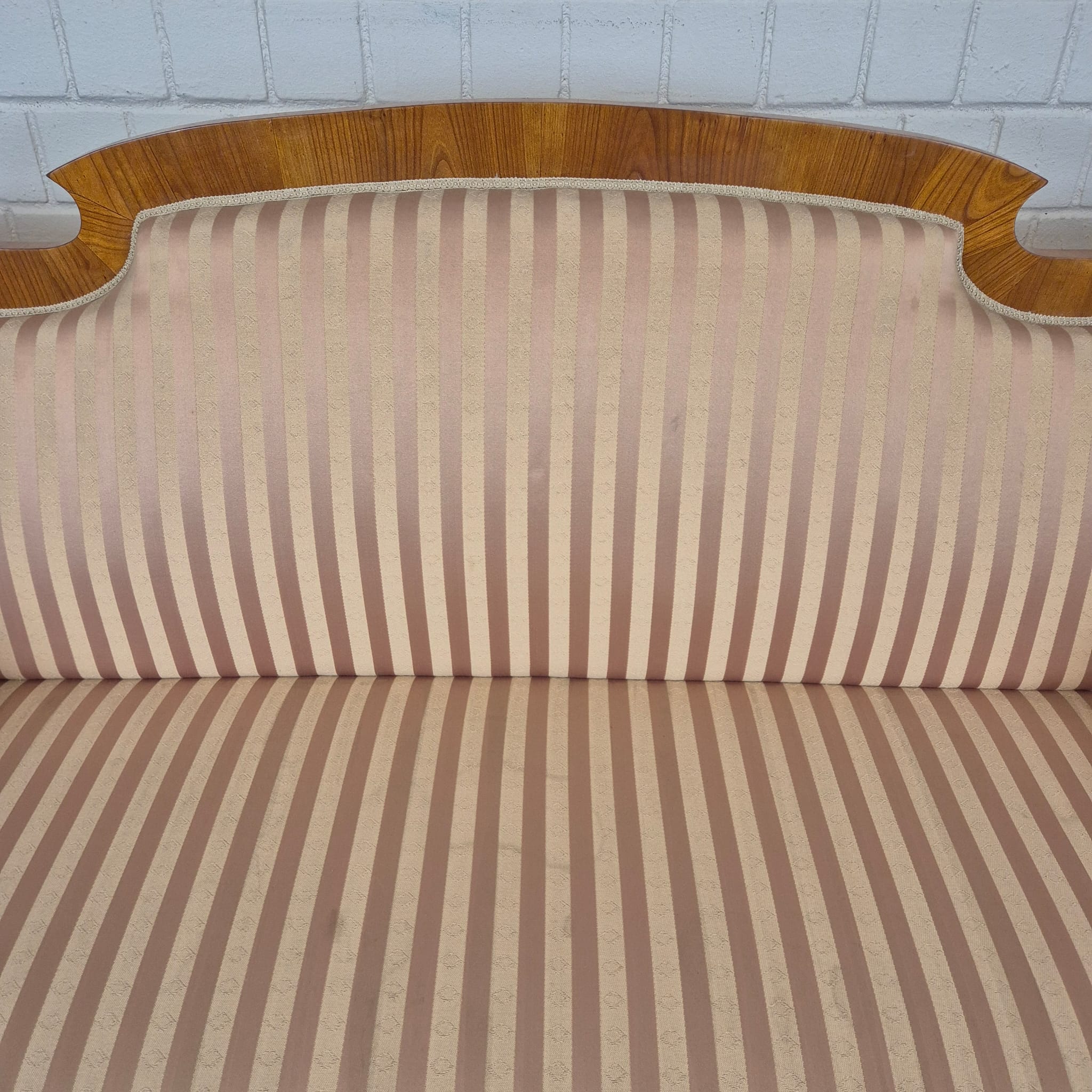 Bekleding & Hoes: De bank is bekleed met comfortabele, traditionele stof. Hij is gestoffeerd met een stijlvolle, gestreepte, zijdezachte damaststof in warme roze en beige tinten die perfect passen bij het kersenhout. De bekleding is schoon, strak en zonder zichtbare gebreken.
