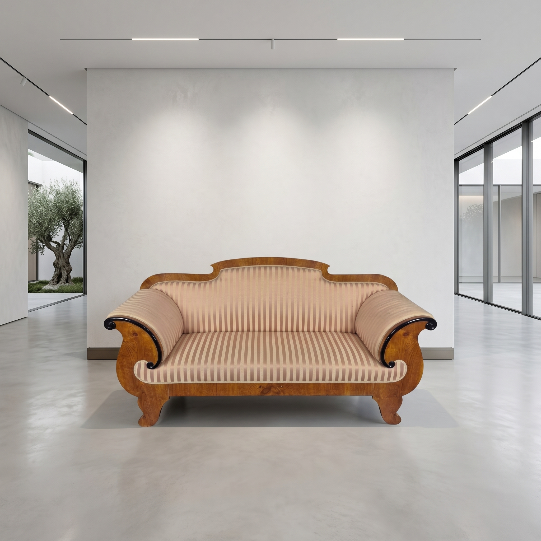 Prachtige en authentieke Biedermeier-bank uit circa 1830. Dit meubelstuk betovert met zijn tijdloze elegantie, strakke lijnen en meesterlijke vakmanschap, kenmerkend voor dit tijdperk.