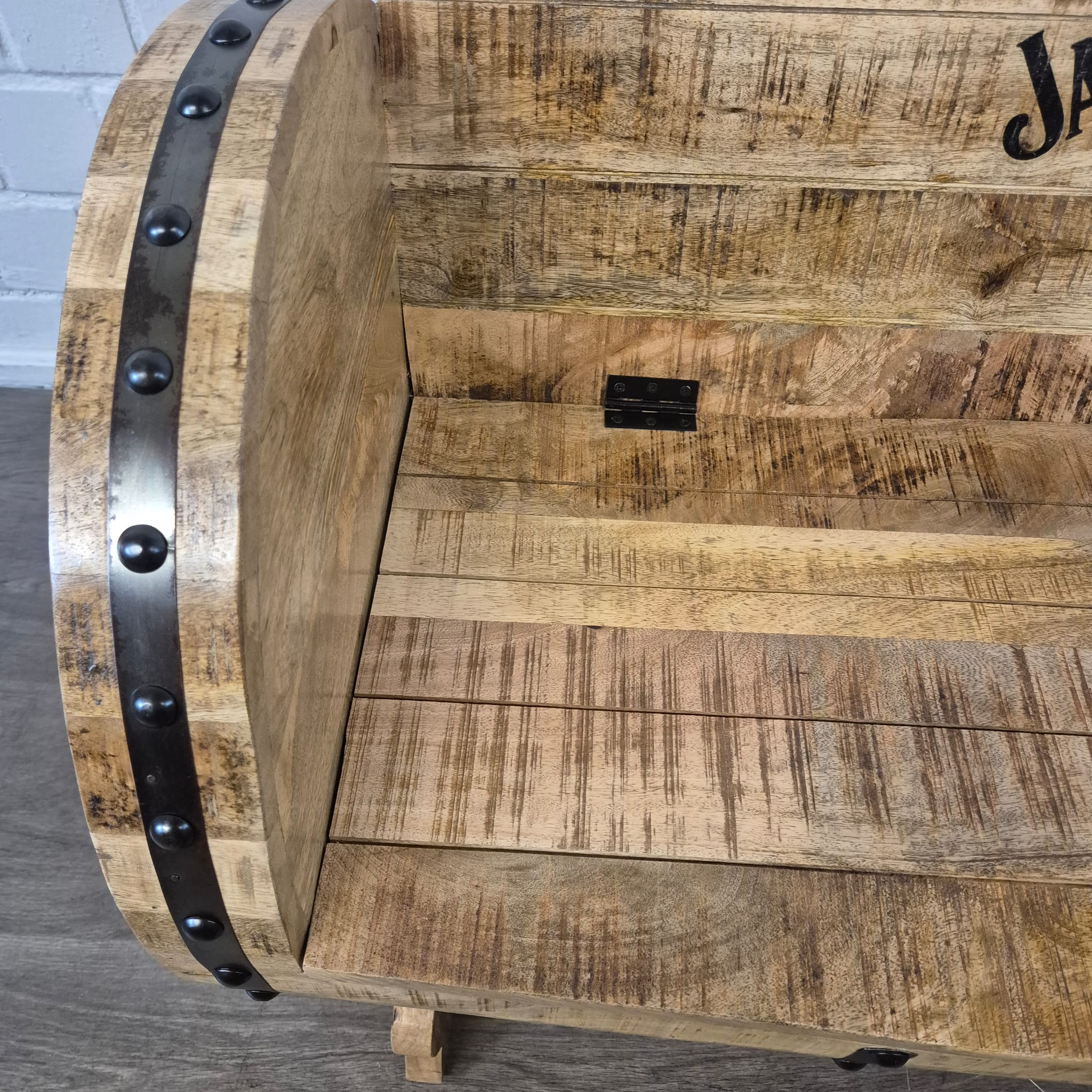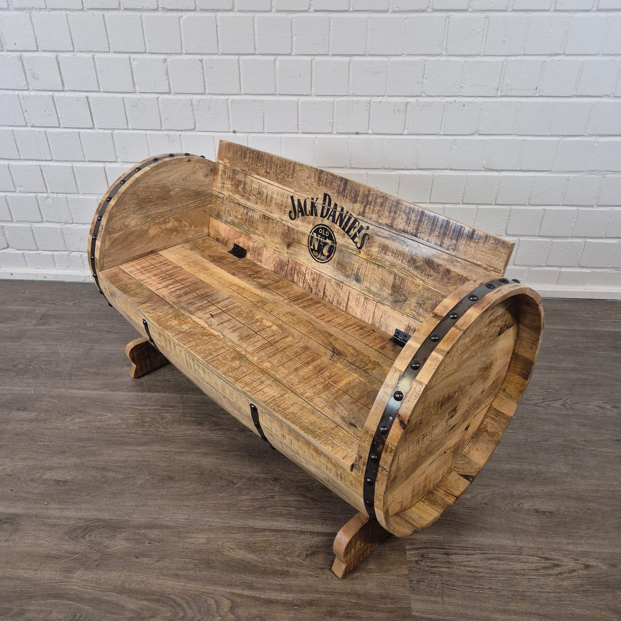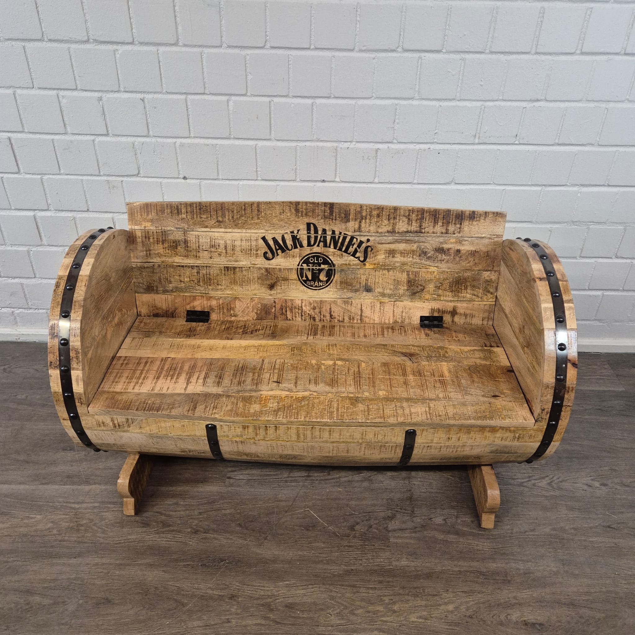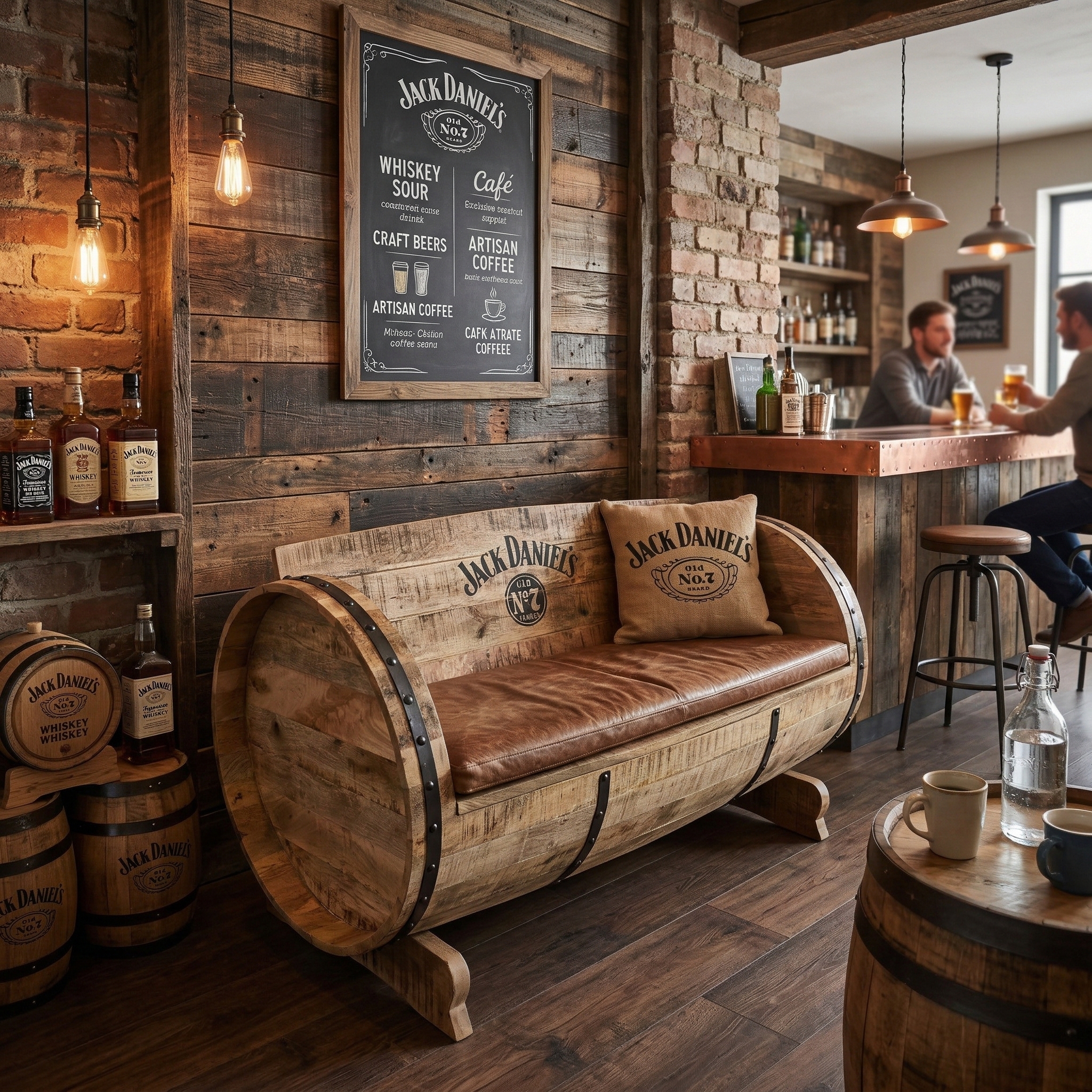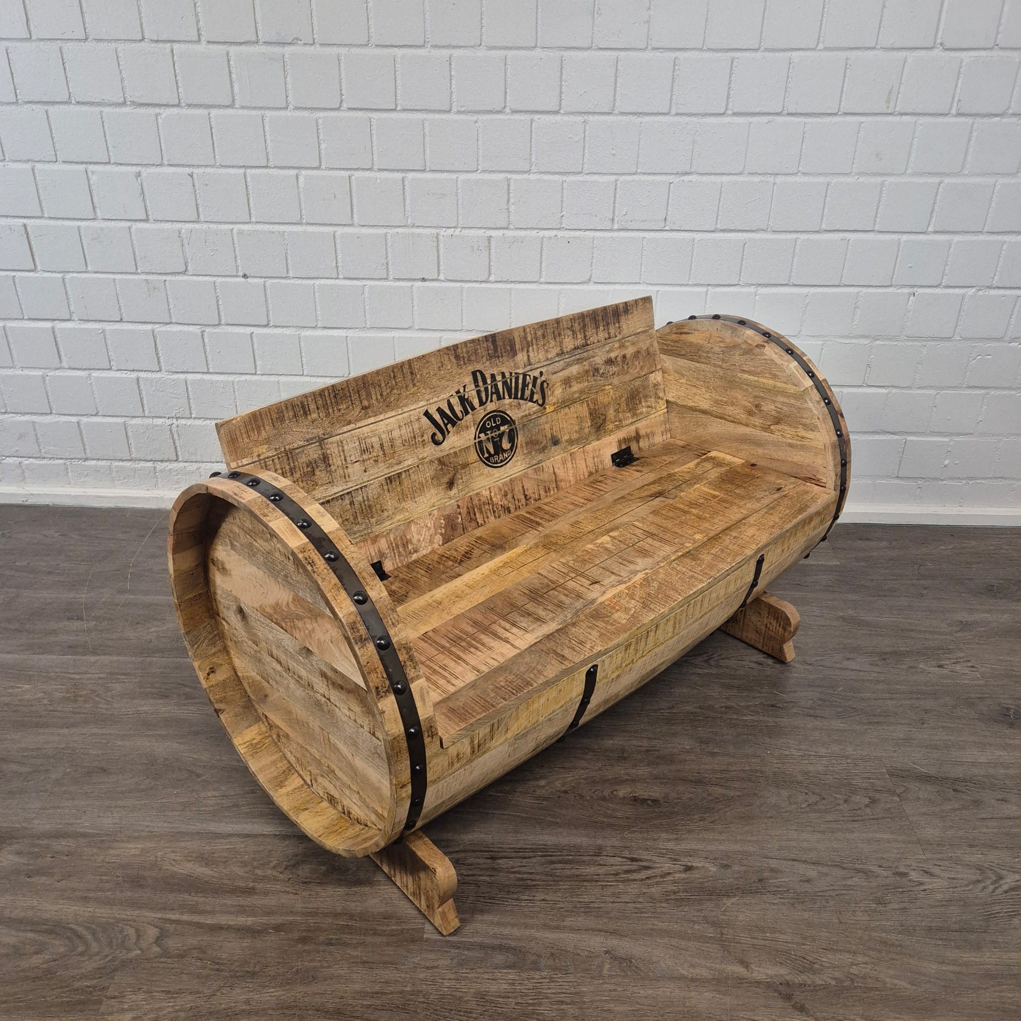 Authentiek design: De bank is gemodelleerd naar een klassiek whiskyvat. De gebogen zijwanden van vatlatten, versierd met donkere metalen banden en klinknagels, creëren een rustieke, industriële uitstraling.