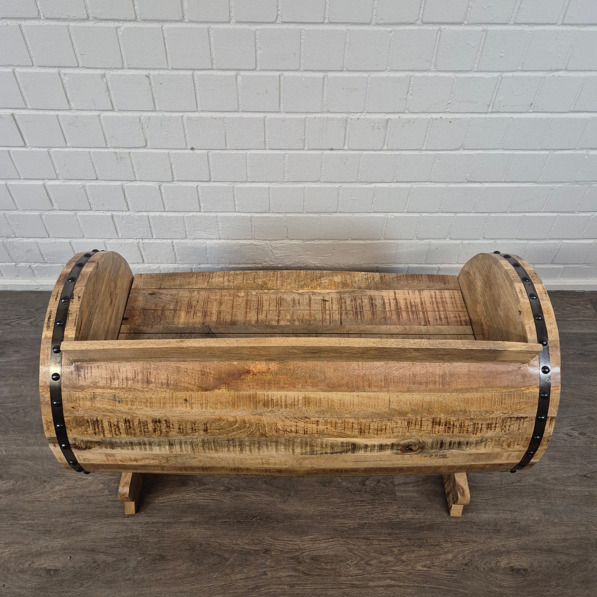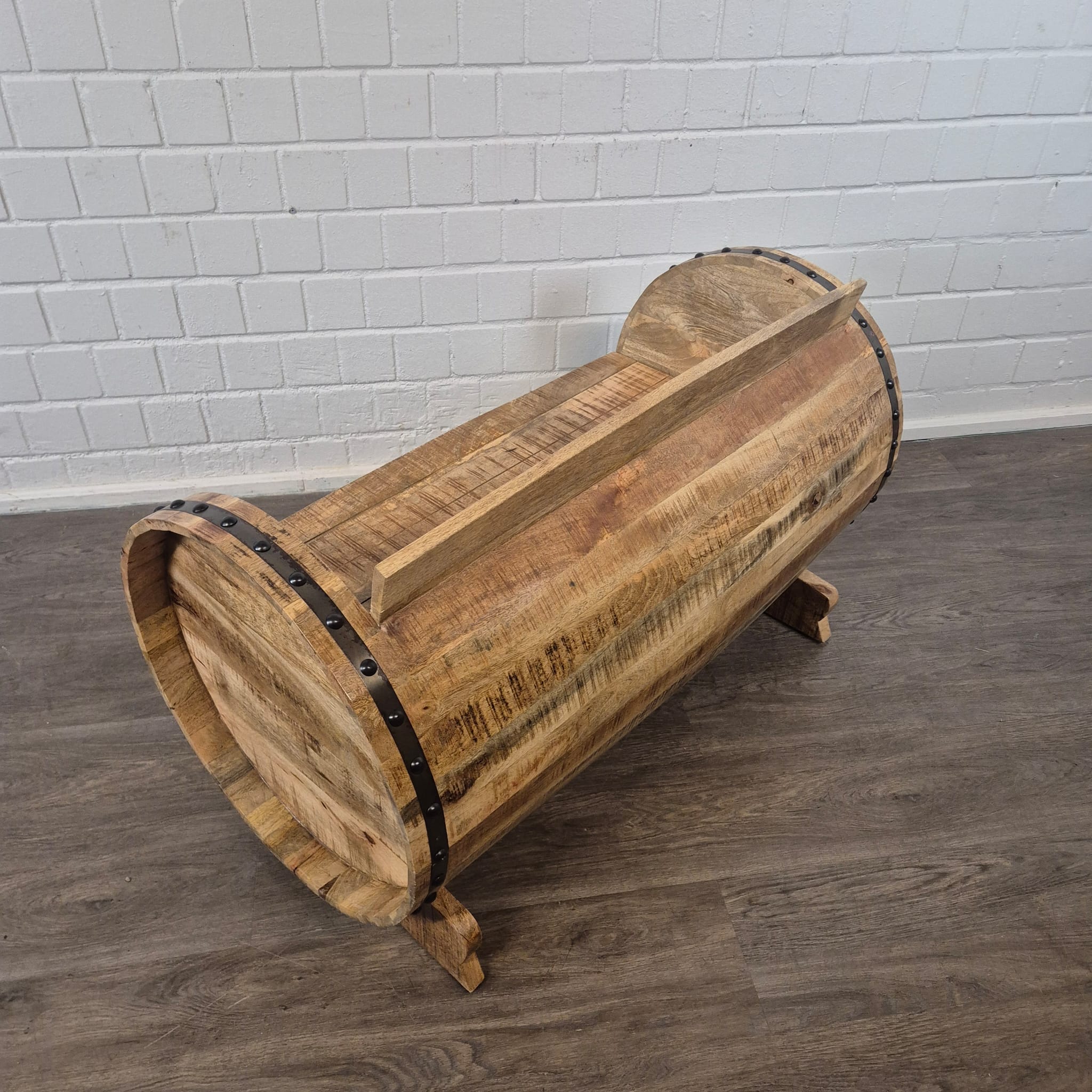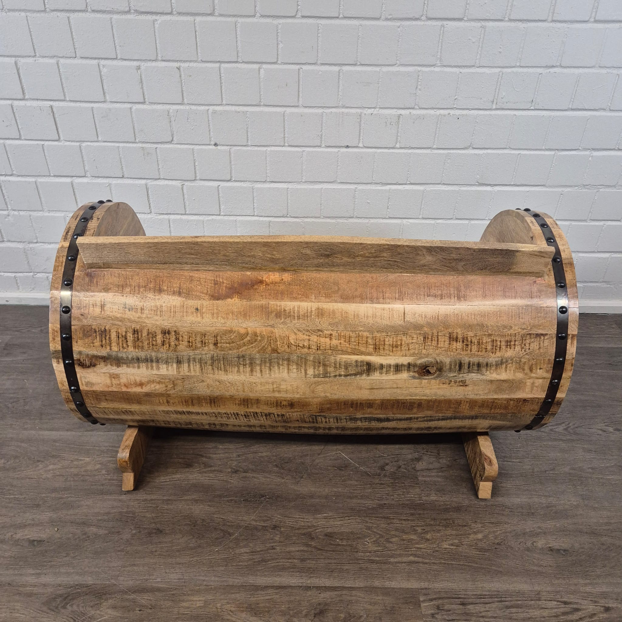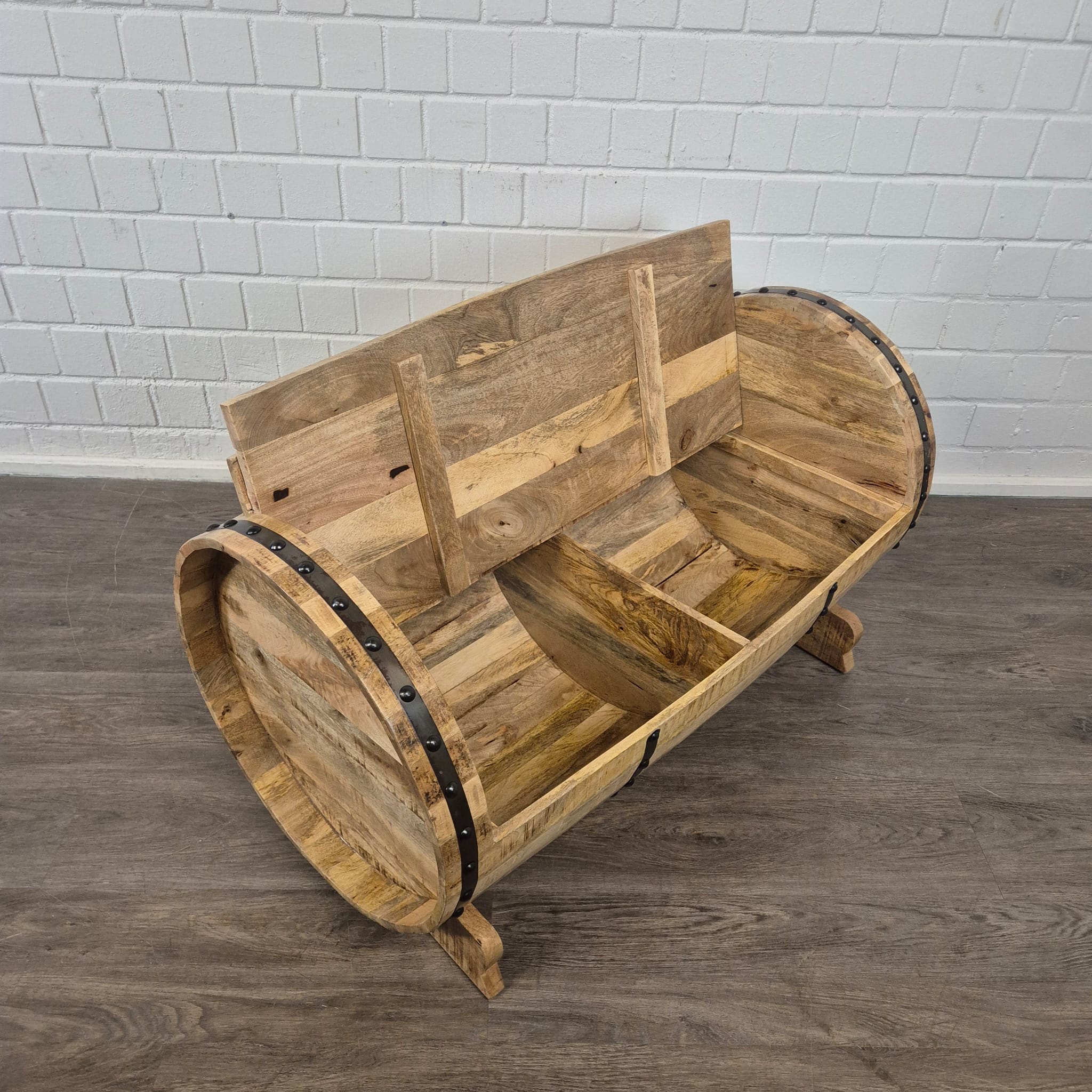 Een uniek stuk, geboren uit traditie en vakmanschap: Exclusieve bank van massief mangohout, gemaakt van een houten vat.