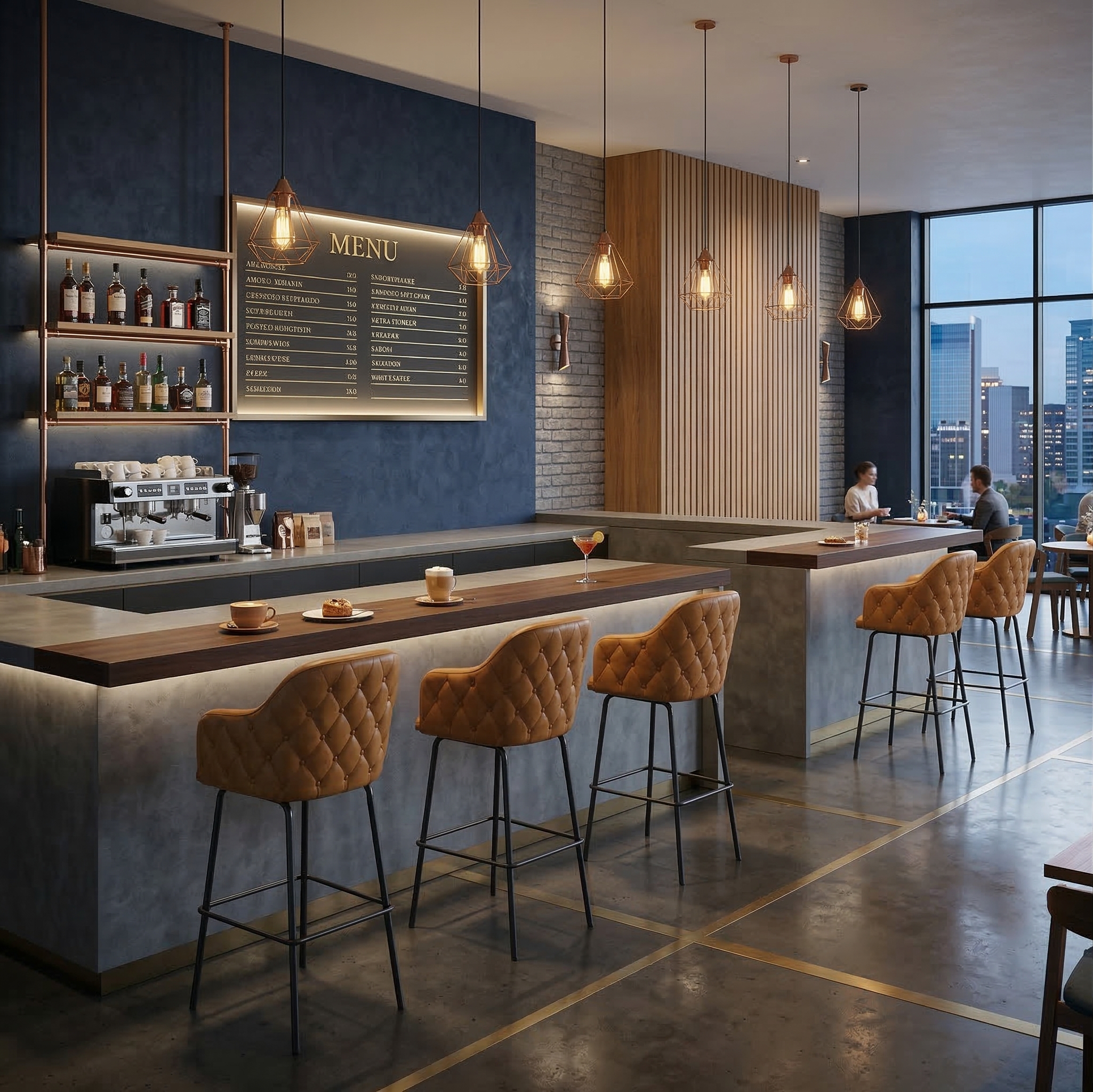 Moderne barkruk met lederen bekleding en metalen onderstel. Prijs per stuk.