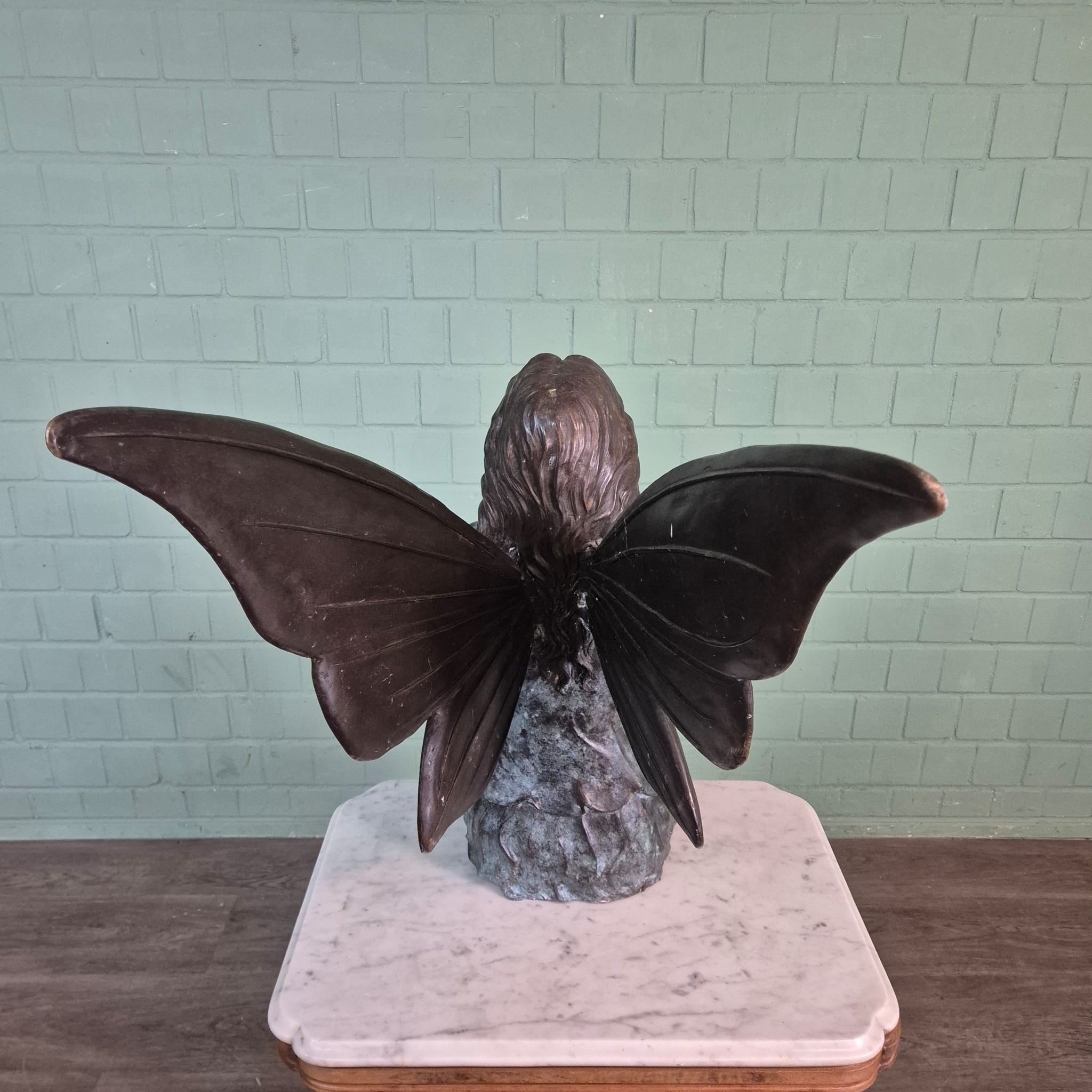 Dit prachtige bronzen beeldje legt de tijdloze schoonheid en gratie van een mythisch wezen vast. De zittende fee, rijk gedetailleerd en uitgerust met grote, elegante vleugels, straalt een dromerige maar majestueuze sereniteit uit.