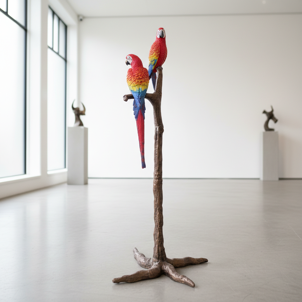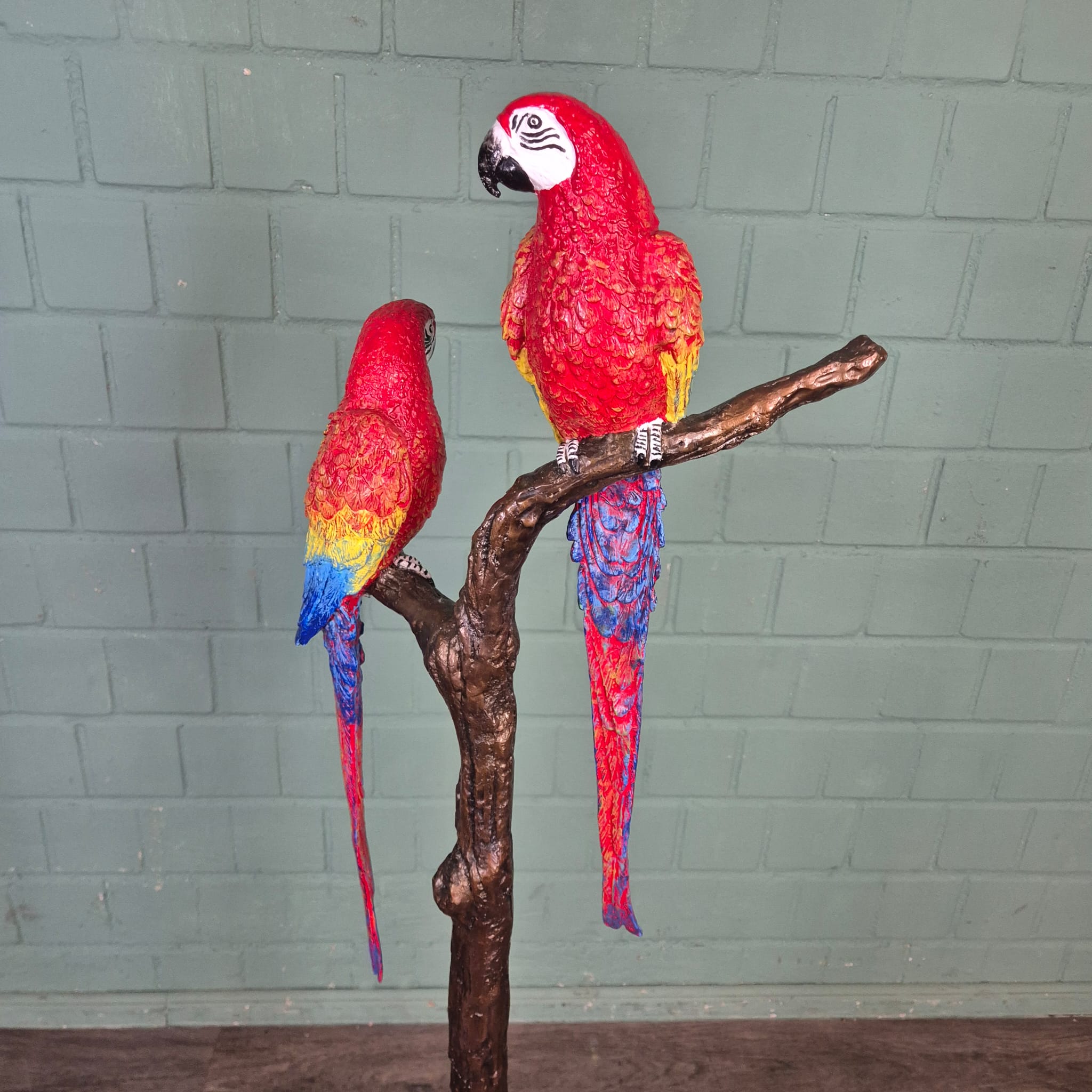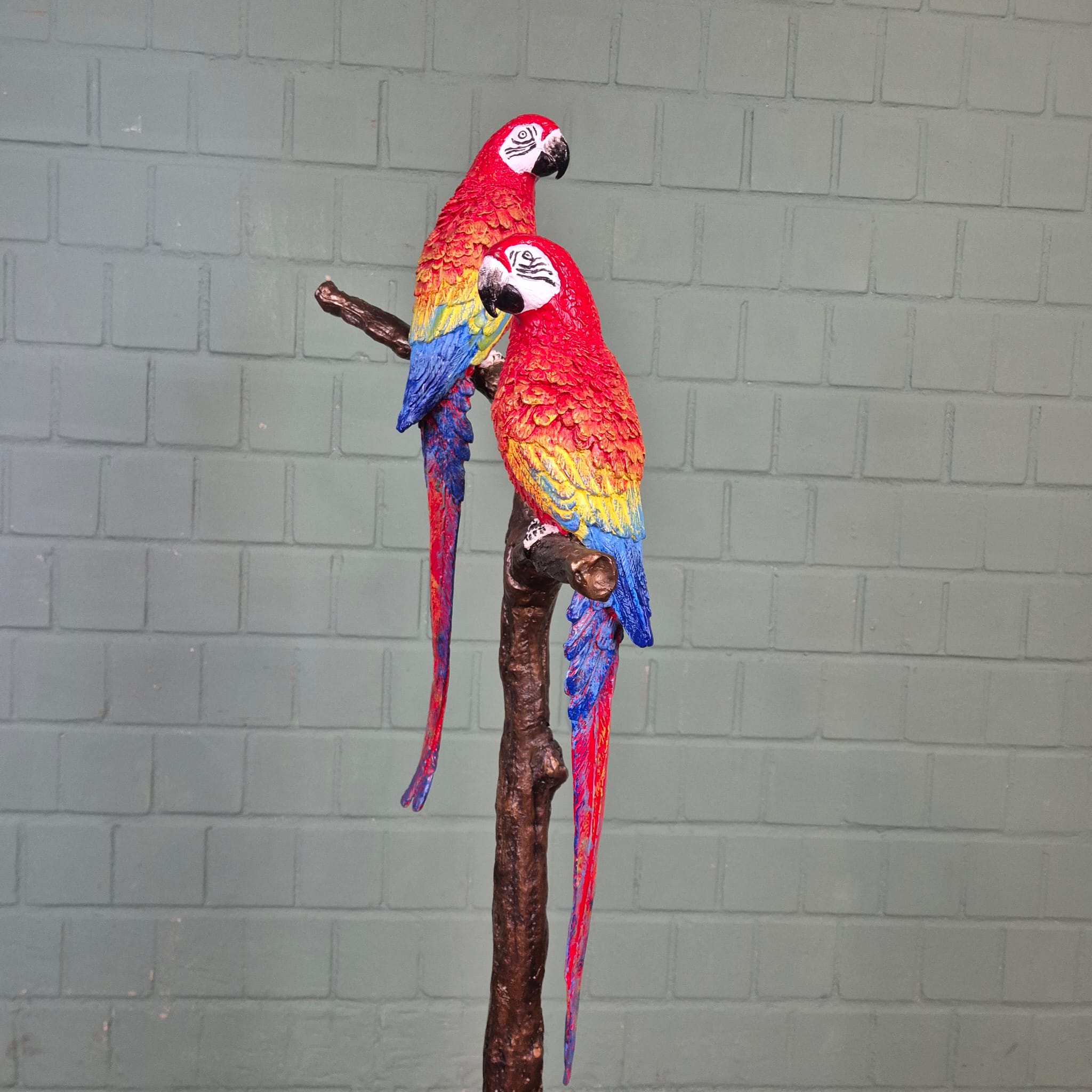 Dit spectaculaire bronzen beeld toont twee levendig gekleurde ara's, gezeten op een levensechte tak. De gedetailleerde uitvoering en levendige kleuren maken dit kunstwerk een ware blikvanger.