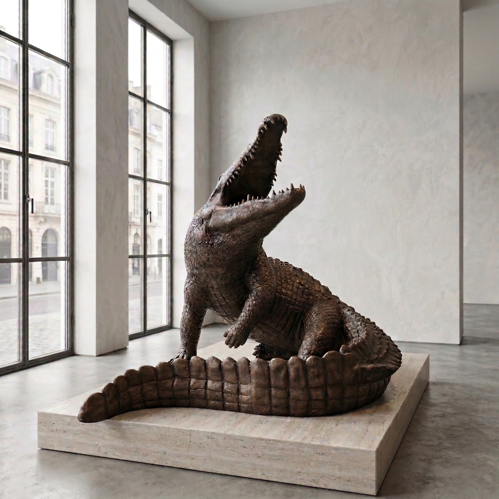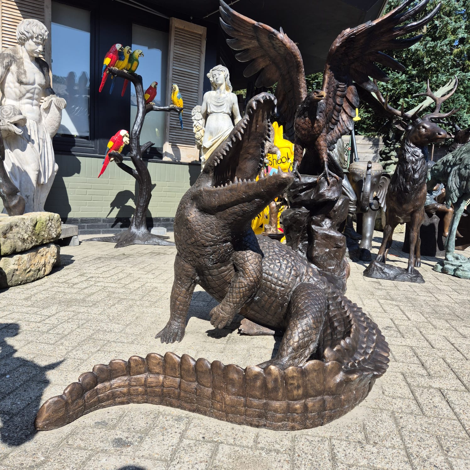 Bronzen beeld van een krokodil.
