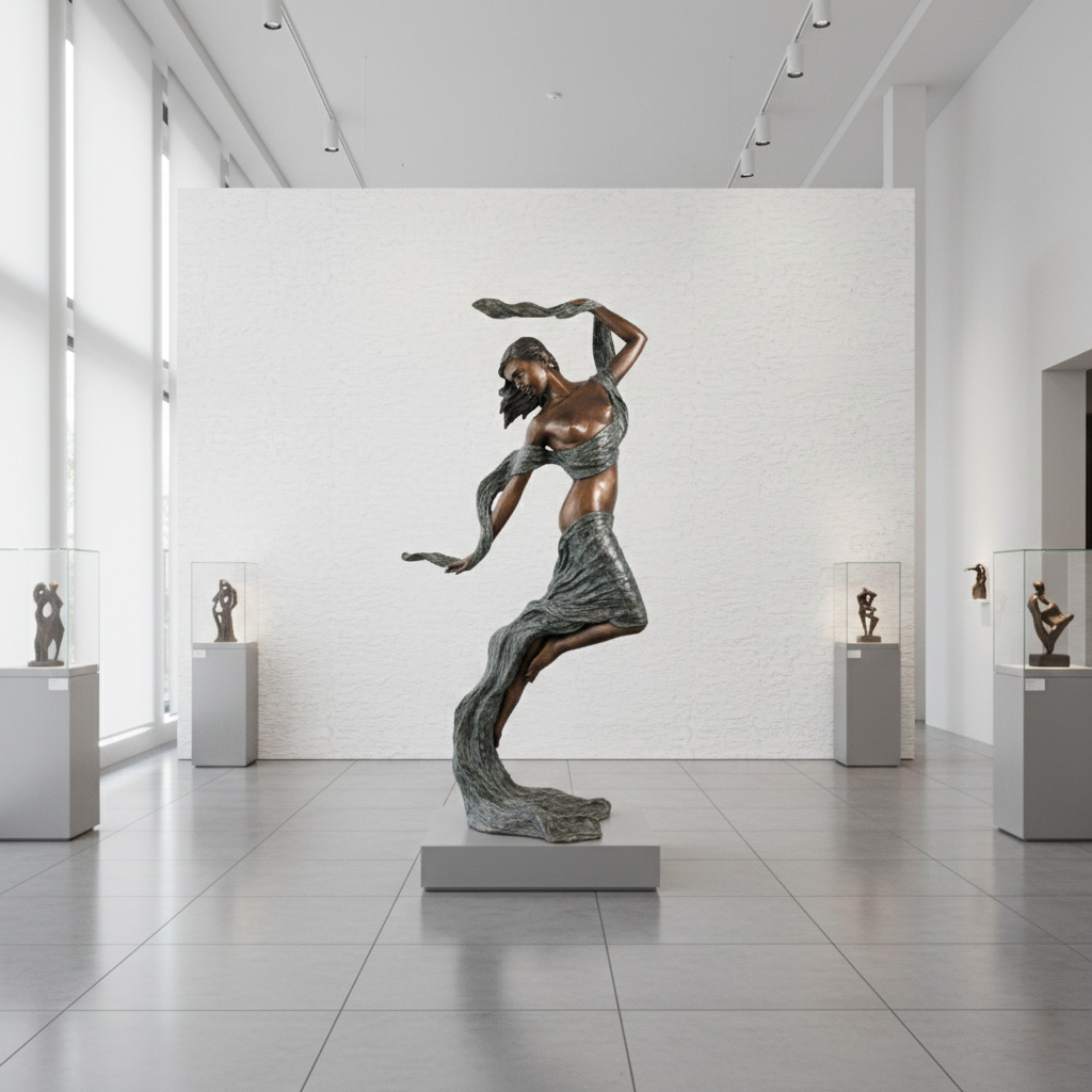 Materiaal & Kwaliteit: Hoogwaardig brons met een unieke patina die de textuur van de vloeiende stof en de spierspanning van het beeld indrukwekkend accentueert.