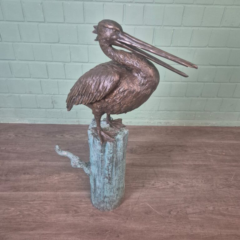 De majestueuze pelikaan is zorgvuldig vervaardigd uit hoogwaardig brons en troont op een levensechte sokkel met een charmante patina. De delicate veren en karakteristieke snavel zijn levensecht.