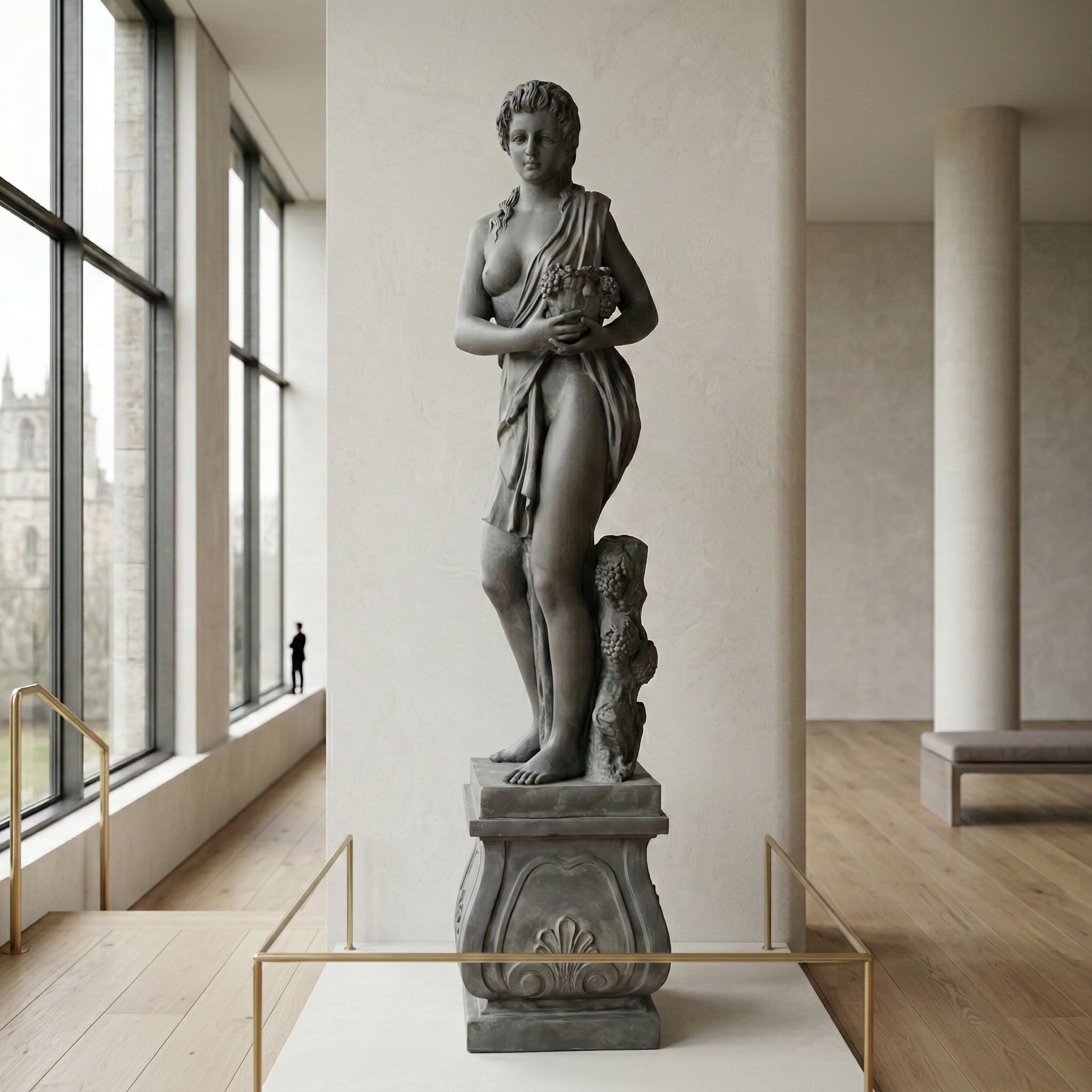Het beeld toont een waardige vrouwenfiguur in een golvend gewaad. In haar handen houdt ze een overvloed aan fruit en bloemen vast, wat mogelijk verwijst naar een allegorie op overvloed, de zomer of een mythologisch figuur. De zachte contouren en de gedetailleerde uitwerking van het gewaad en het haar getuigen van het vakmanschap van de beeldhouwer.