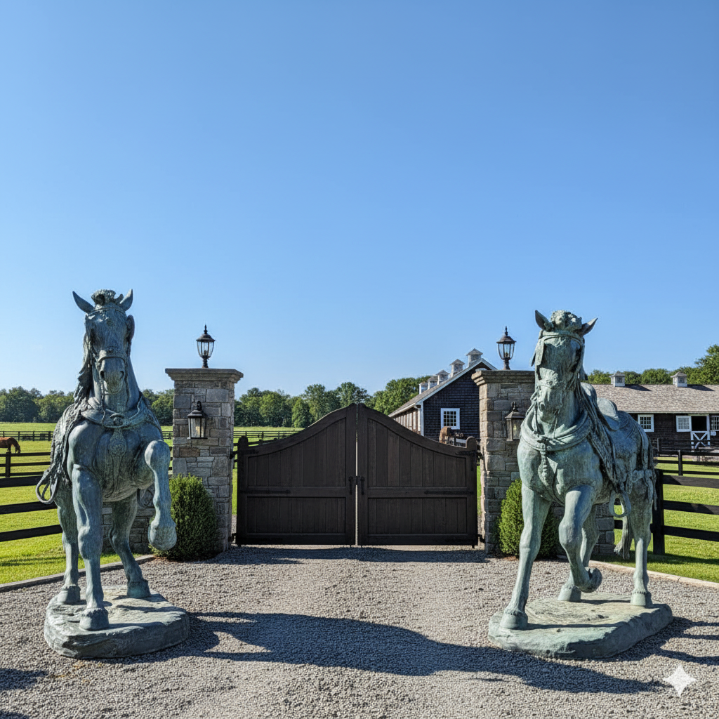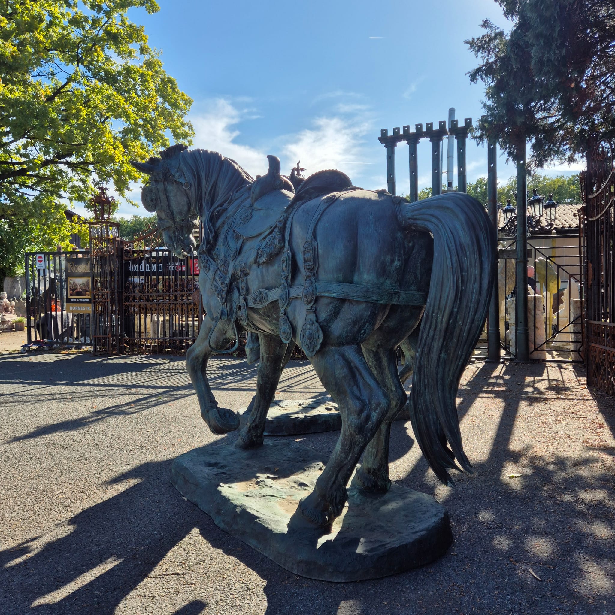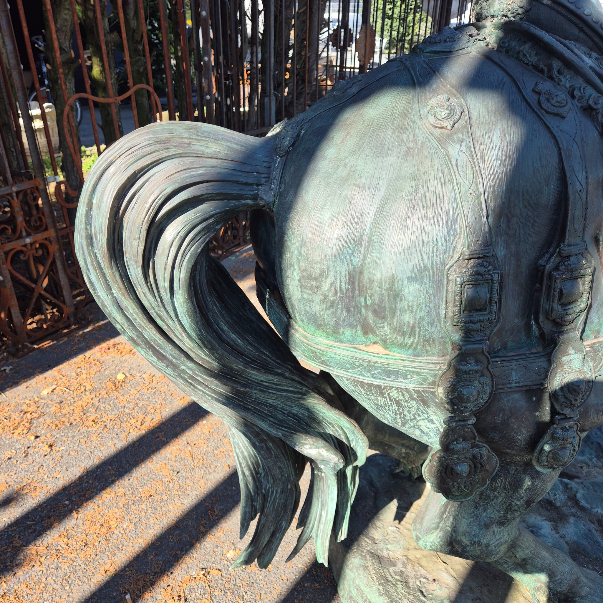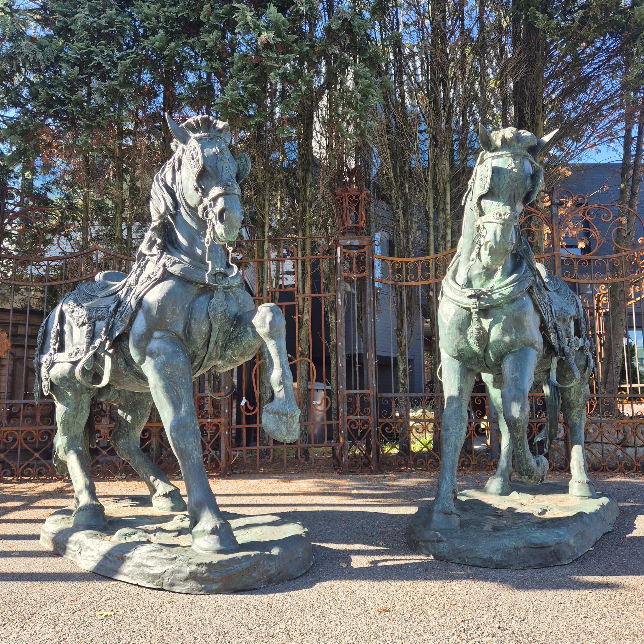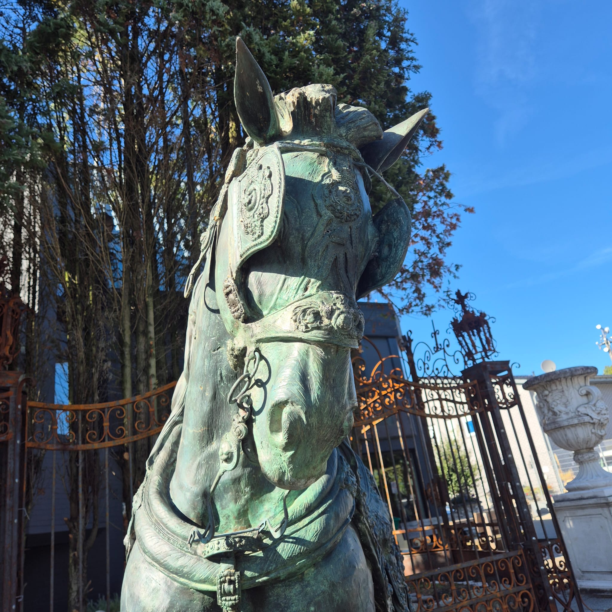Een uitzonderlijk en monumentaal paar levensgrote bronzen beelden van twee prachtige paarden. Deze sculpturen vormen een prachtige blikvanger in buitenruimtes, een ruime entree of een exclusief park.