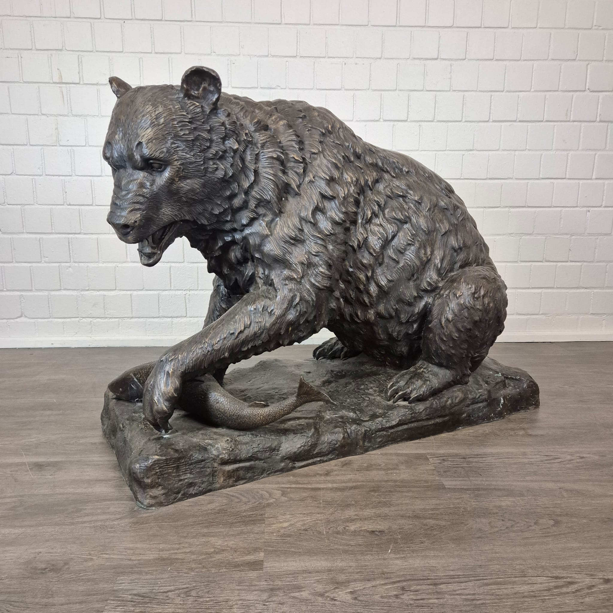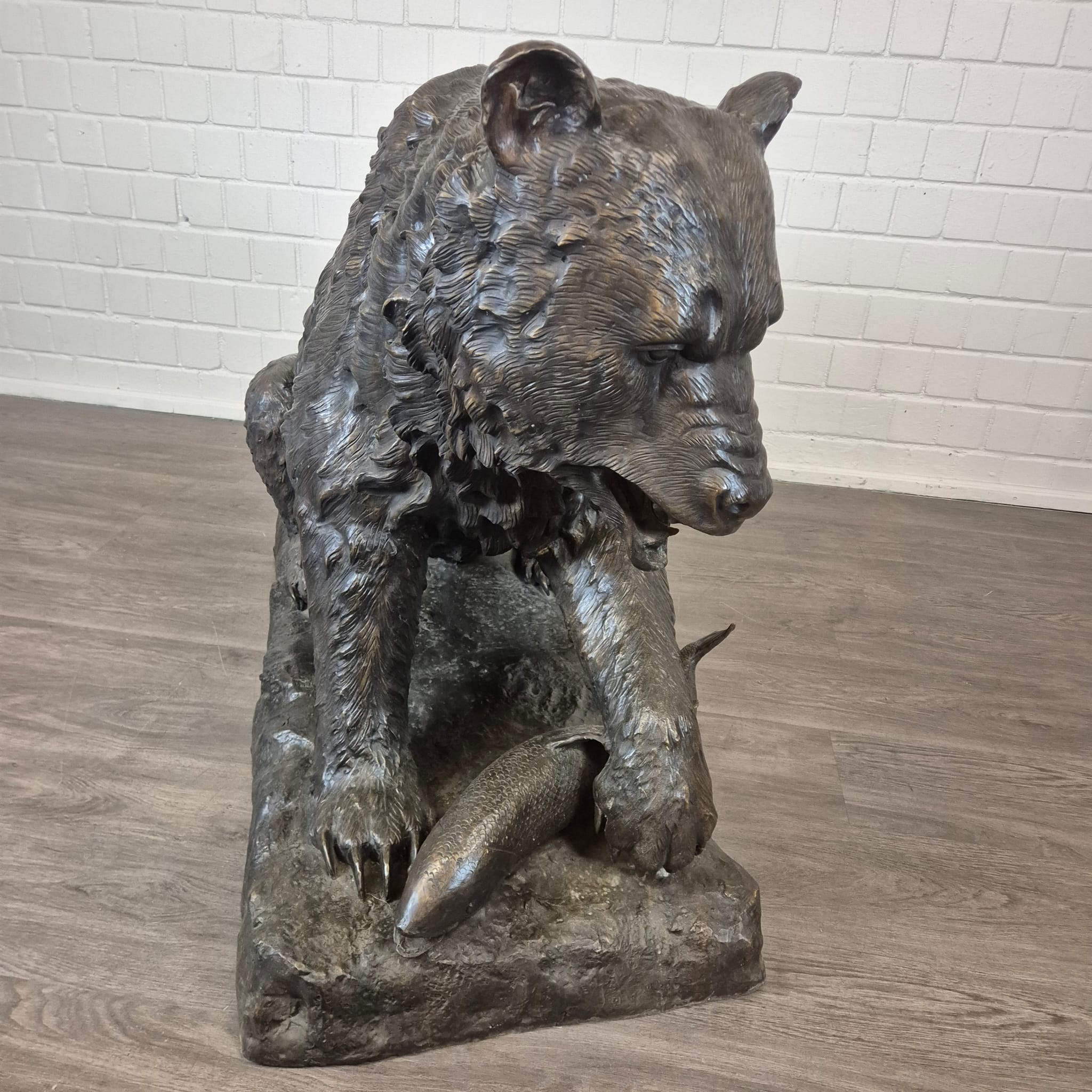 Onderwerp: Een krachtige beer die net een vis heeft gevangen. De scène is geplaatst op een naturalistische rotsachtige sokkel (eveneens van brons).
