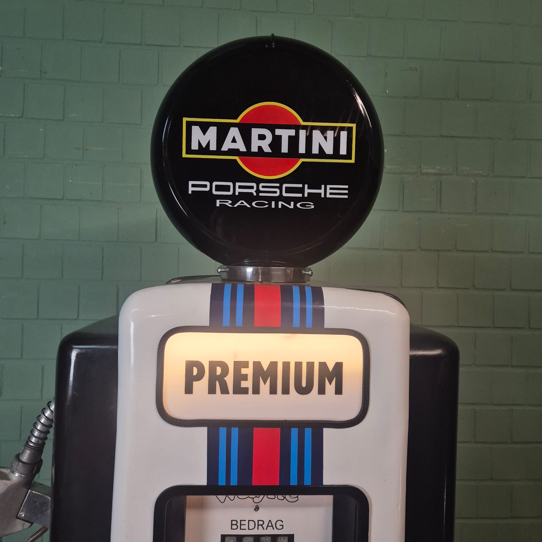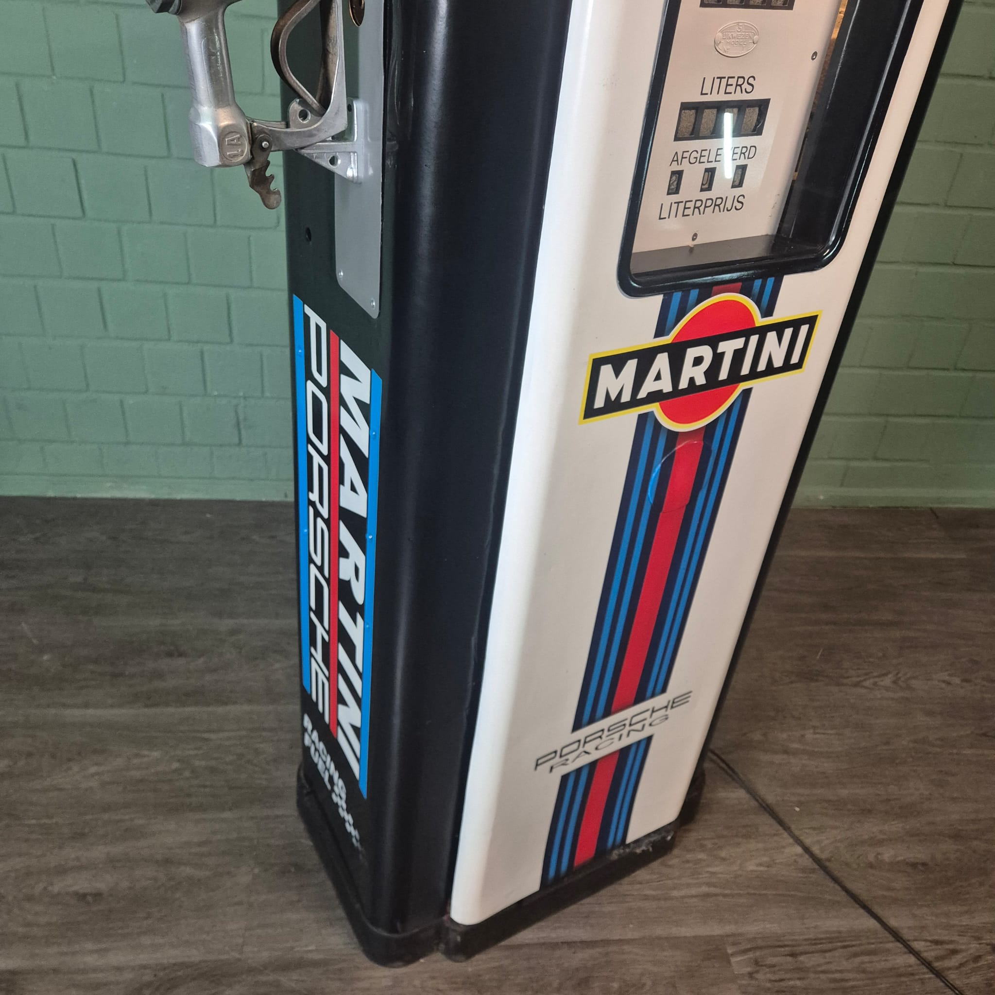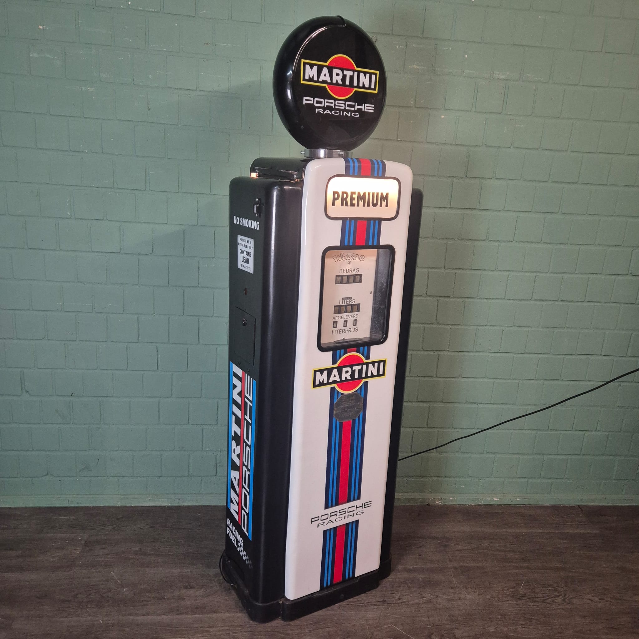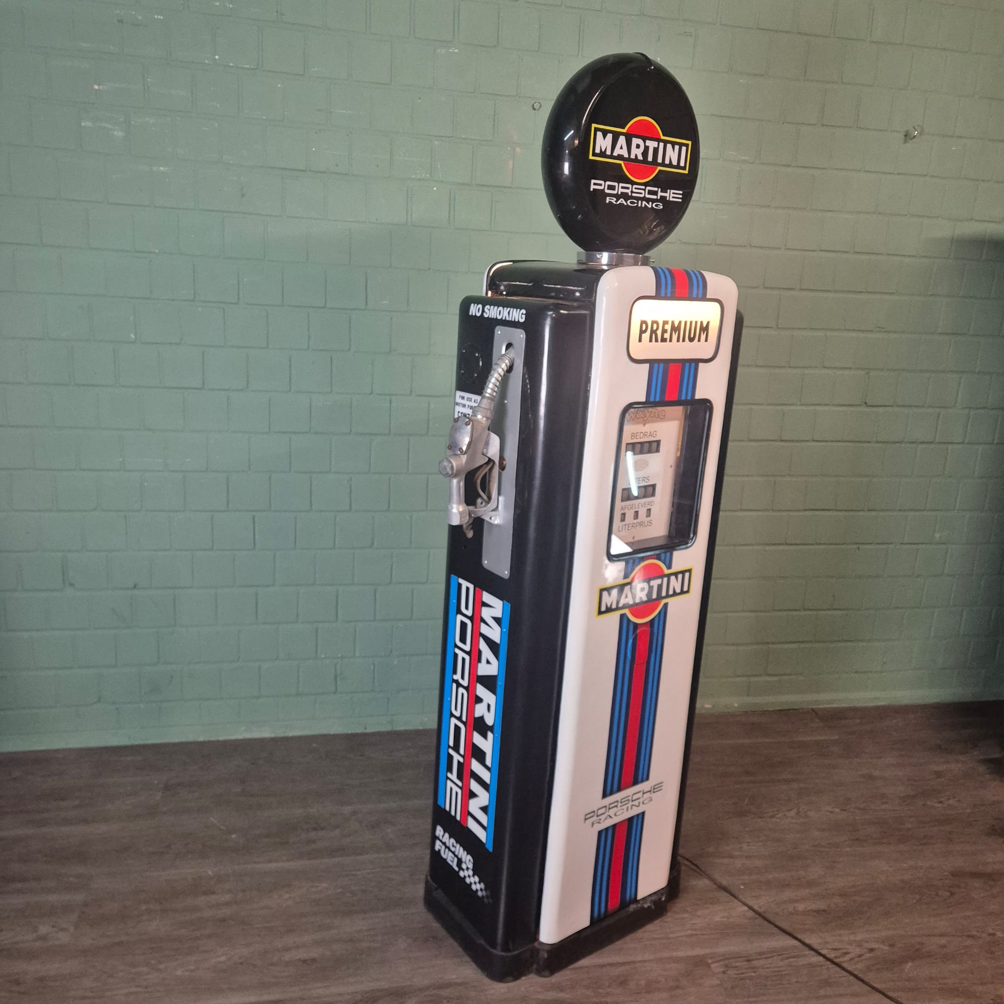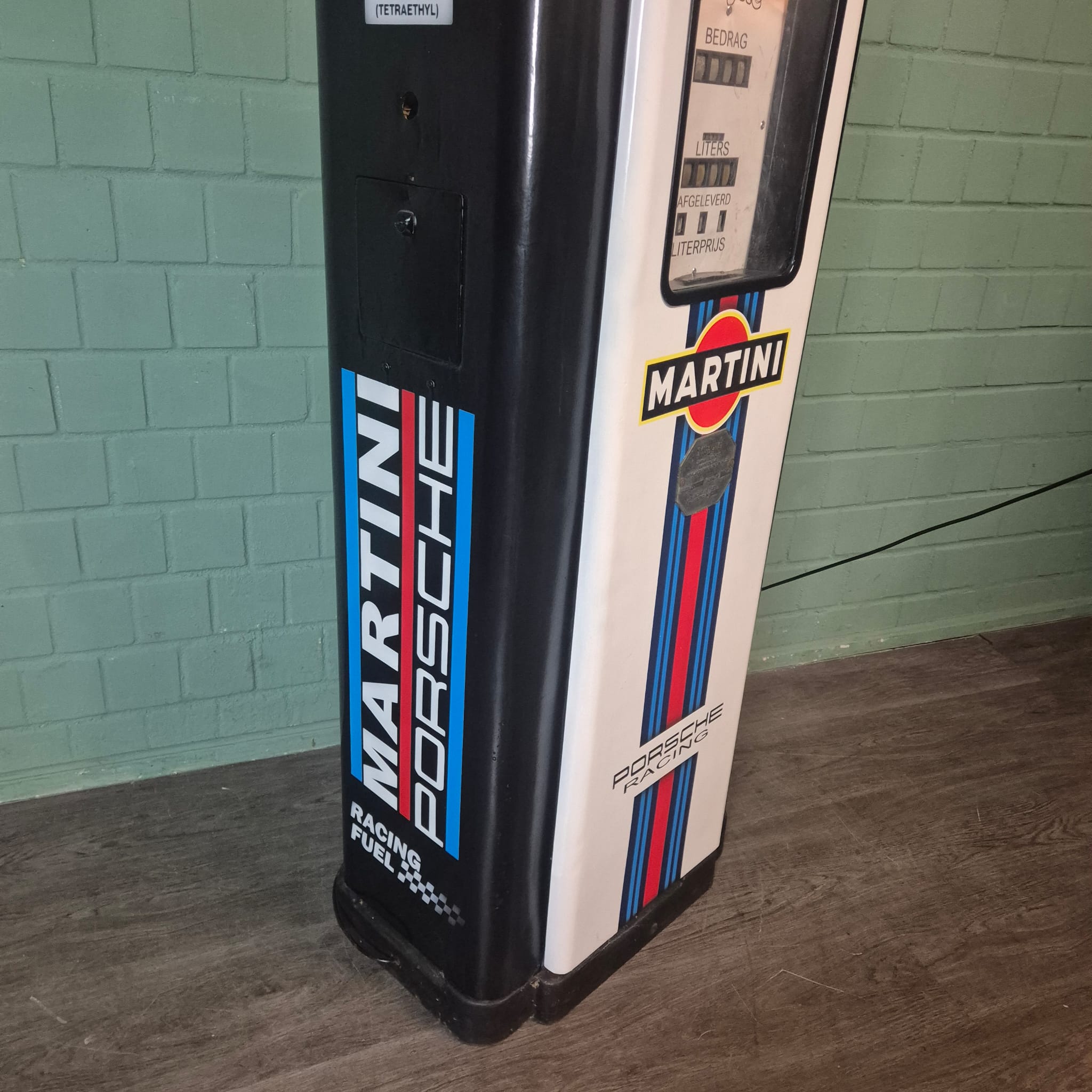 €4.999,00 Excl. btw:Gerestaureerde Wayne benzinepomp uit de jaren 50 in Martini Porsche Racing-livery. De lak is een eerbetoon aan het beroemde Martini Racing-ontwerp met de karakteristieke blauwe, lichtblauwe en rode strepen, nauw verbonden met Porsches autosportsuccessen (met name in de jaren 70 met de Porsche 917). De pomp werd oorspronkelijk in Nederland en/of voor de Nederlandse markt gebruikt.