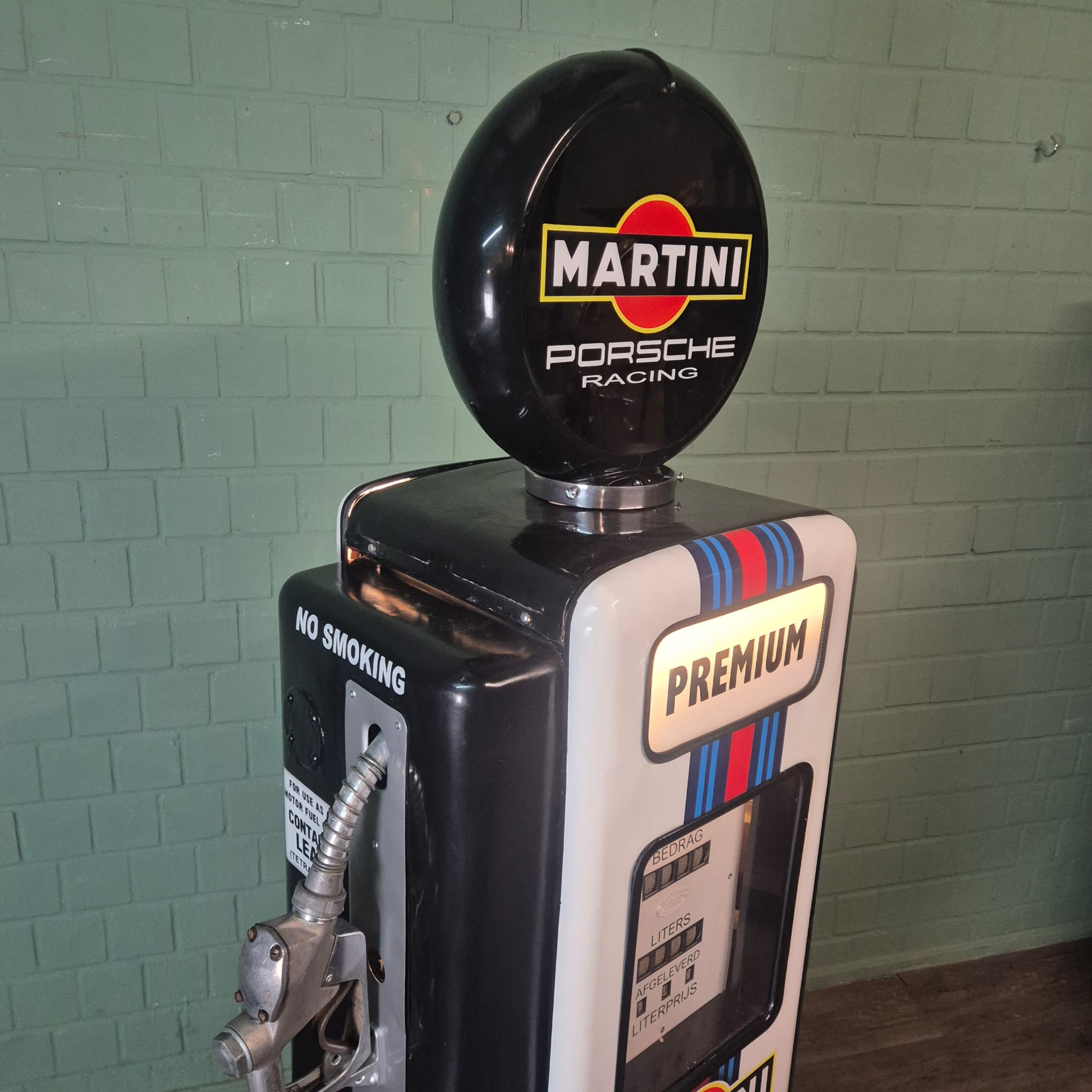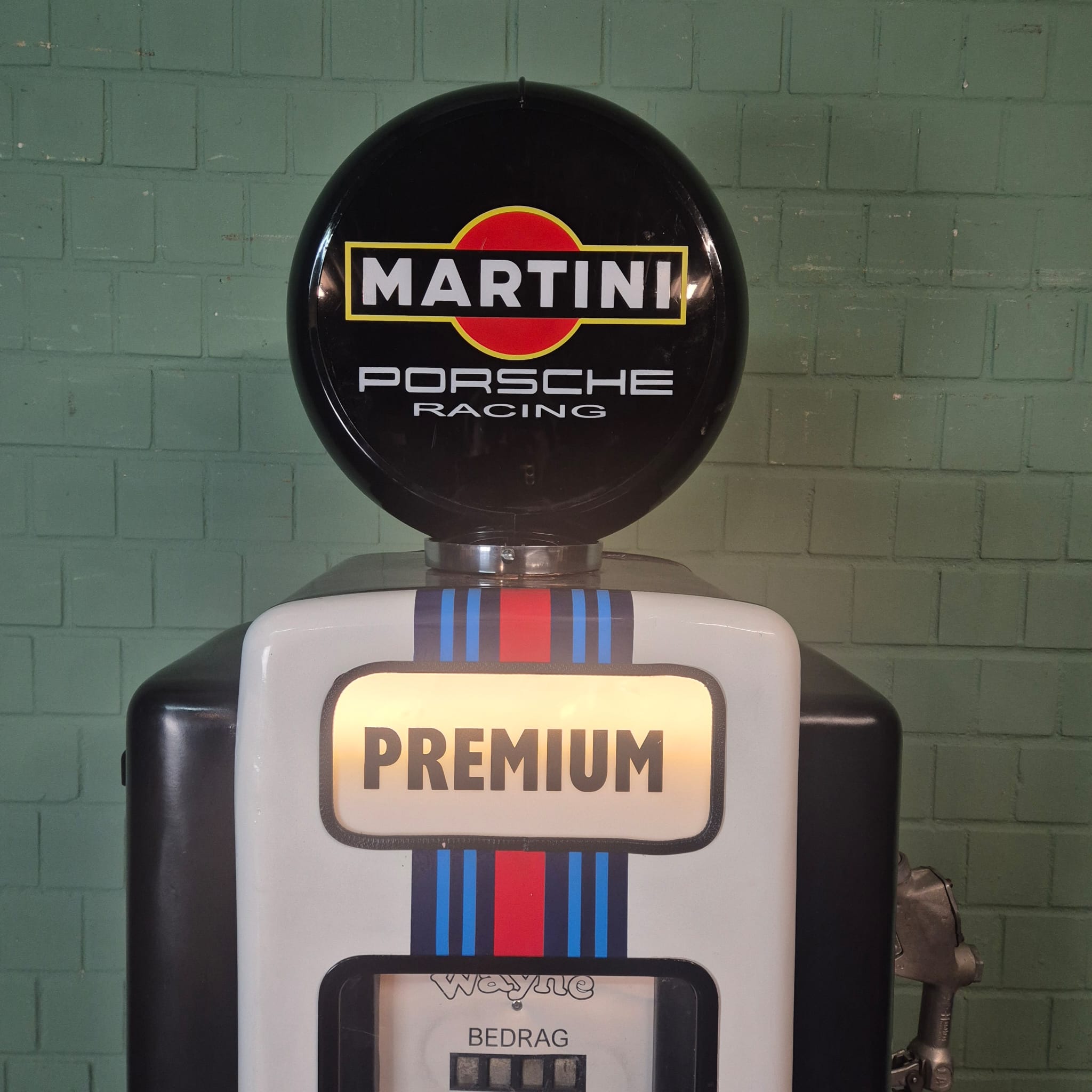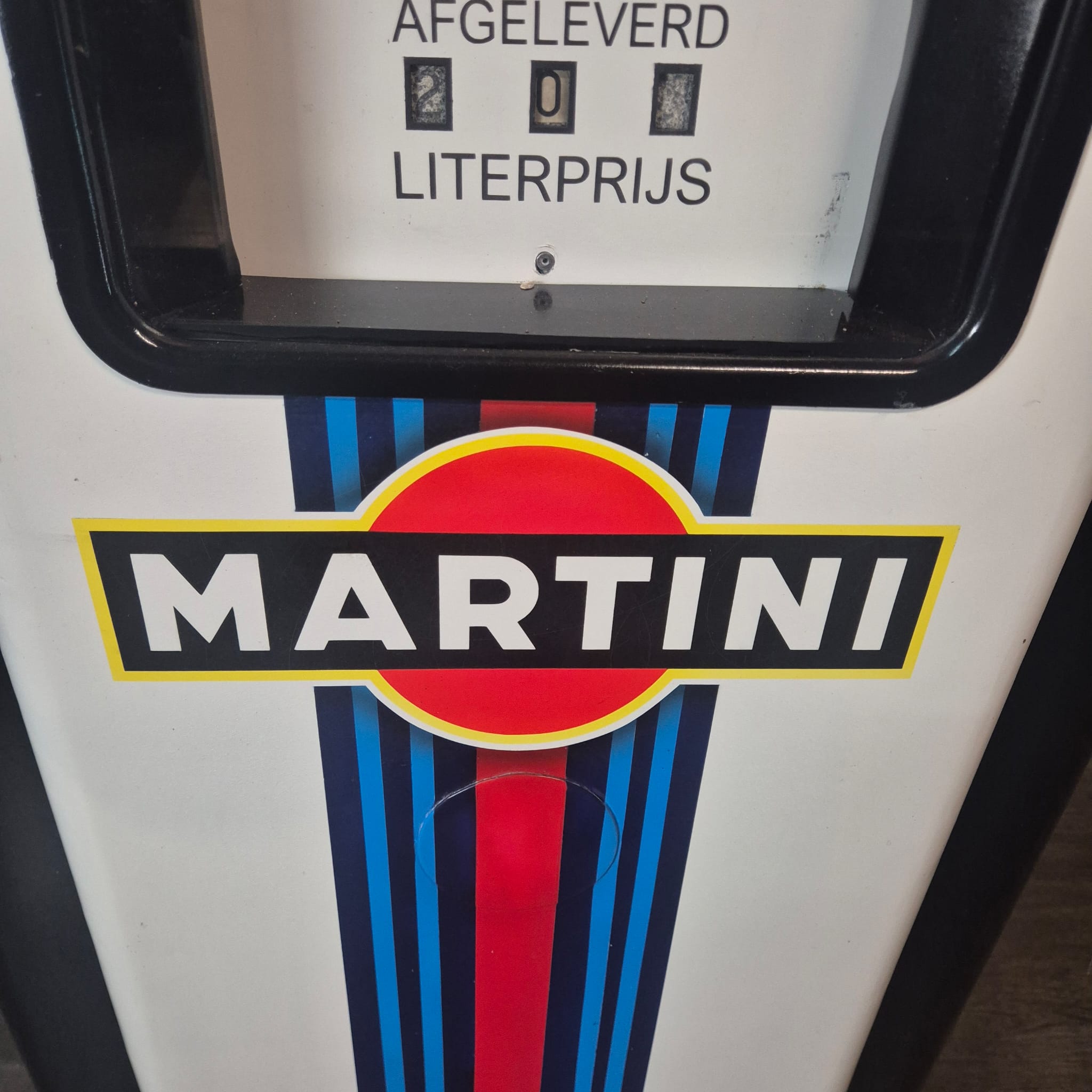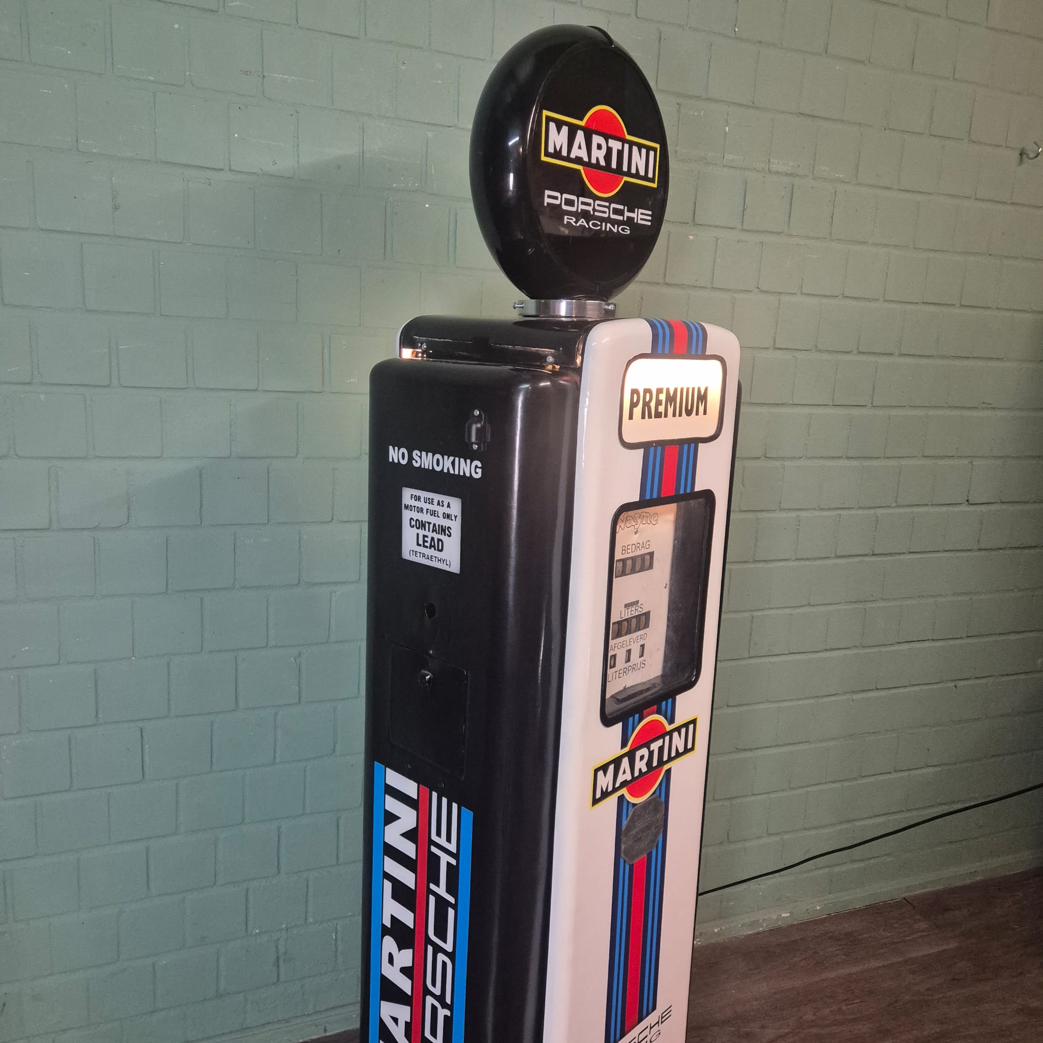 €4.999,00 Excl. btw:Gerestaureerde Wayne benzinepomp uit de jaren 50 in Martini Porsche Racing-livery. De lak is een eerbetoon aan het beroemde Martini Racing-ontwerp met de karakteristieke blauwe, lichtblauwe en rode strepen, nauw verbonden met Porsches autosportsuccessen (met name in de jaren 70 met de Porsche 917). De pomp werd oorspronkelijk in Nederland en/of voor de Nederlandse markt gebruikt.