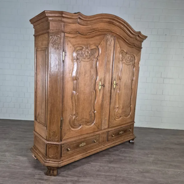 Gerestaureerde Bergischer Barok kledingkast gemaakt van massief eiken (gewaxt) uit ca. 1780. De kast is in een zeer goede staat en heeft minimale gebruikssporen. Demontabel (8-delig).