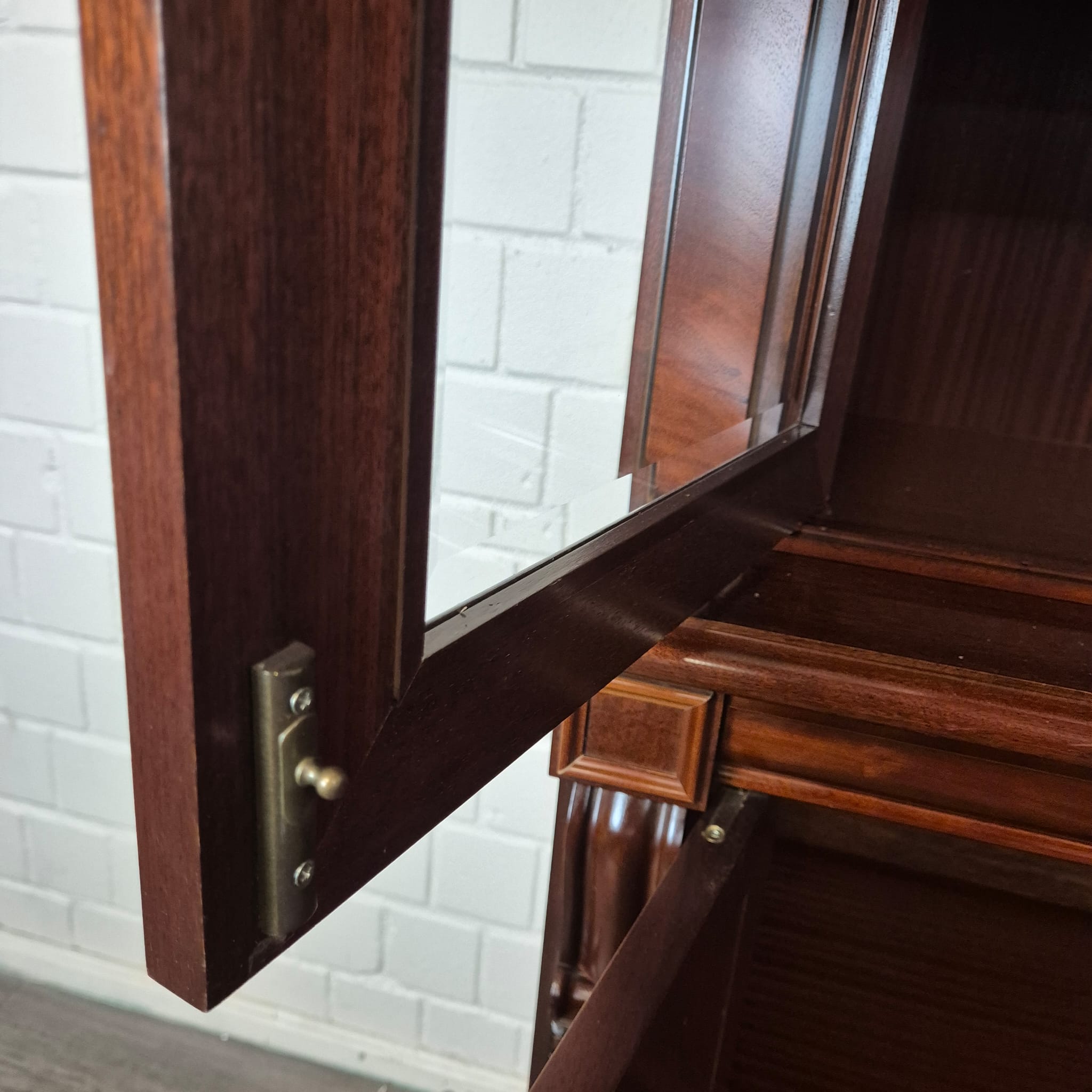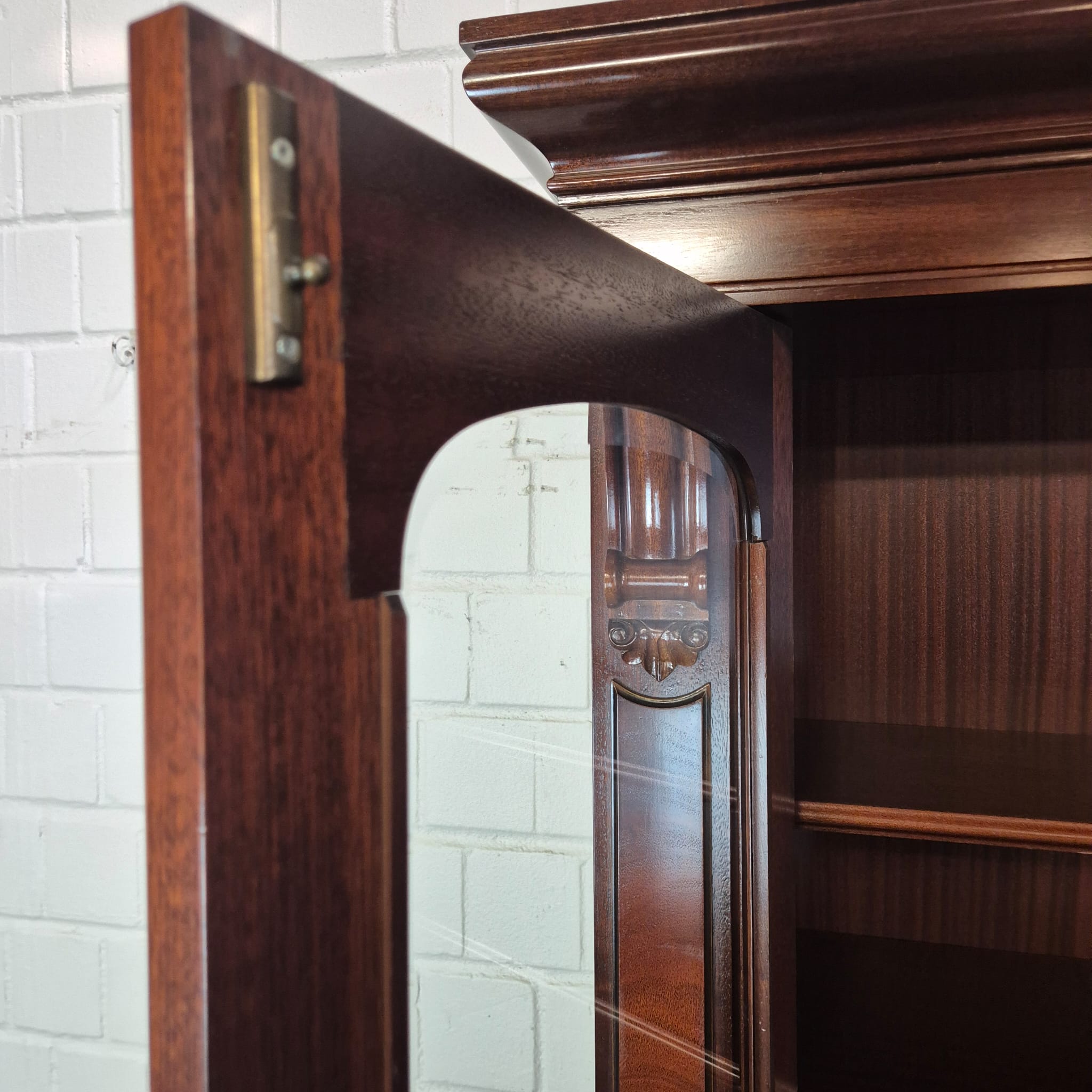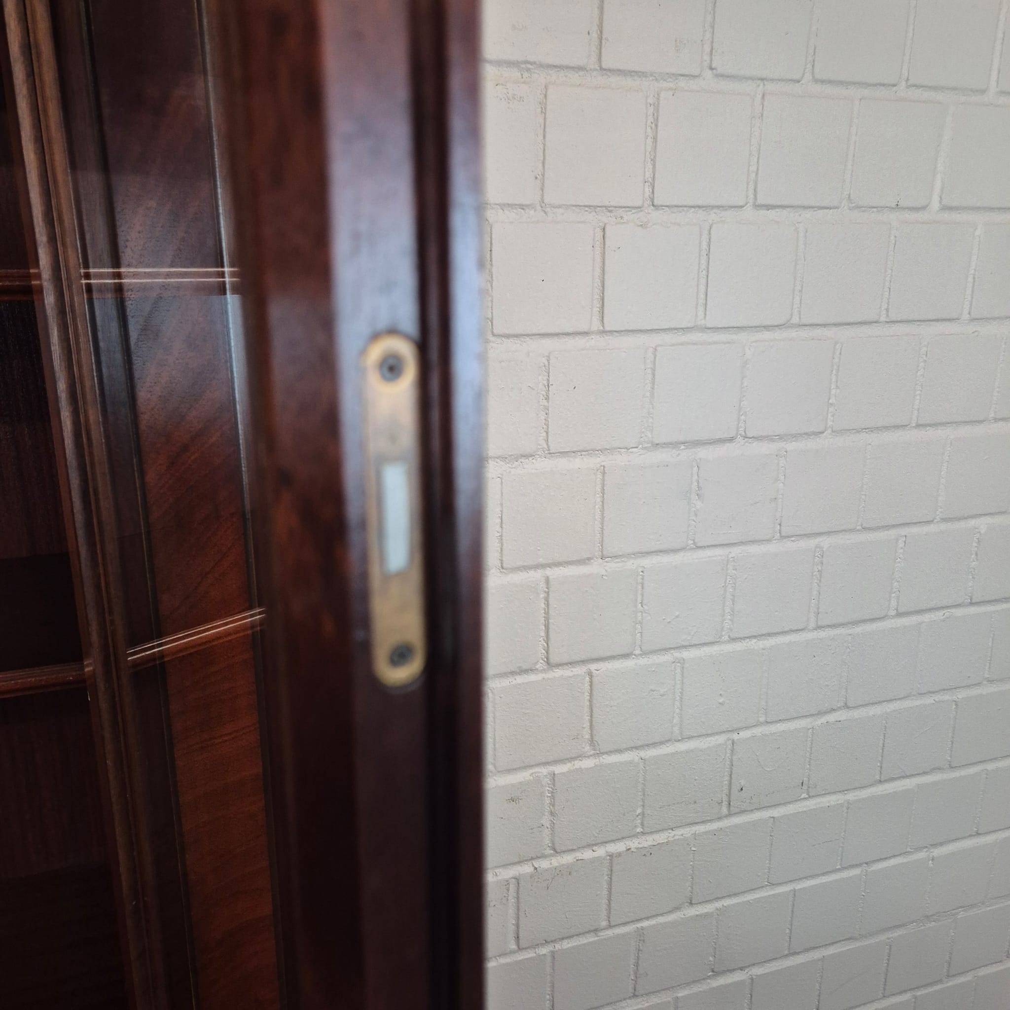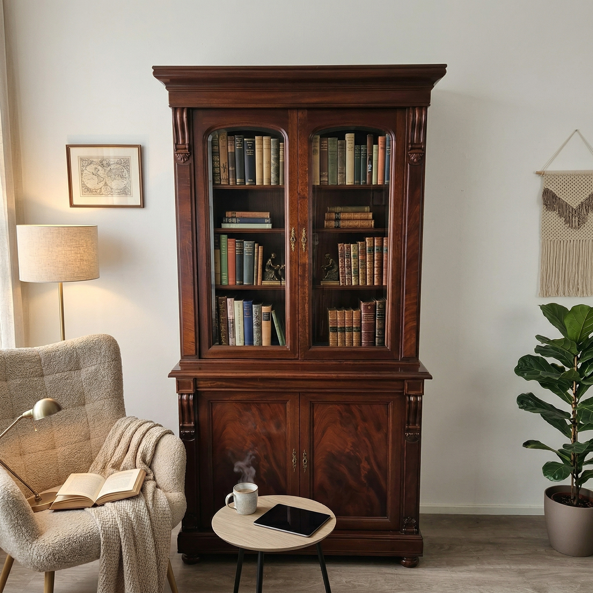 Neo-barok boekenkast mahonie gefineerd en deels massief. De boekenkast is in een goede staat en heeft lichte gebruikssporen. Demontabel (2-delig).