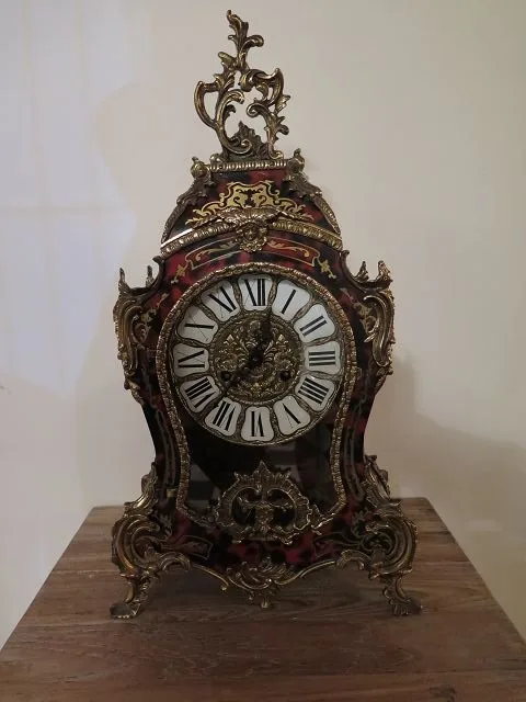 In originele staat staande Boulle tafelklok gemaakt omstreeks 1920. De klok is gemaakt van messing en koper, verkeert in een goede staat en heeft slechts lichte gebruikssporen.