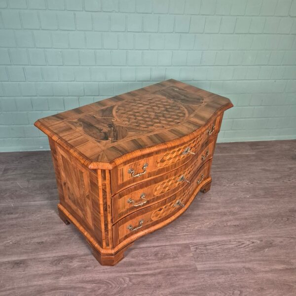 De originele commode die we hebben bekeken, gemaakt van notenhout en wortelnotenhout gefineerd op naaldhout, met rijke bandinlegsels van essen- en esdoornhout, en een ingelegd notenhouten kubuspatroon in het bovenblad en de laden, met drie laden en een veelbolle displayzijde, is een originele barok commode uit Braunschweig rond 1755. De huidige marktwaarde is DM 44.000. Bovenstaande informatie is volledig gegarandeerd.