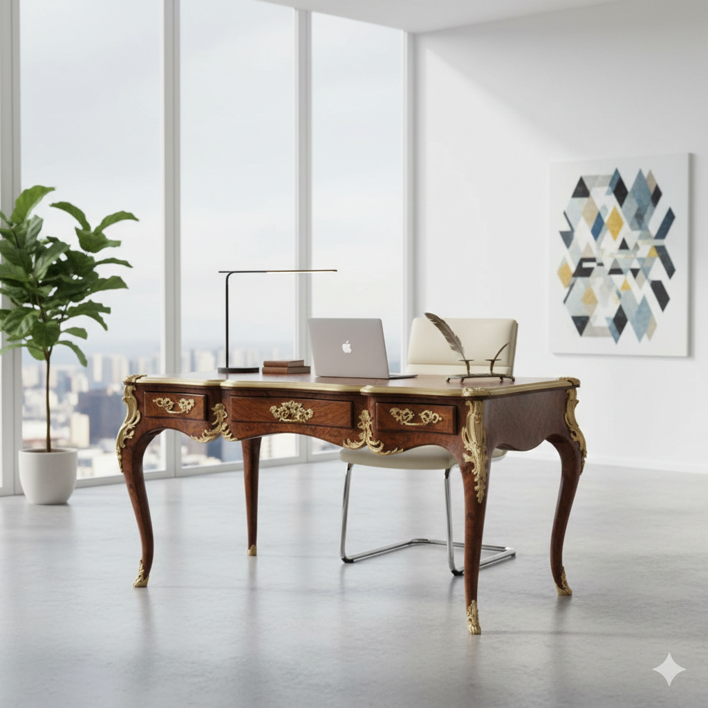 Dit bureau is niet alleen een functioneel meubelstuk, maar ook een indrukwekkend decoratief element dat een elegante en historische toets aan elke studeer- of woonkamer geeft.