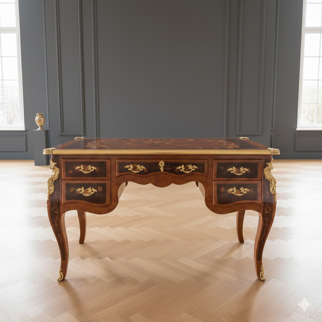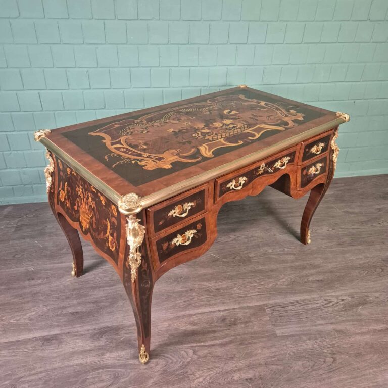 Een elegant bureau in barokstijl met notenhout- en palissanderfineer. Bloemig bronzen beslag vormt een visuele aanvulling op het rijkelijk ingelegde tafelblad.