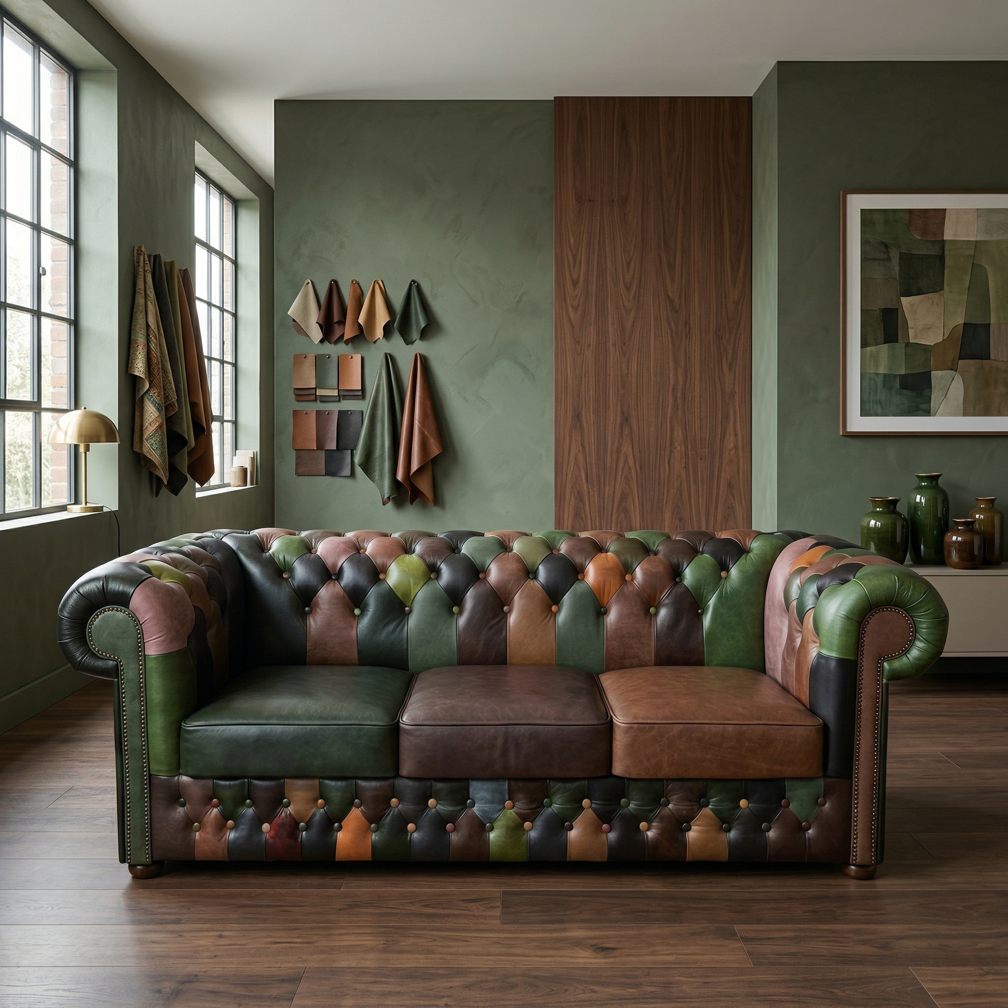 De combinatie van leerstukken in diverse warme natuurlijke tinten zoals groen, bruin, zwart en cognacrood geeft de bank een levendige maar harmonieuze uitstraling. Typische Chesterfield-kenmerken, zoals de elegante, afgeronde armleuningen en de klassieke ruitvormige stiksels met diep ingezette knopen, zijn stijlvol verwerkt.