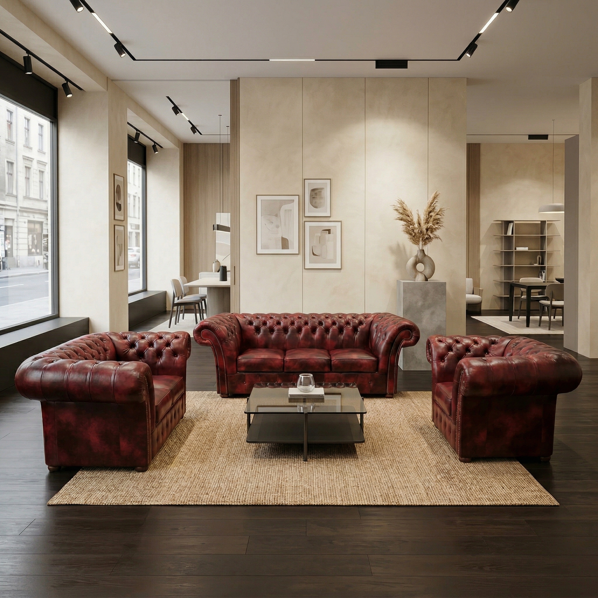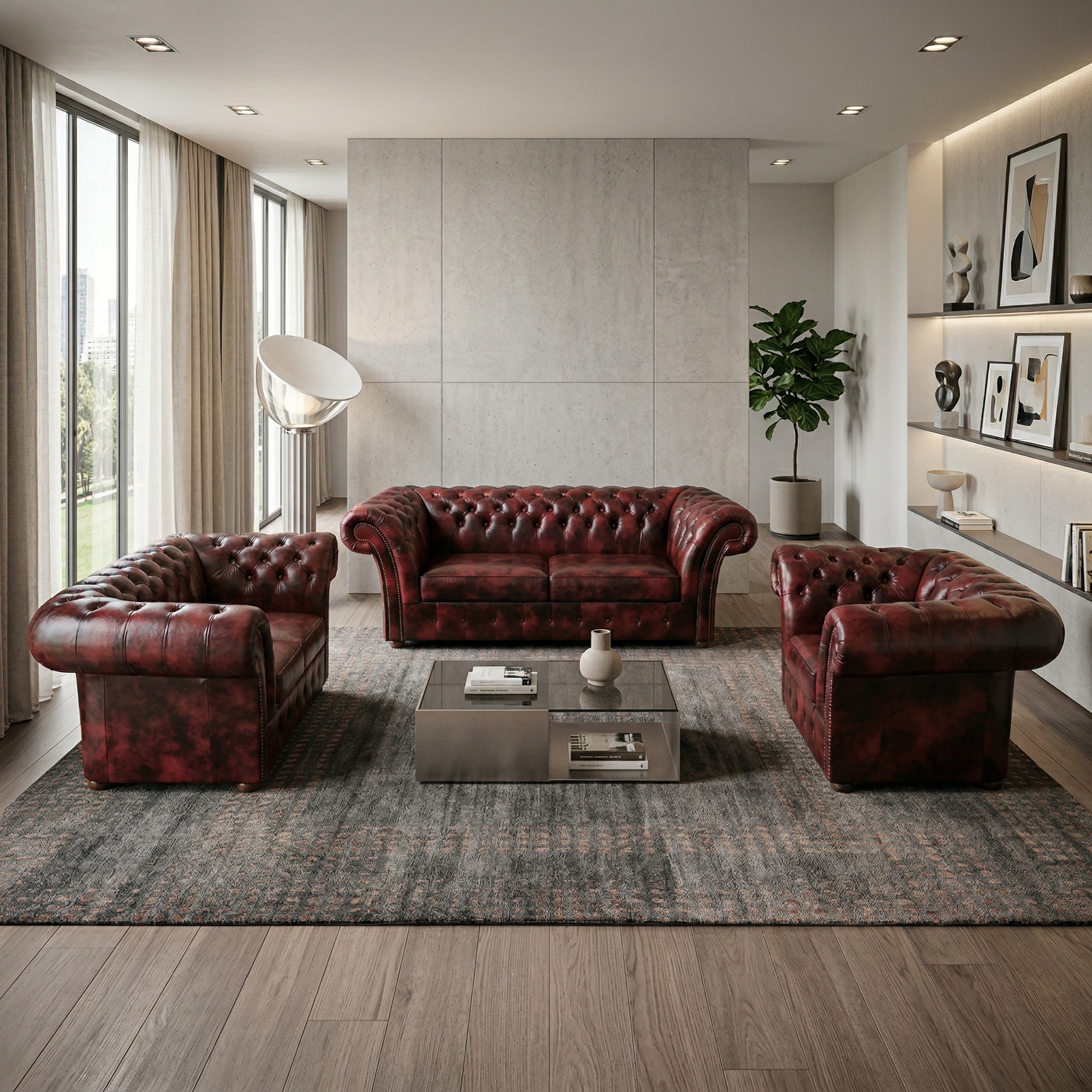 Chesterfield Bankstel Donkerrood-Zwart 3-2-1 Leder