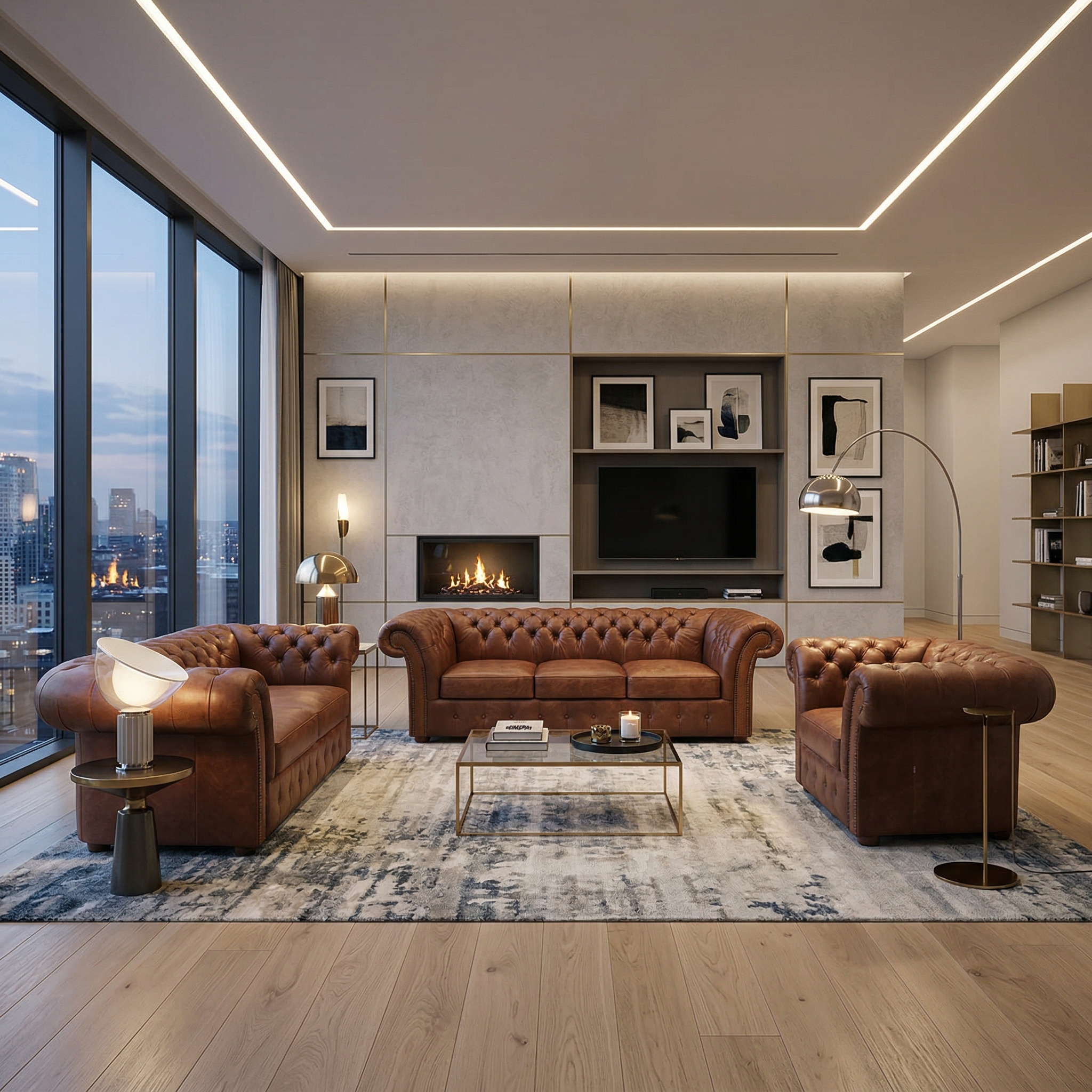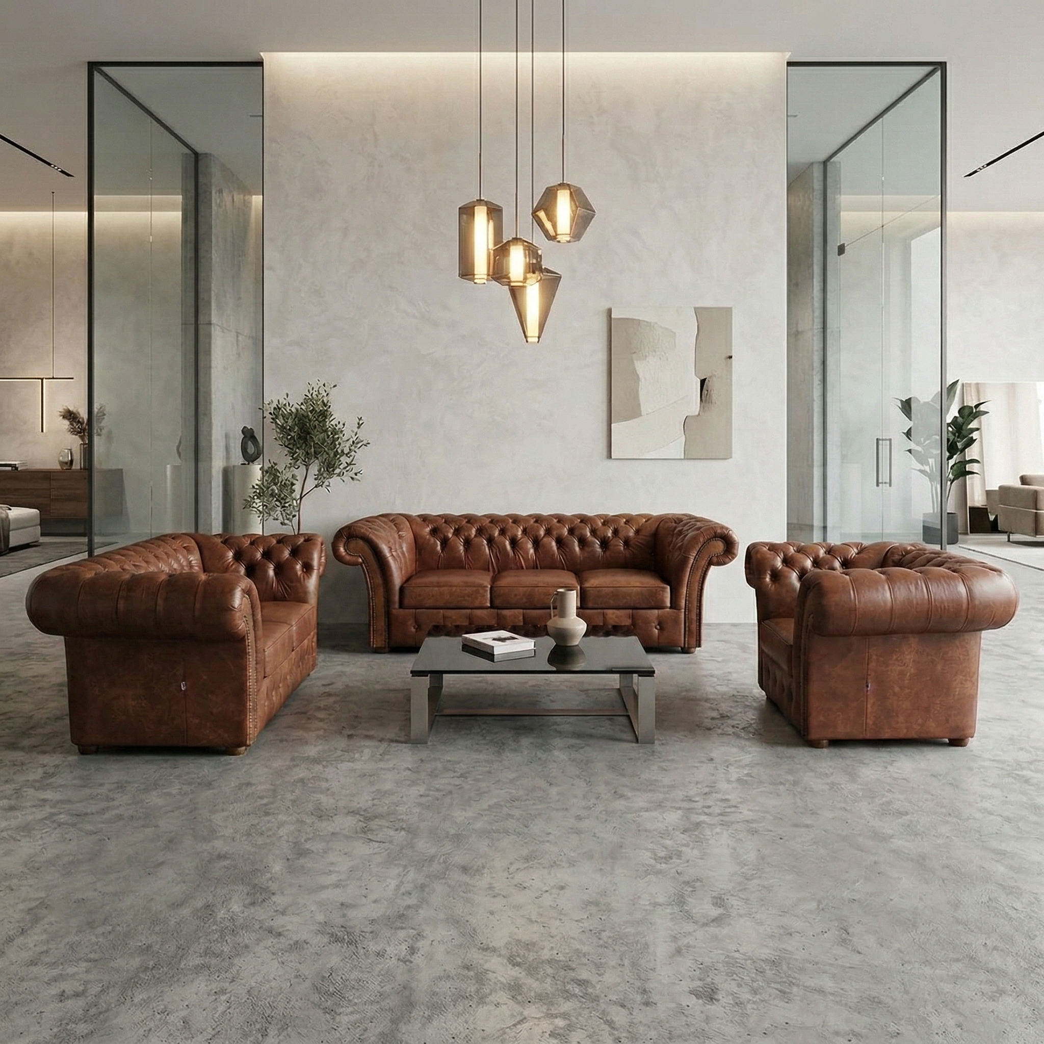 Chesterfield Bankstel Leder Antiekbruin 3-2-1
