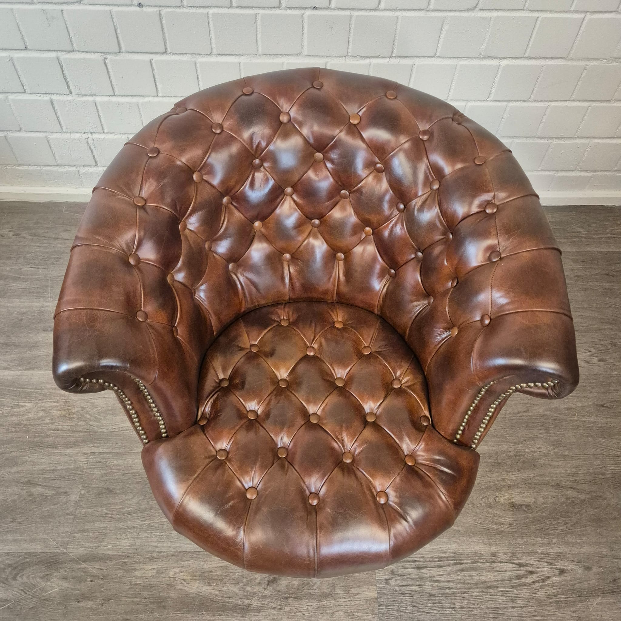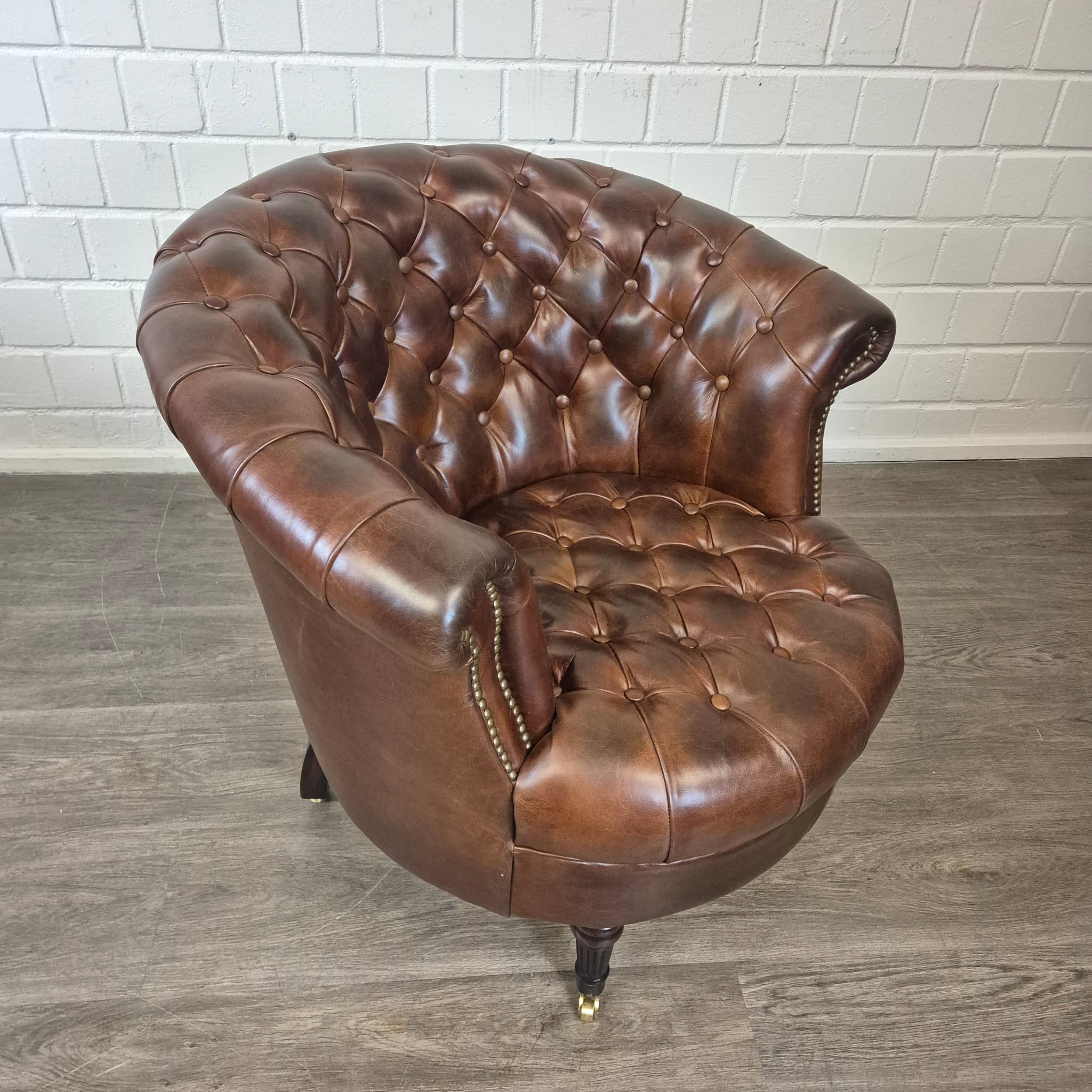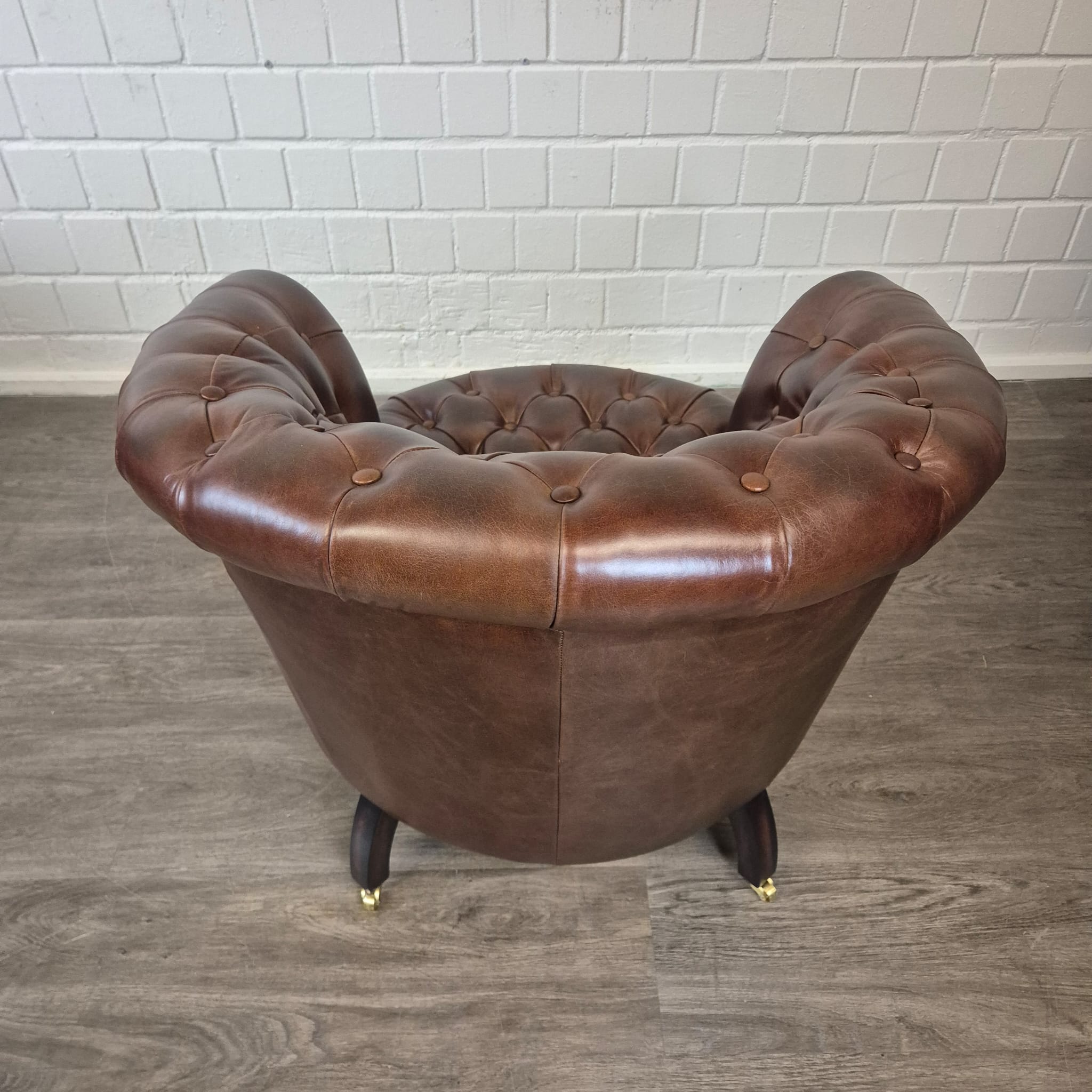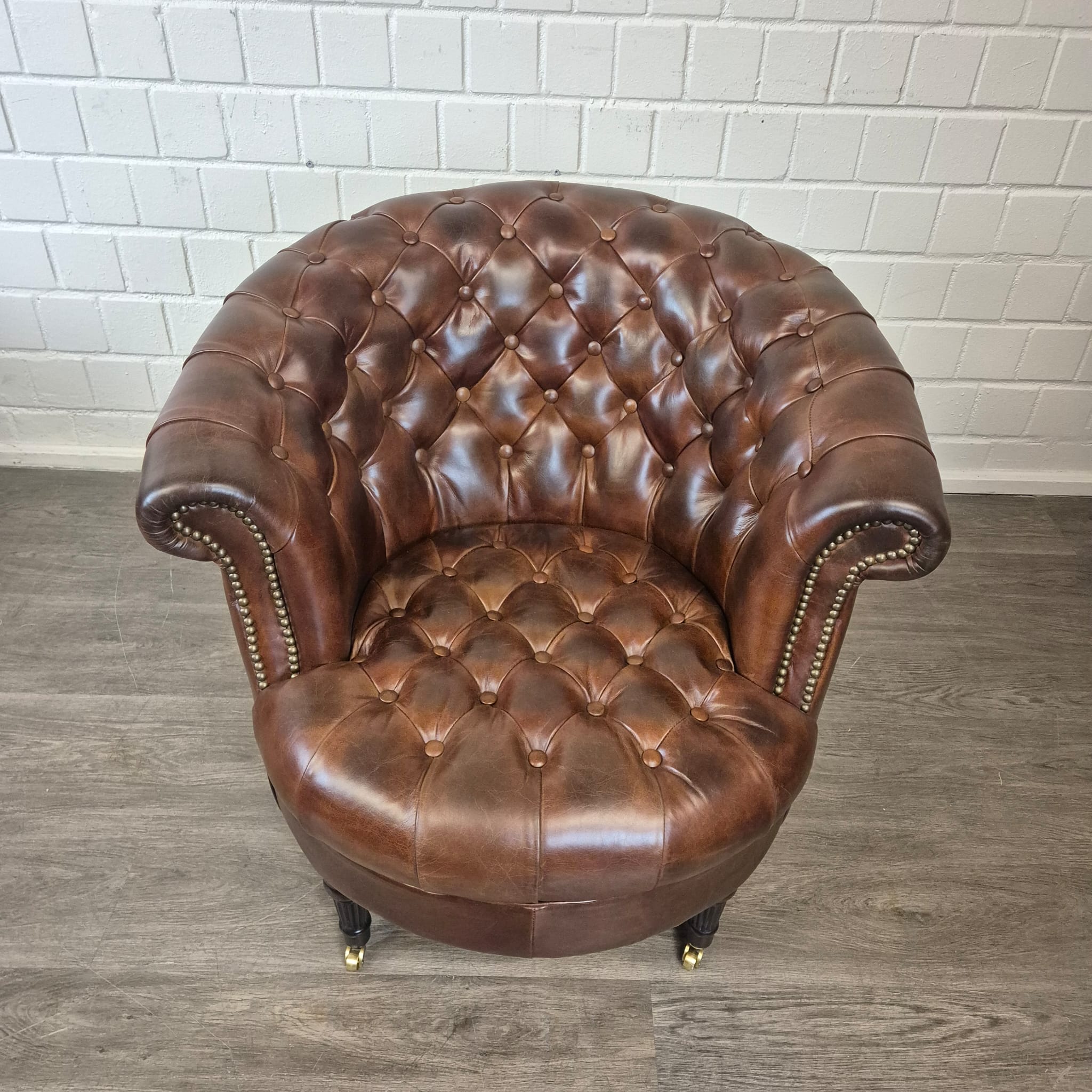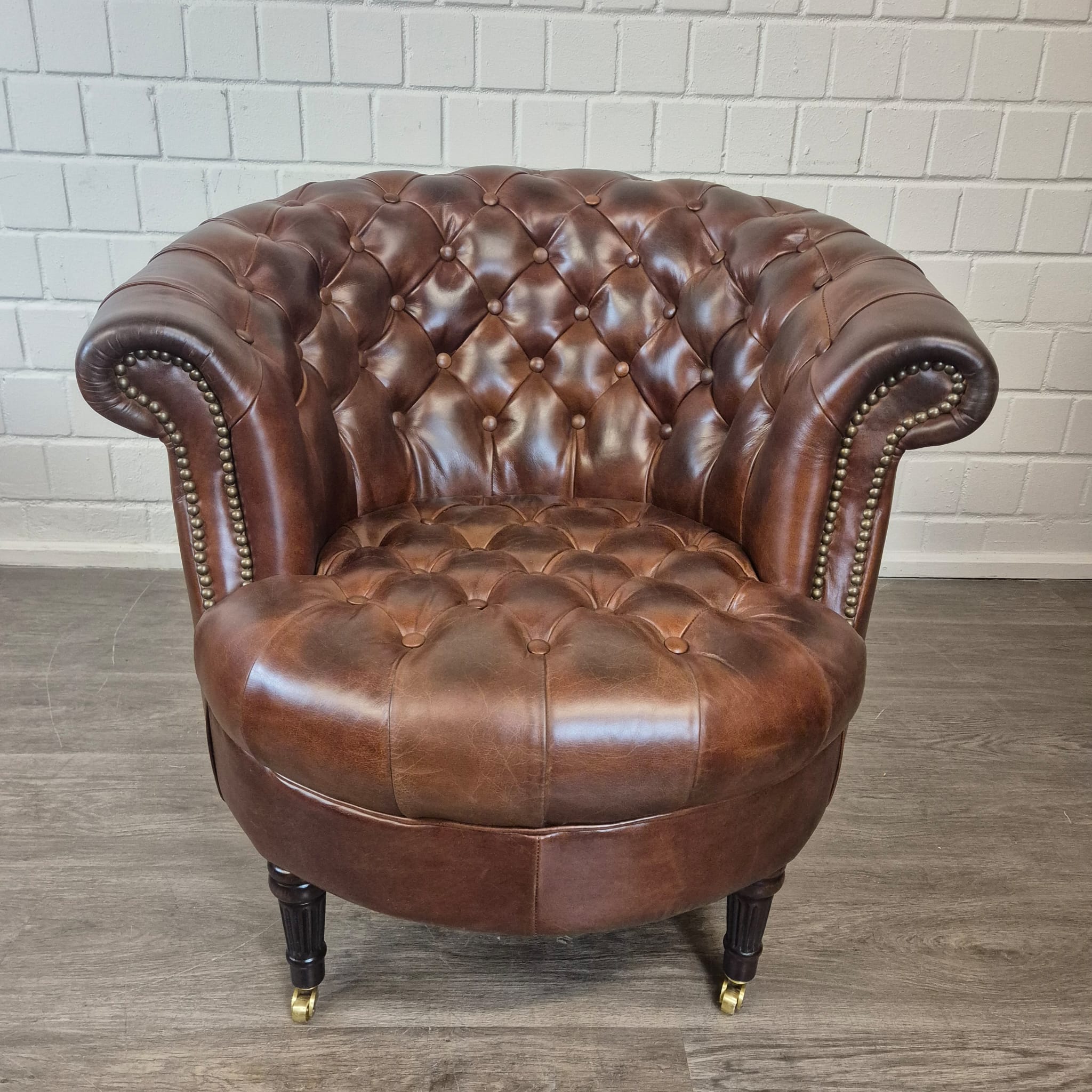 Schitterende Chesterfield fauteuil van echt leer met messing wielen