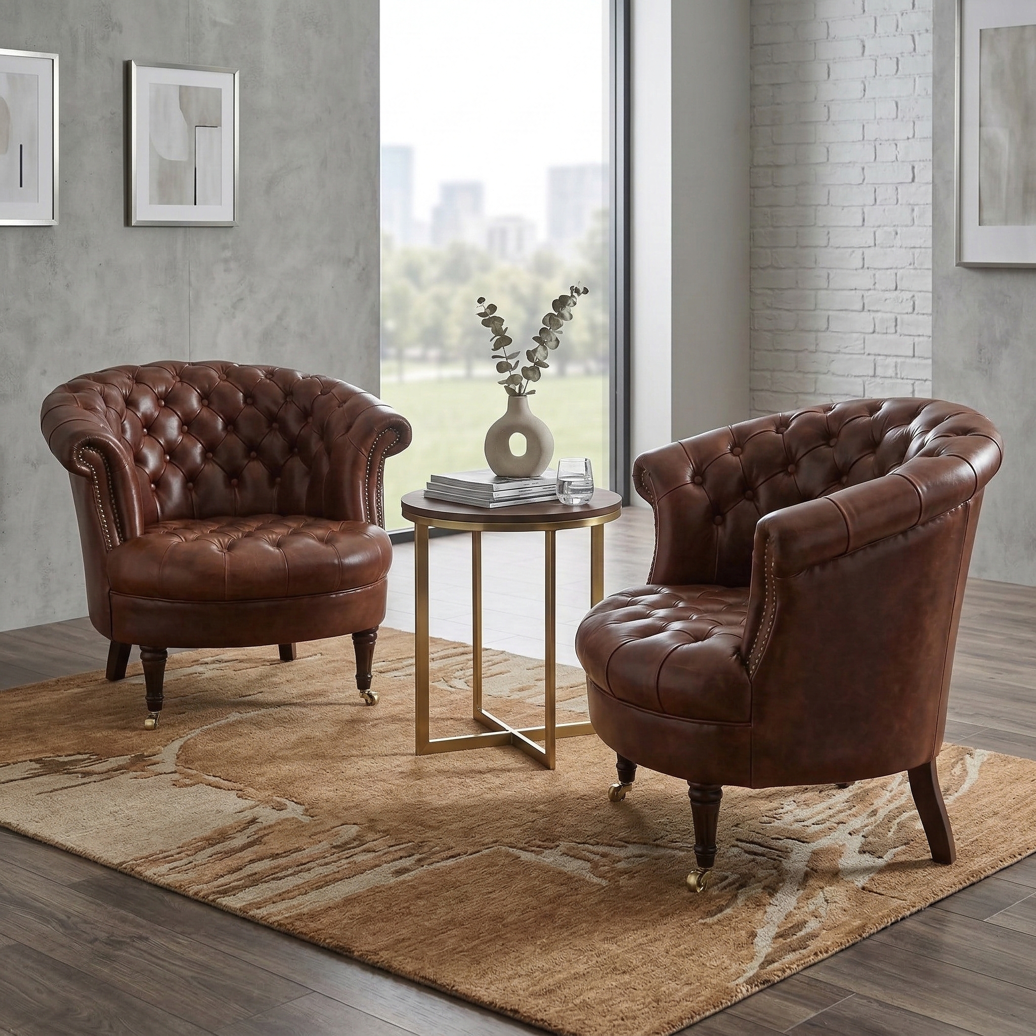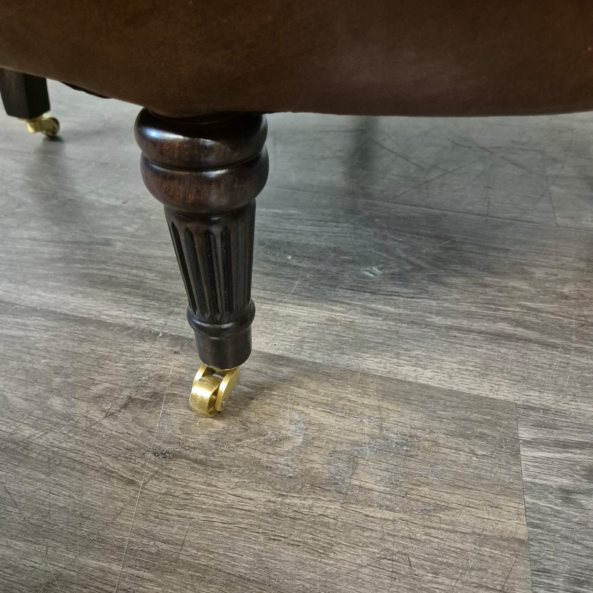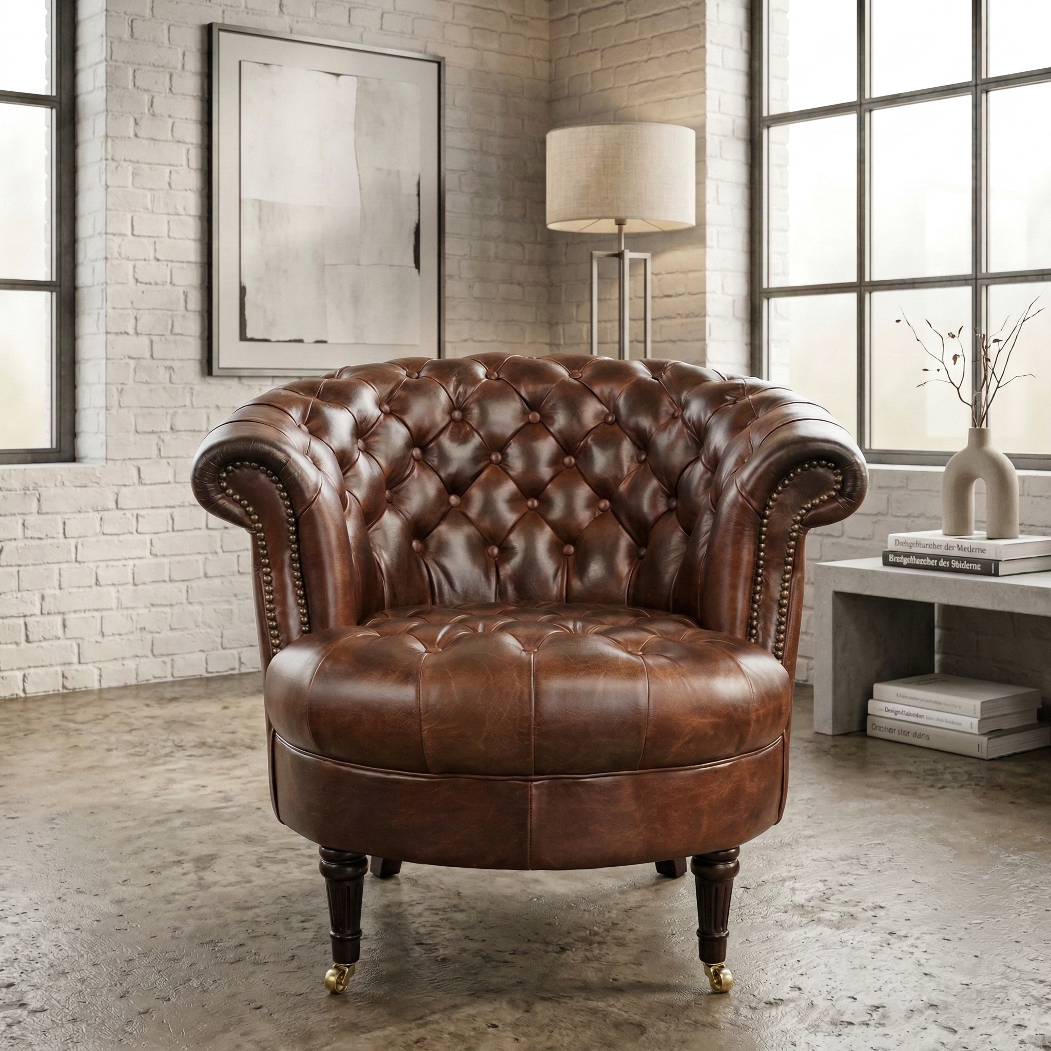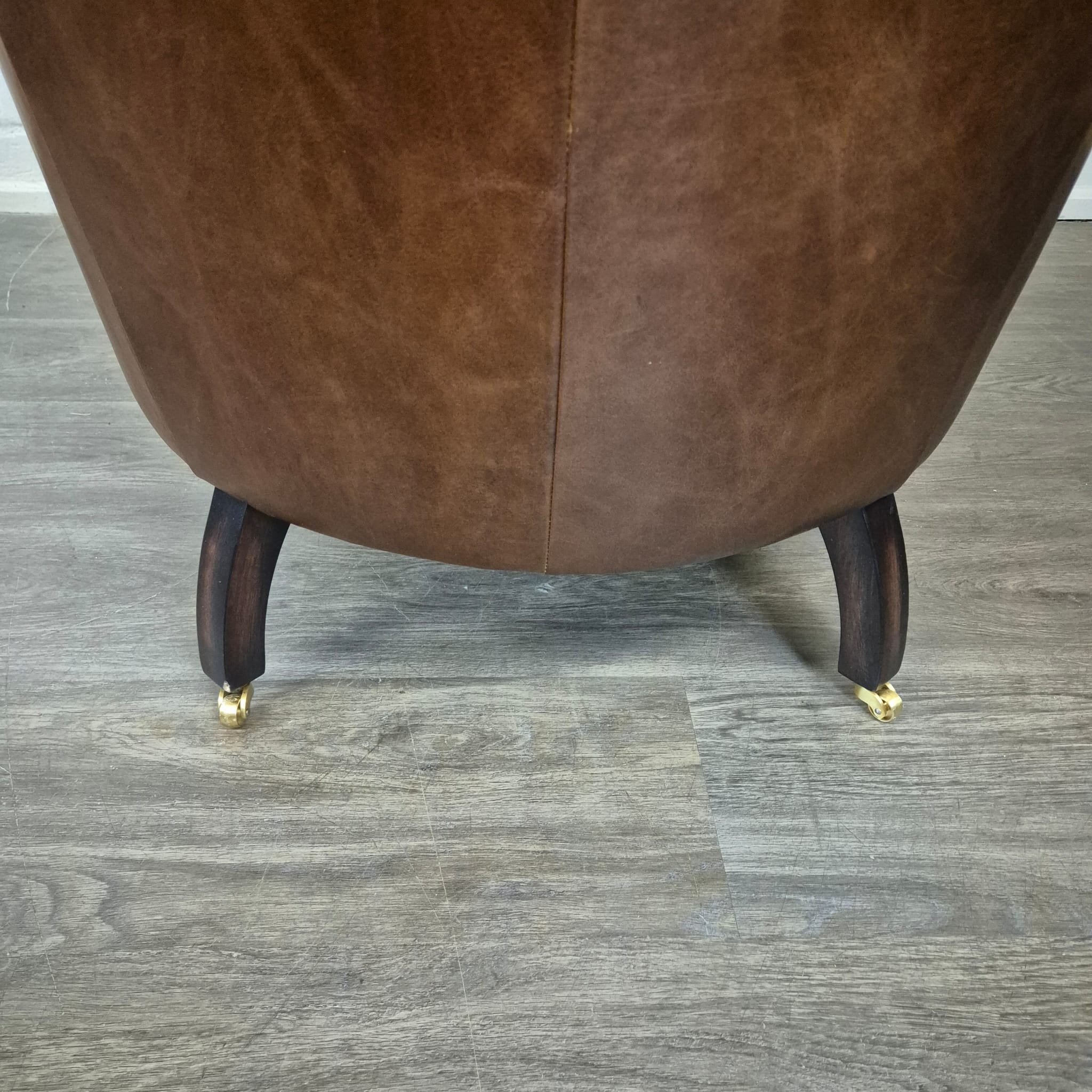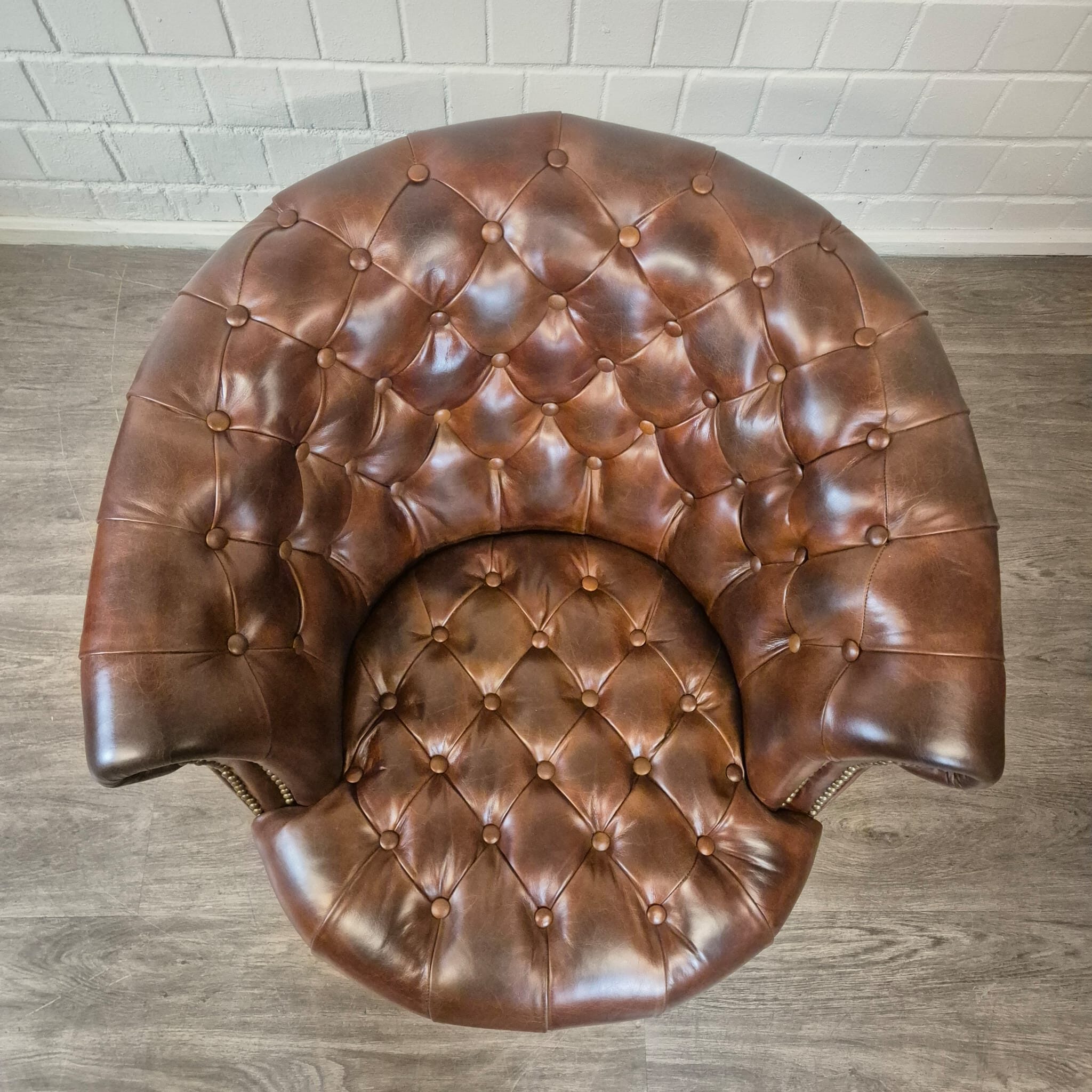 Schitterende Chesterfield fauteuil van echt leer met messing wielen
