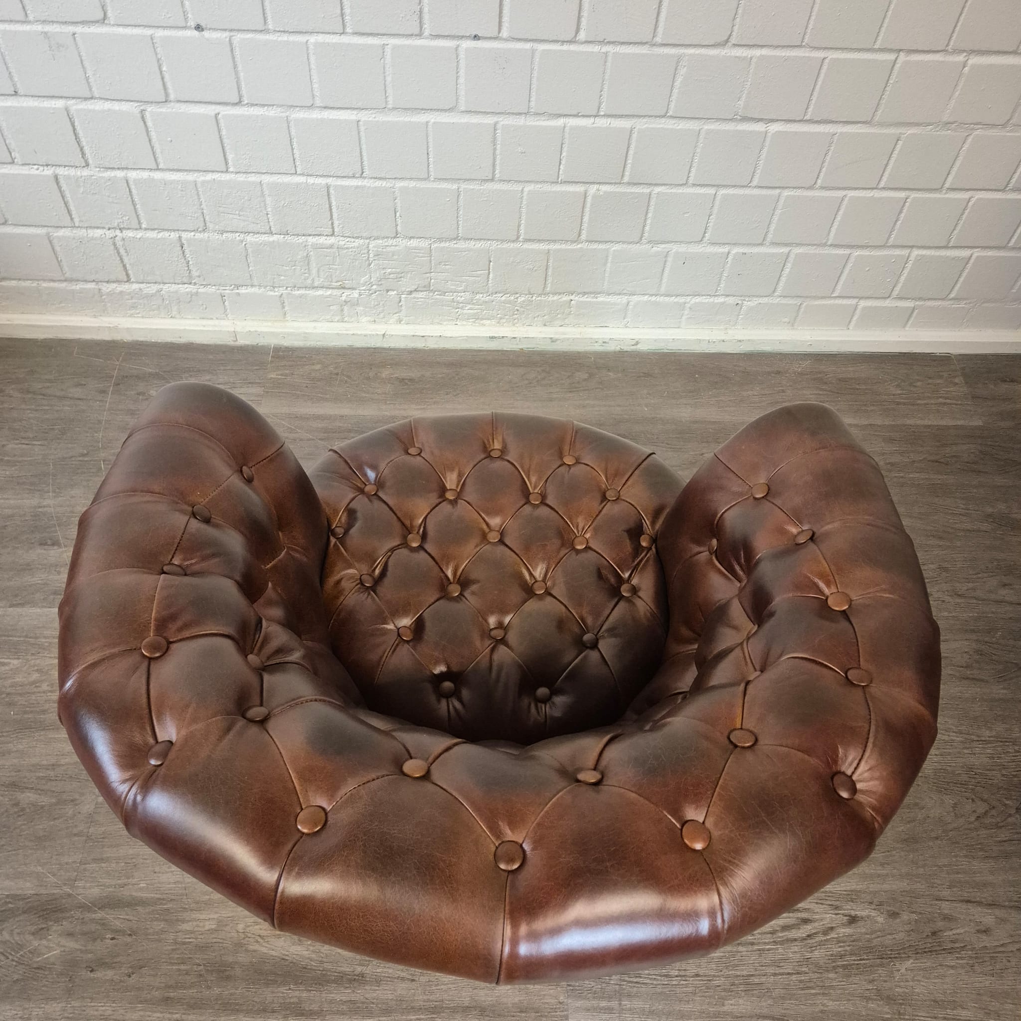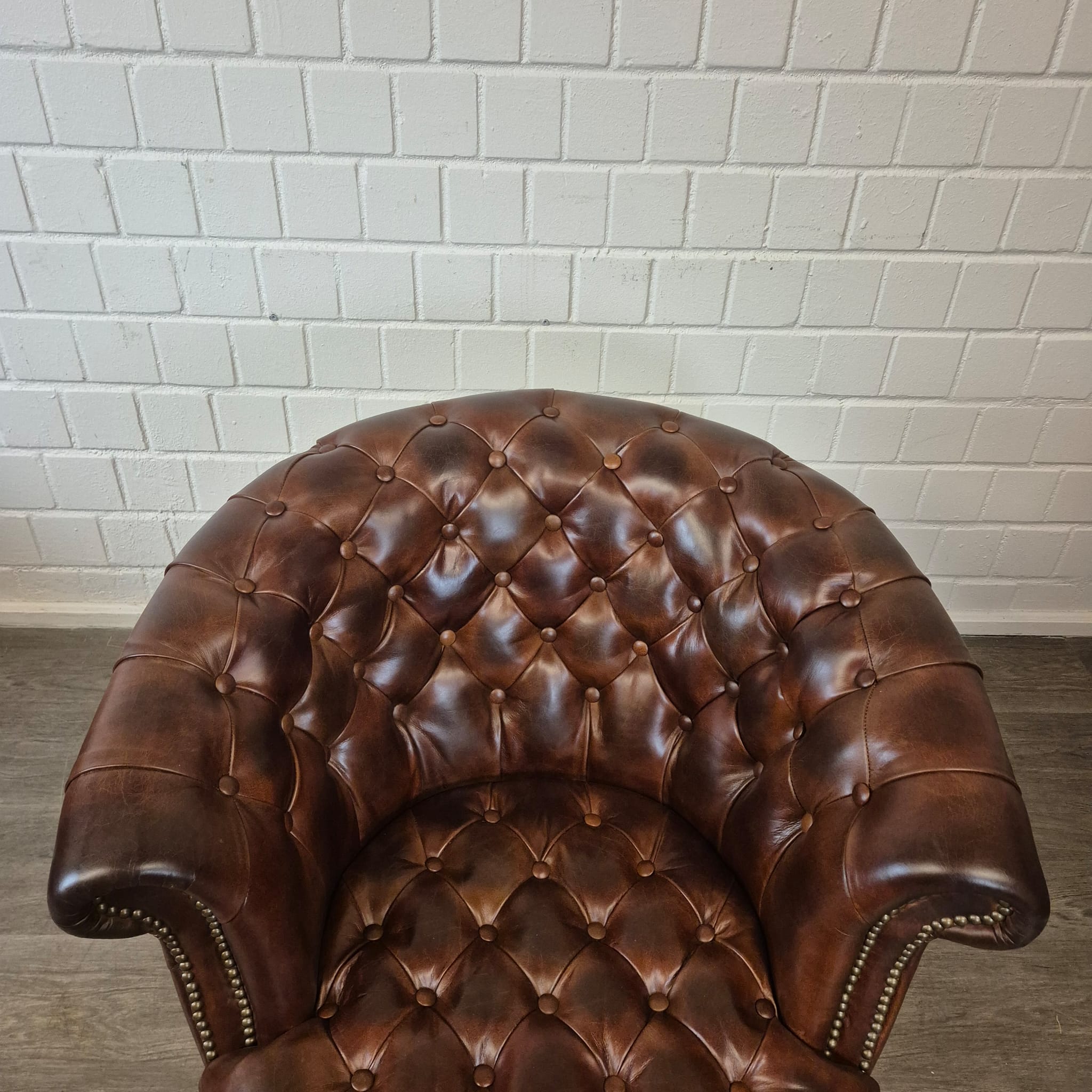 Deze fauteuil betovert met zijn karakteristieke diepe knoopstiksels en elegant gebogen armleuningen, typisch voor het Chesterfield-design. Het hoogwaardige echt leer heeft een prachtige, natuurlijke patina ontwikkeld, wat het meubelstuk diepte en karakter geeft.