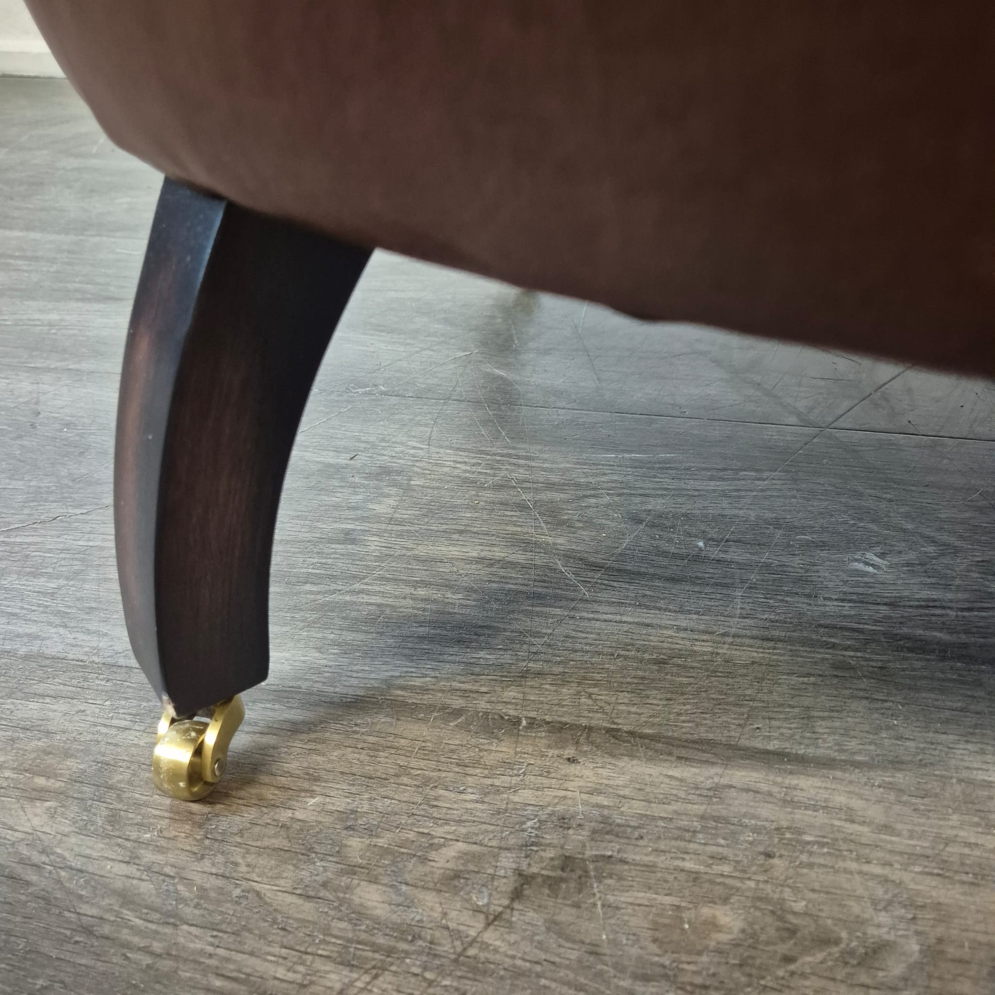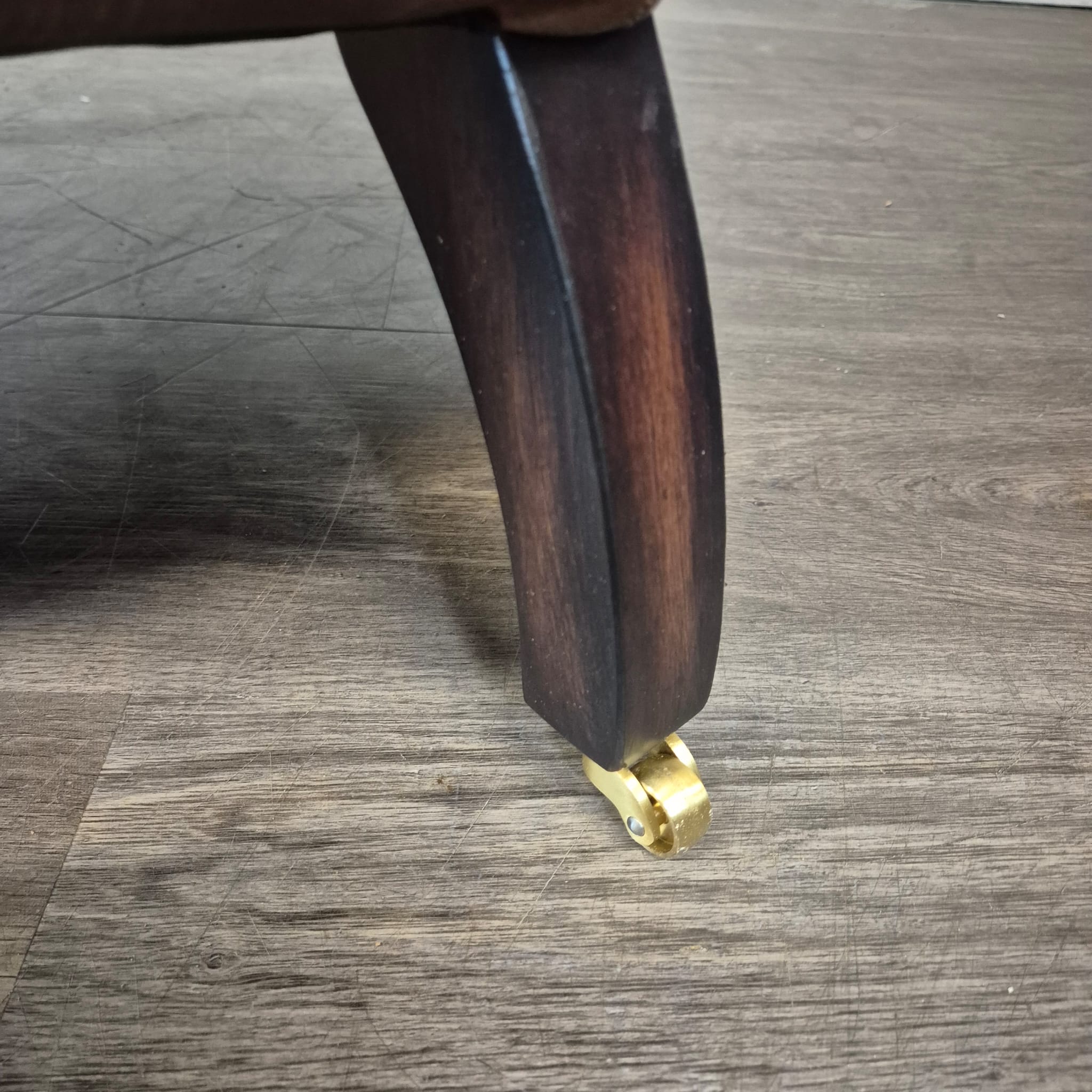De stevige bekleding zorgt voor uitzonderlijk zitcomfort. Een bijzonder detail zijn de vier volledig functionele messing wielen op de donkerbruine houten poten. Deze wielen maken de fauteuil niet alleen een blikvanger, maar ook een verplaatsbaar meubelstuk dat gemakkelijk door de kamer kan worden verplaatst zonder de vloer te beschadigen.