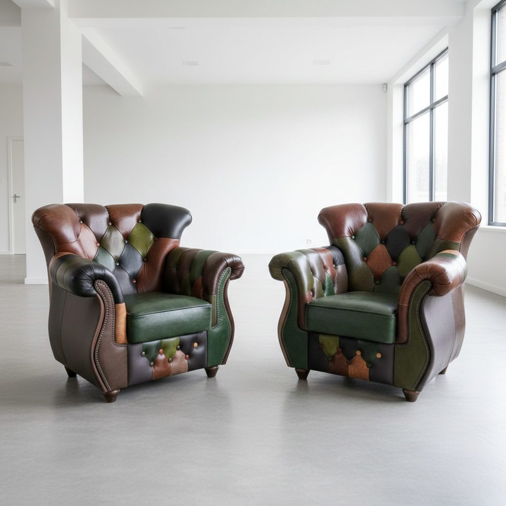 Deze Chesterfield fauteuil in het model "Jungle" is een absolute blikvanger en brengt individuele charme in uw huis. Vervaardigd uit hoogwaardig echt leer, overtuigt deze fauteuil met zijn bijzondere patchwork-design.