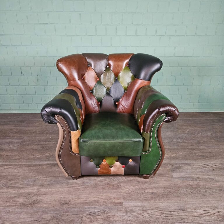 De combinatie van leren stukken in verschillende warme natuurtinten zoals groen, bruin, zwart en cognacrood geeft hem een levendige en tegelijkertijd harmonieuze uitstraling. Typische Chesterfield-kenmerken zoals de elegante, gerolde armleuningen en het klassieke diamantstiksel met diepliggende knopen zijn hier stijlvol verwerkt.