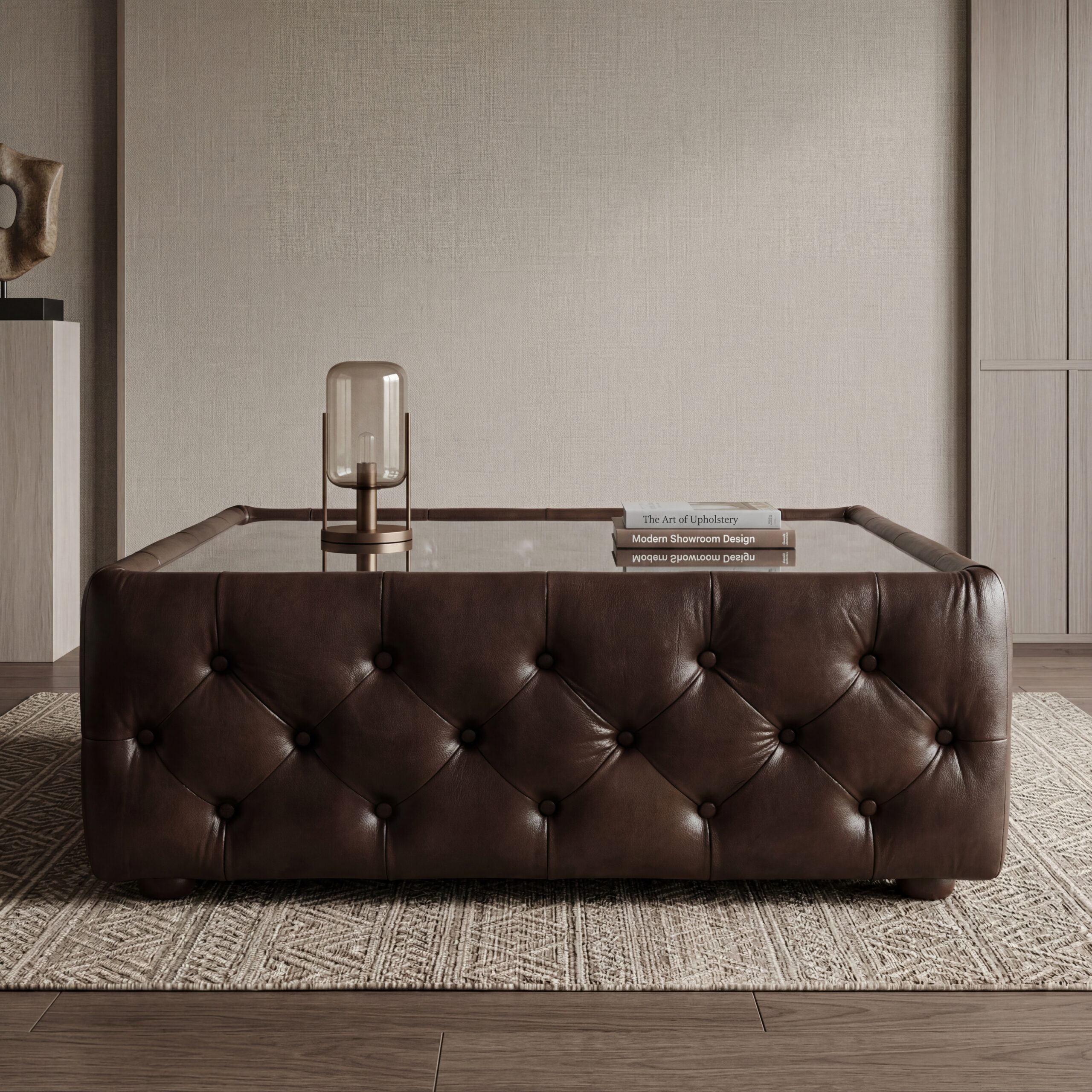 Exclusieve Chesterfield salontafel – Echt leer & glas – Donkerbruin