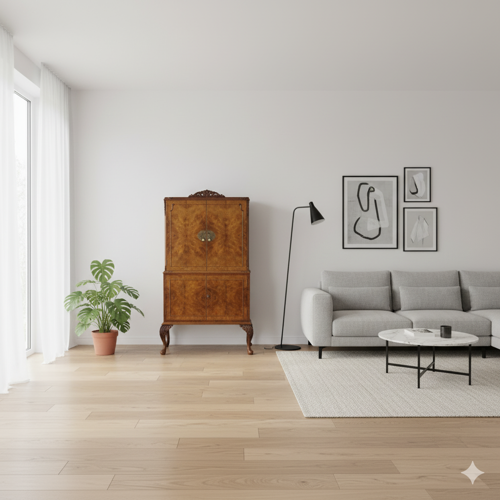 Cocktailkast noten gefineerd uit ca. 1950. De kast is in een goede staat en heeft lichte gebruikssporen.
