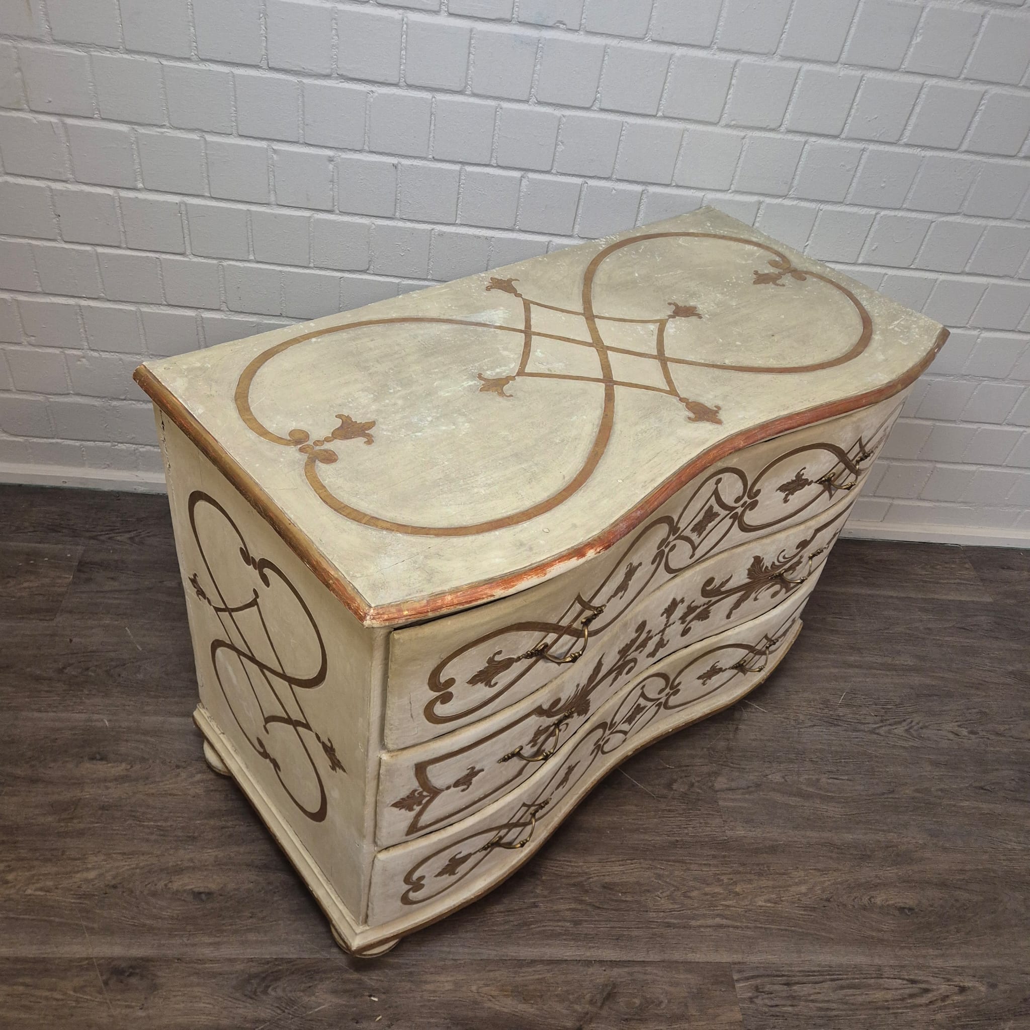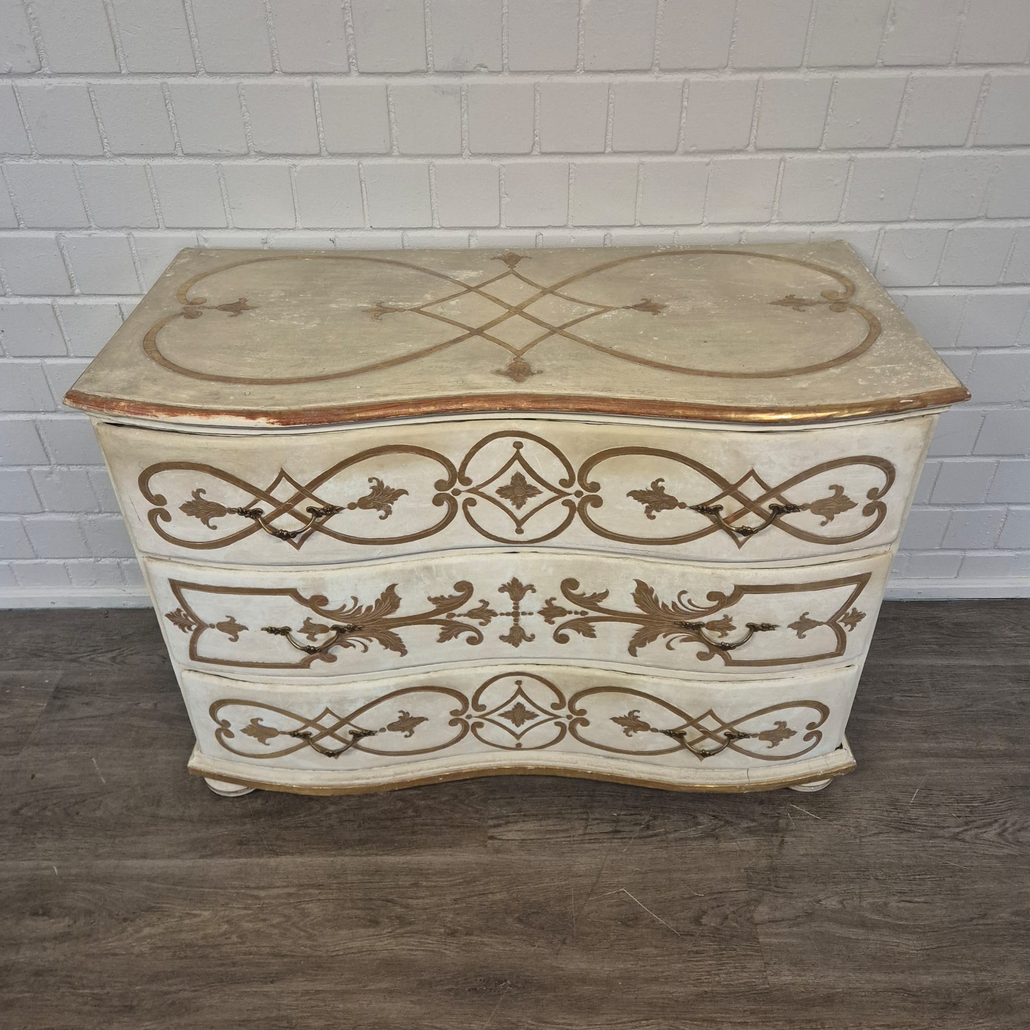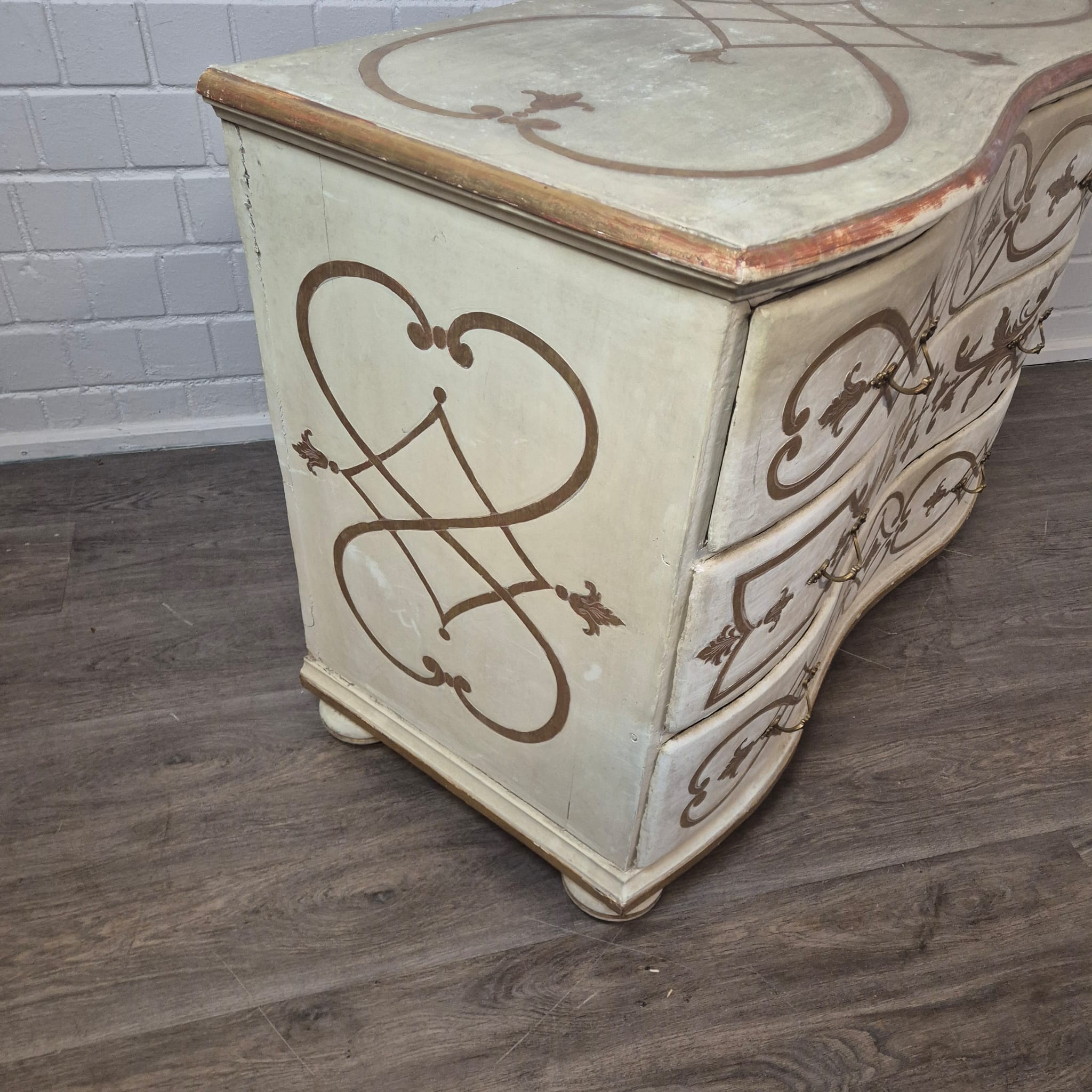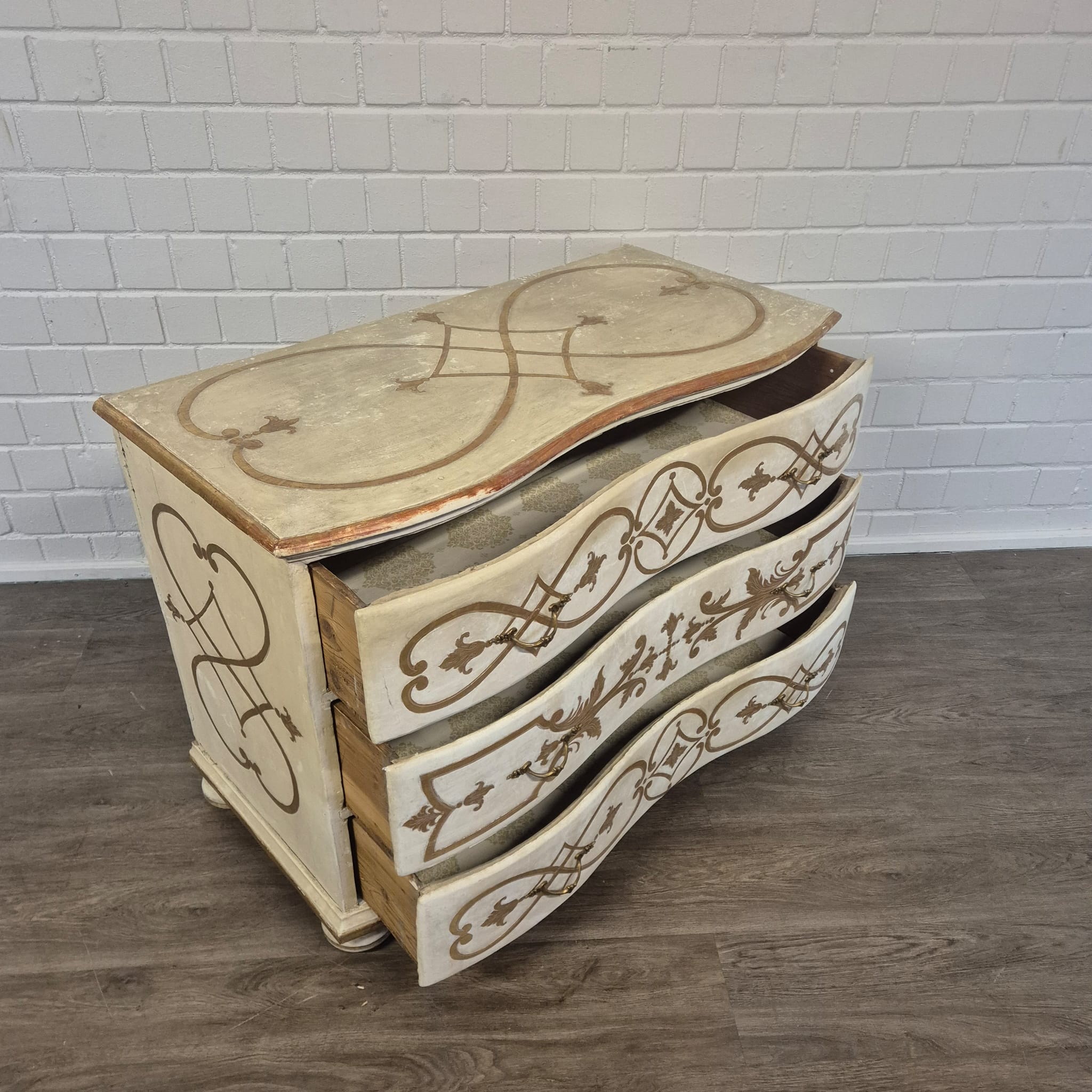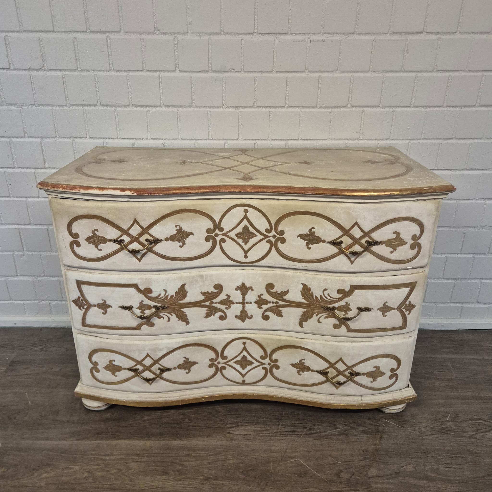 Originele barok commode gemaakt van massief grenen in oud-creme/goud geschilderd uit ca. 1770. De commode is in een goede staat en heeft weinig gebruikssporen.