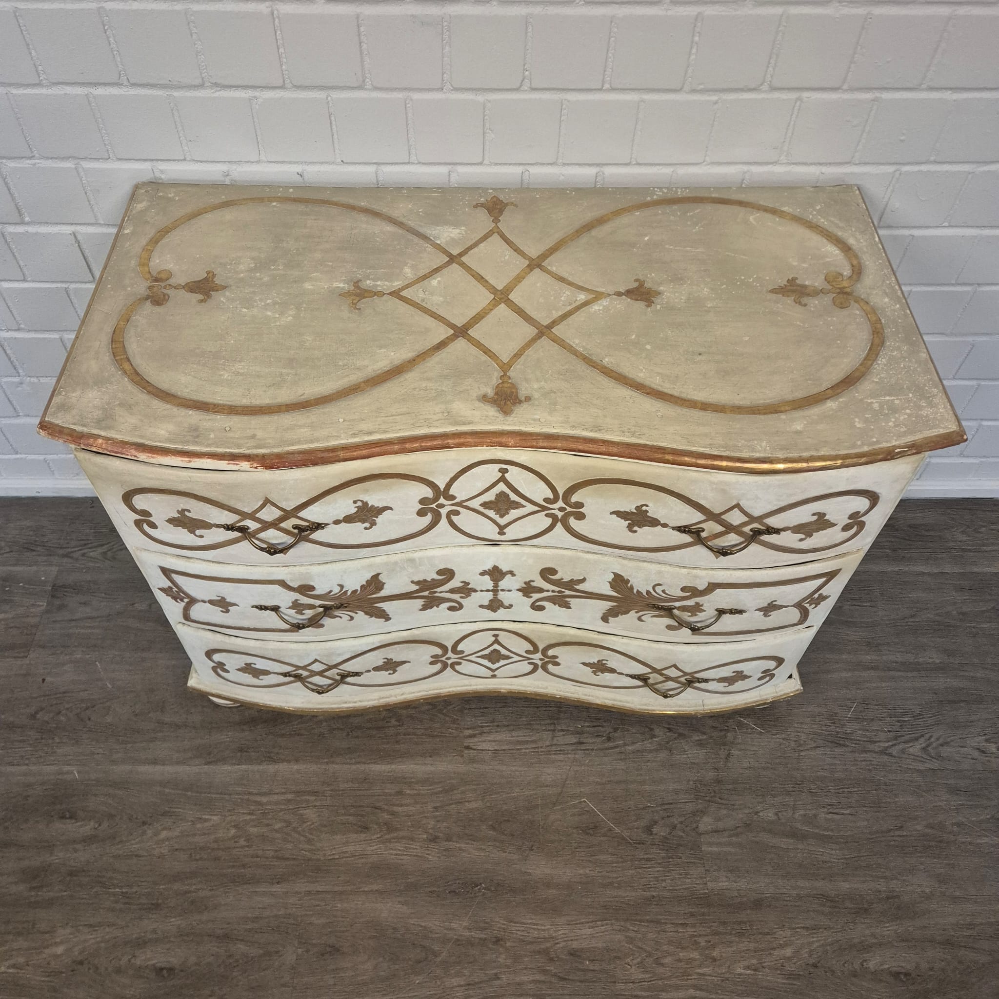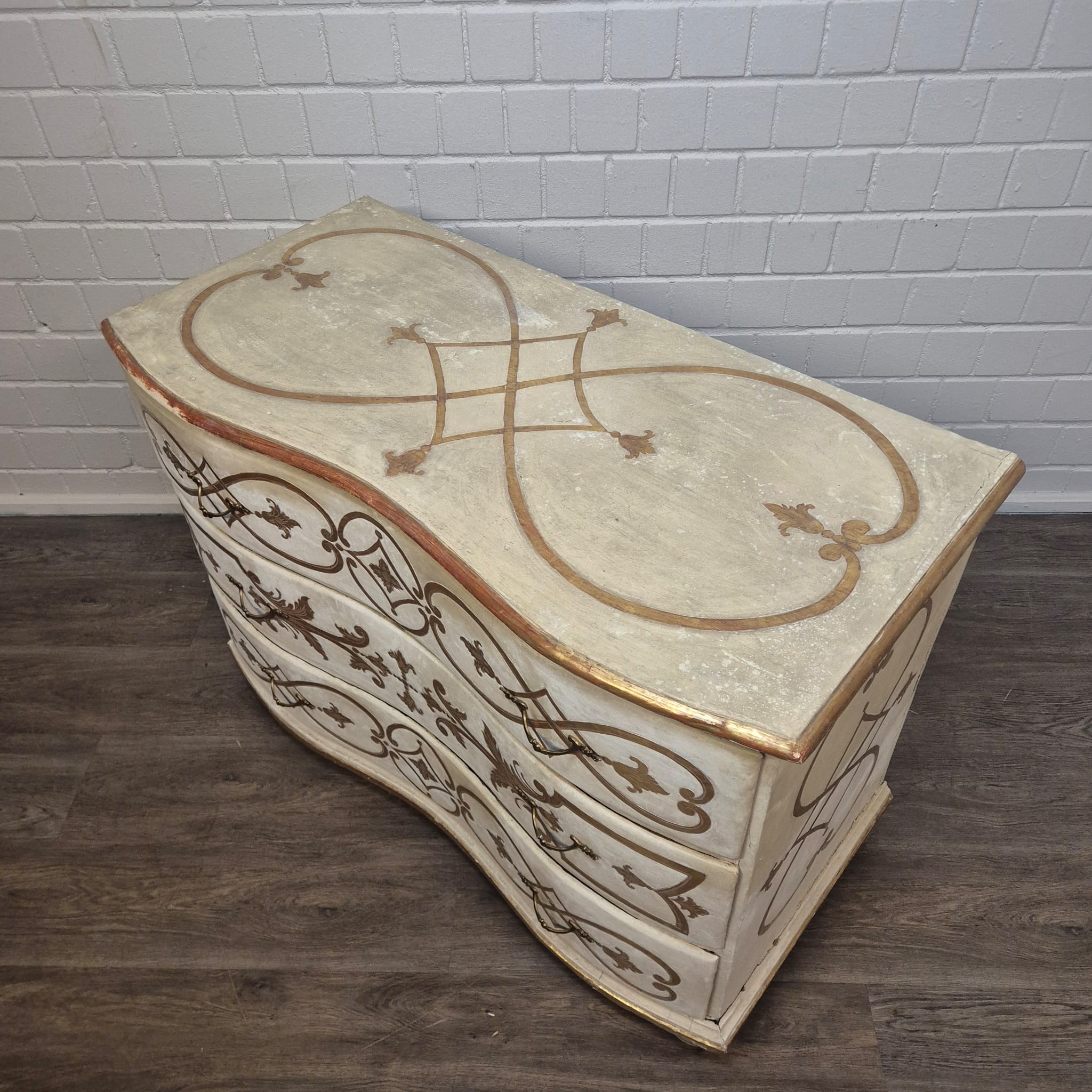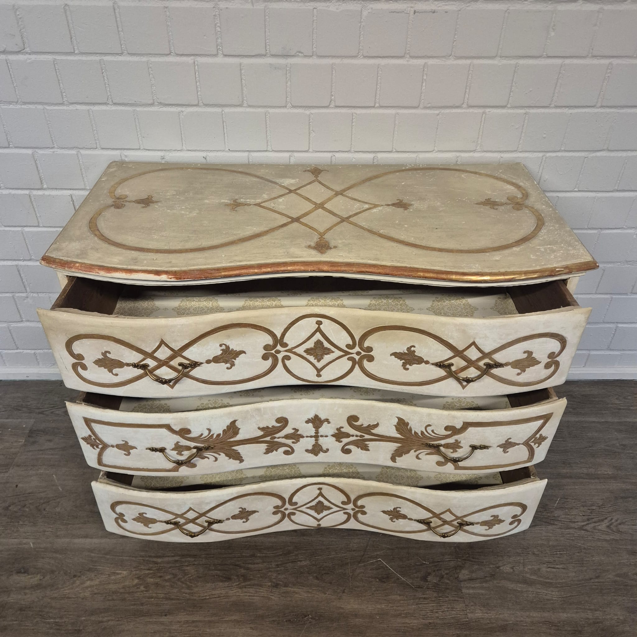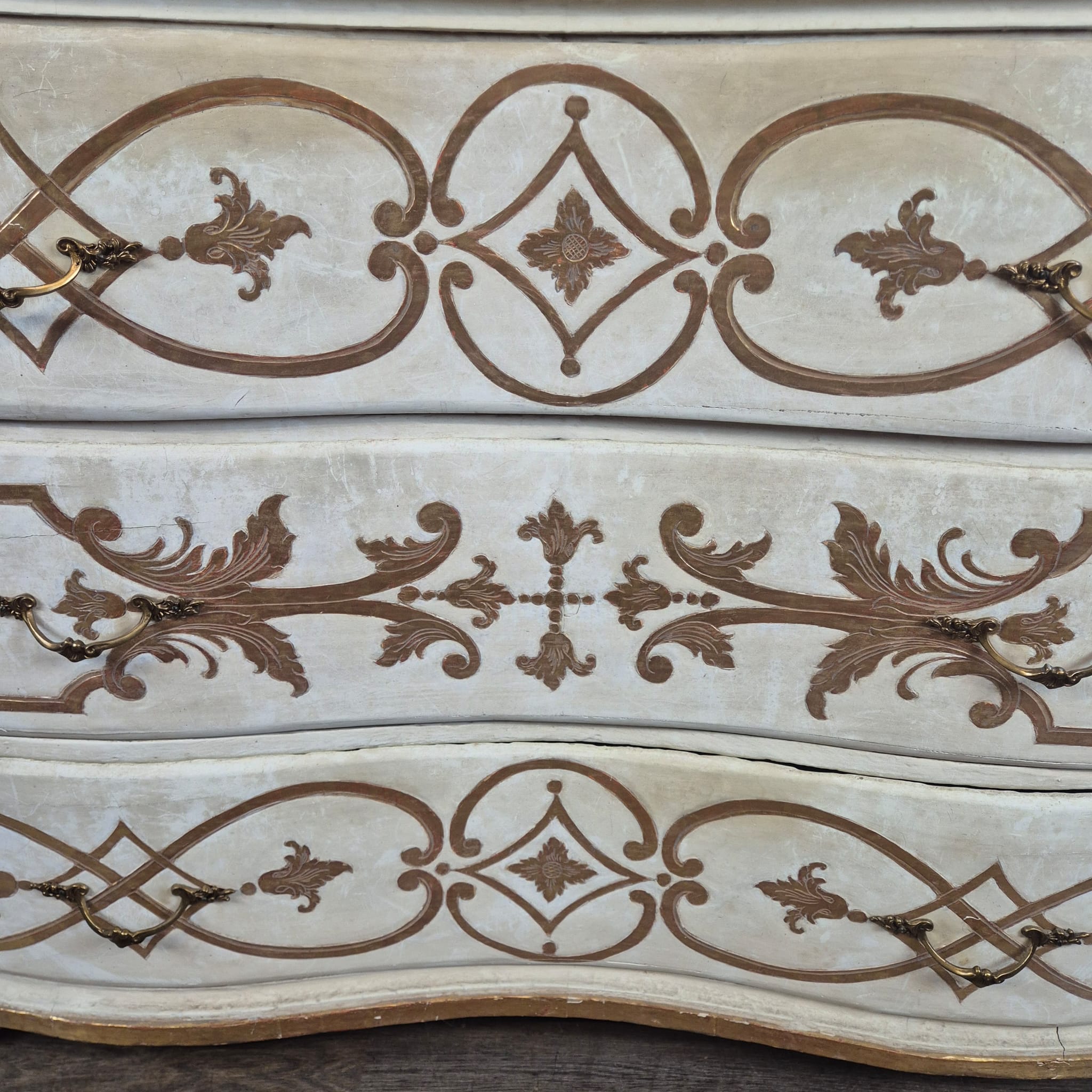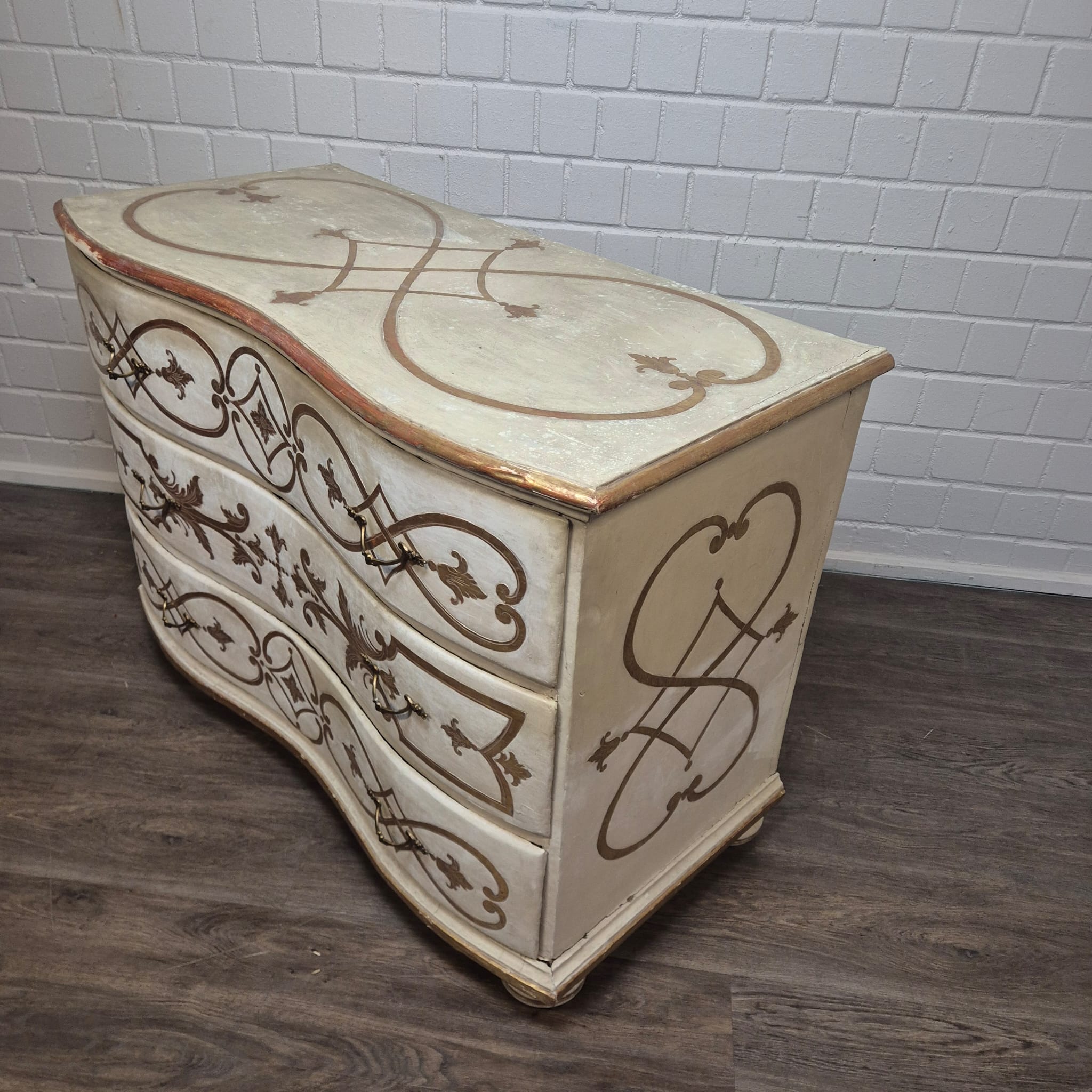 Originele barok commode gemaakt van massief grenen in oud-creme/goud geschilderd uit ca. 1770. De commode is in een goede staat en heeft weinig gebruikssporen.