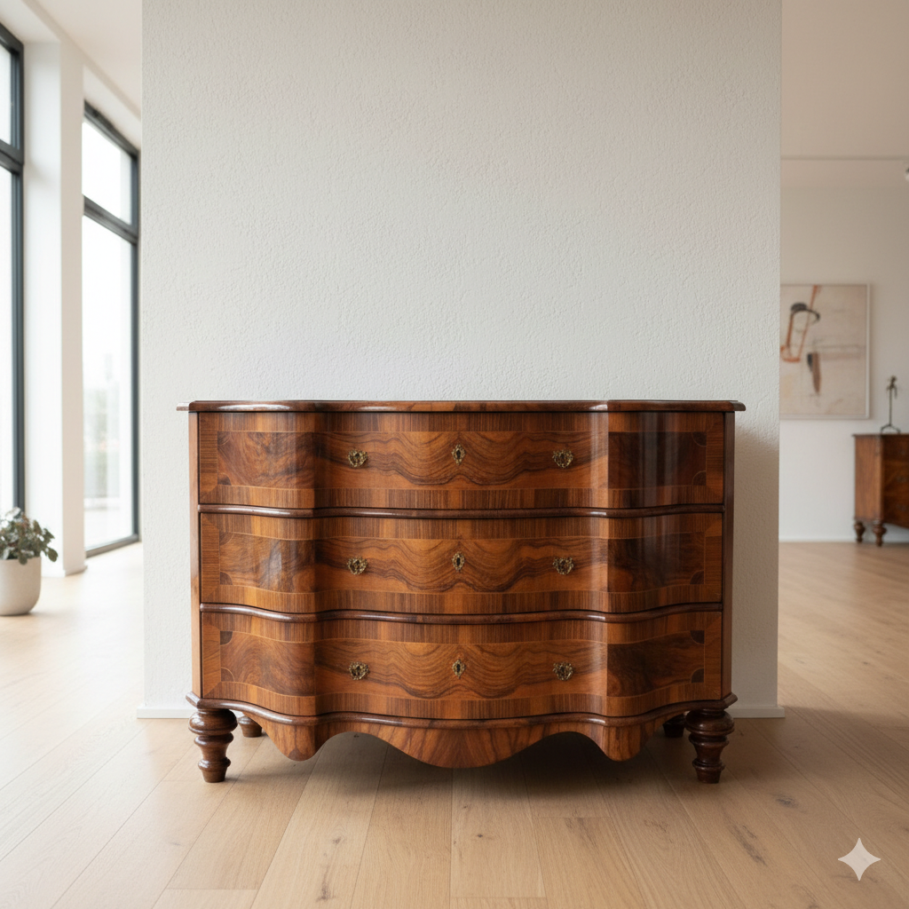 Gerestaureerde barok commode noten gefineerd en schellak gepolytourd uit ca. 1850. De commode is in een zeer goede staat en heeft minimale gebruikssporen. De laatste foto toont de commode vóór de restauratie.
