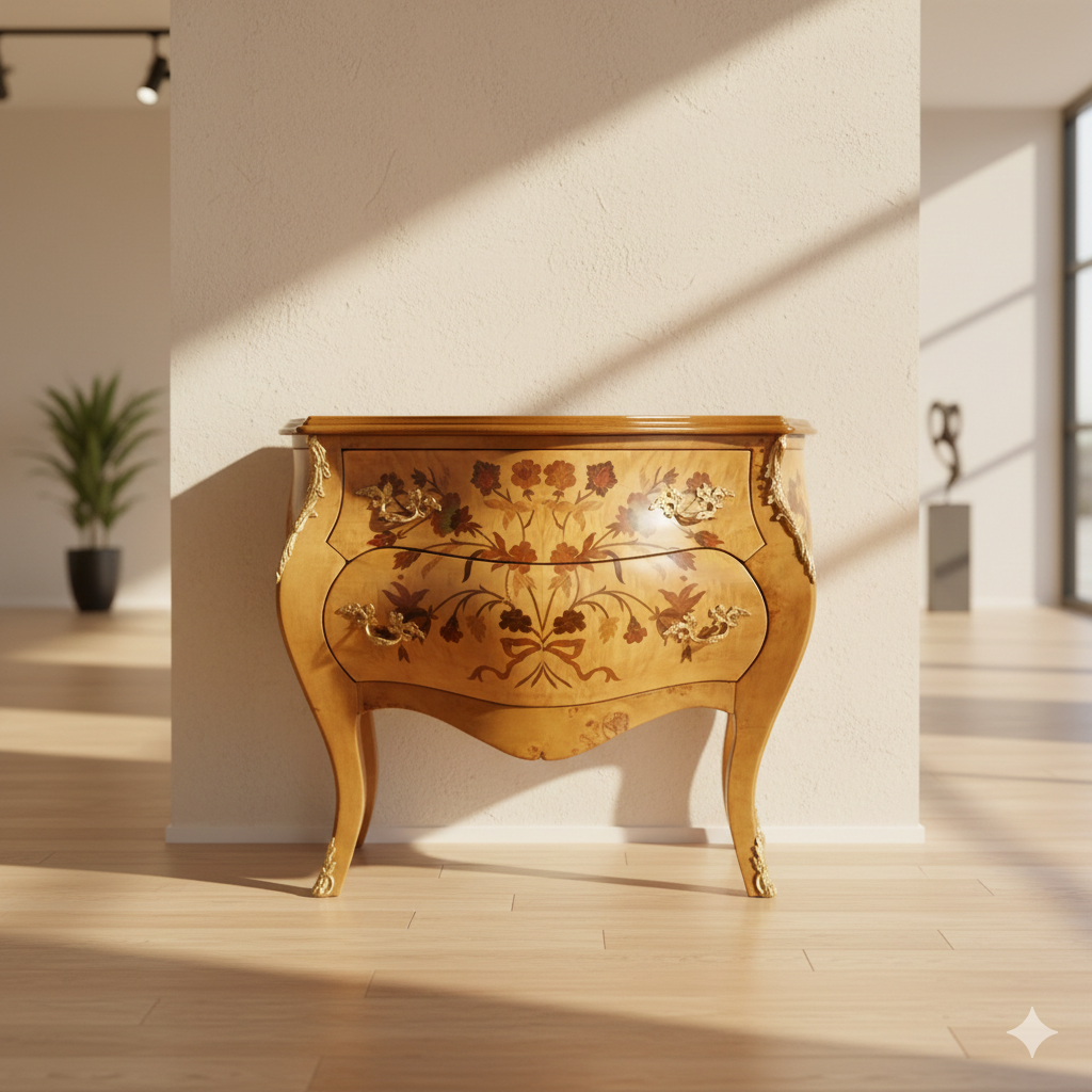 Beslag: Versierd met weelderige, vergulde of bronzen versieringen op de laden en poten, die het luxueuze karakter benadrukken.