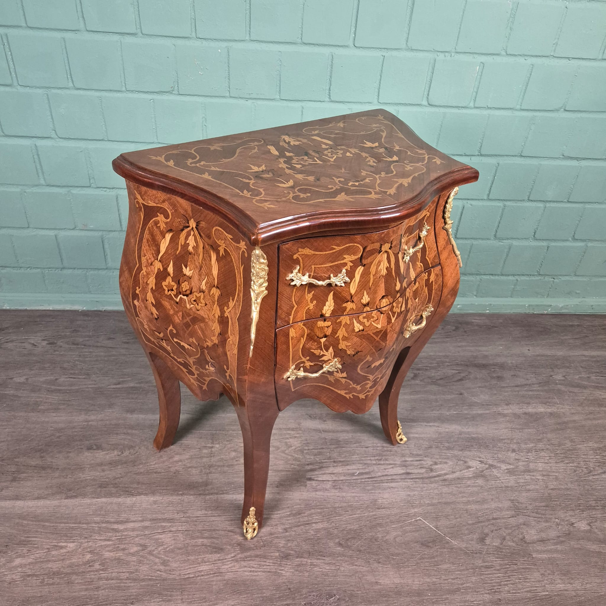 Inlegwerk: Uitgebreid bloemeninlegwerk van verschillende kostbare houtsoorten, kunstig gerangschikt op de voorkant, zijkanten en het bovenpaneel