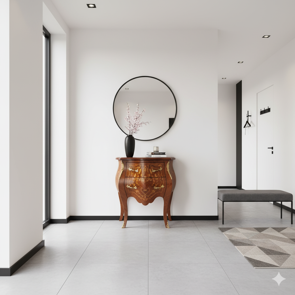 Deze commode combineert vakmanschap met barokke elegantie. Hij is ideaal als stijlvol meubelstuk in de woonkamer, slaapkamer of hal, met praktische opbergruimte in twee royale lades.