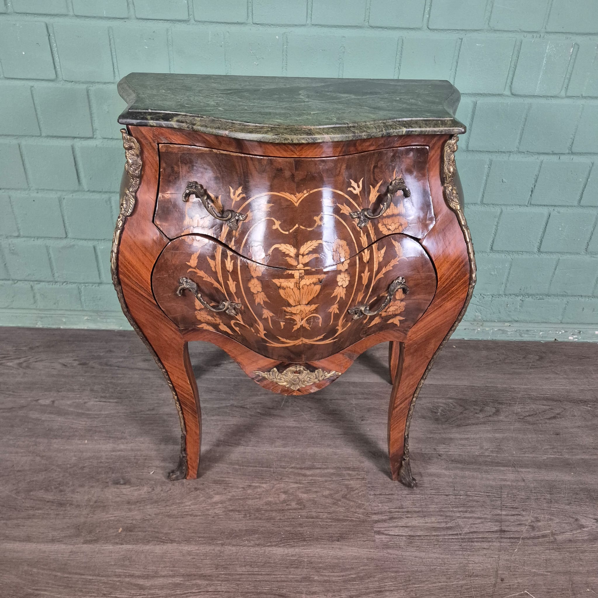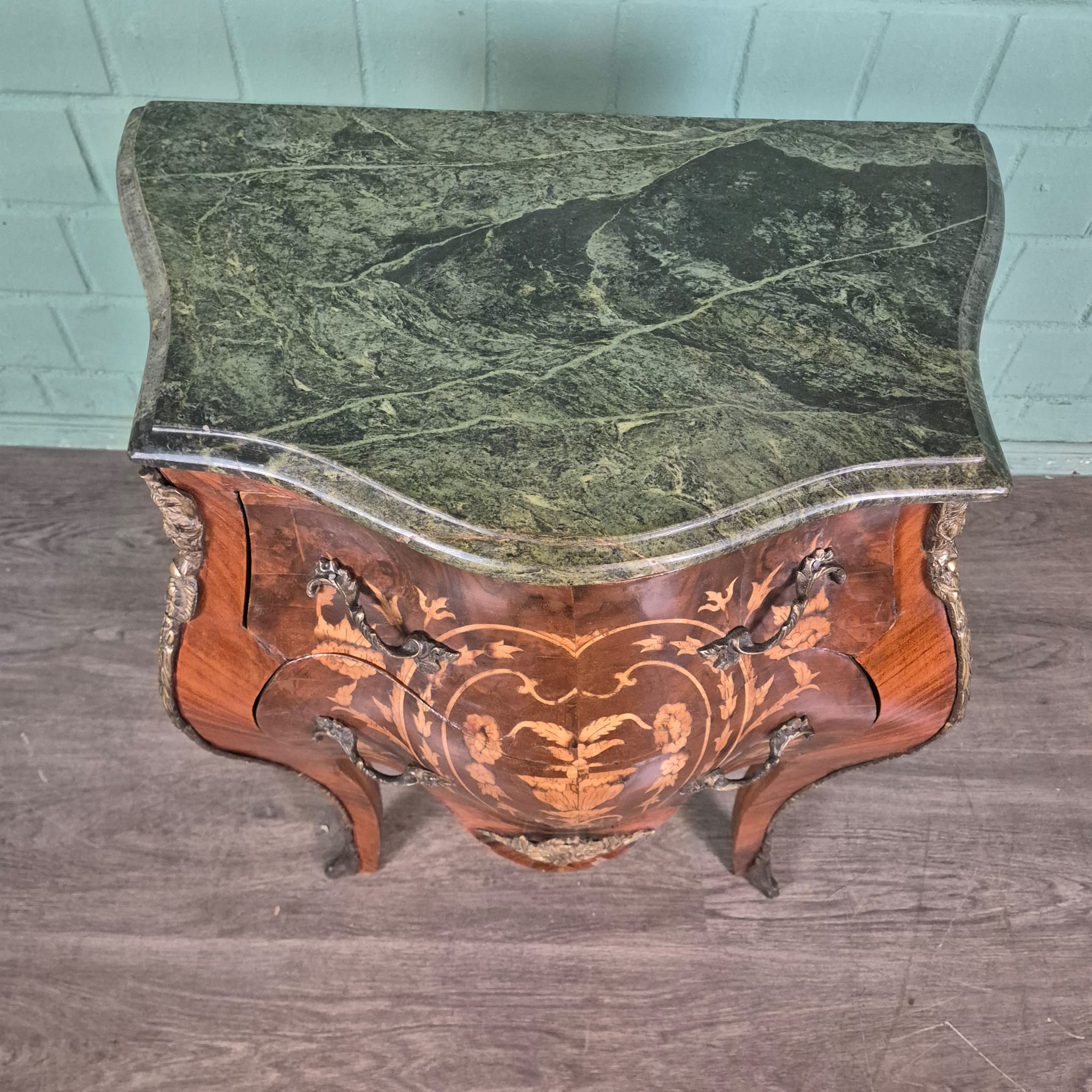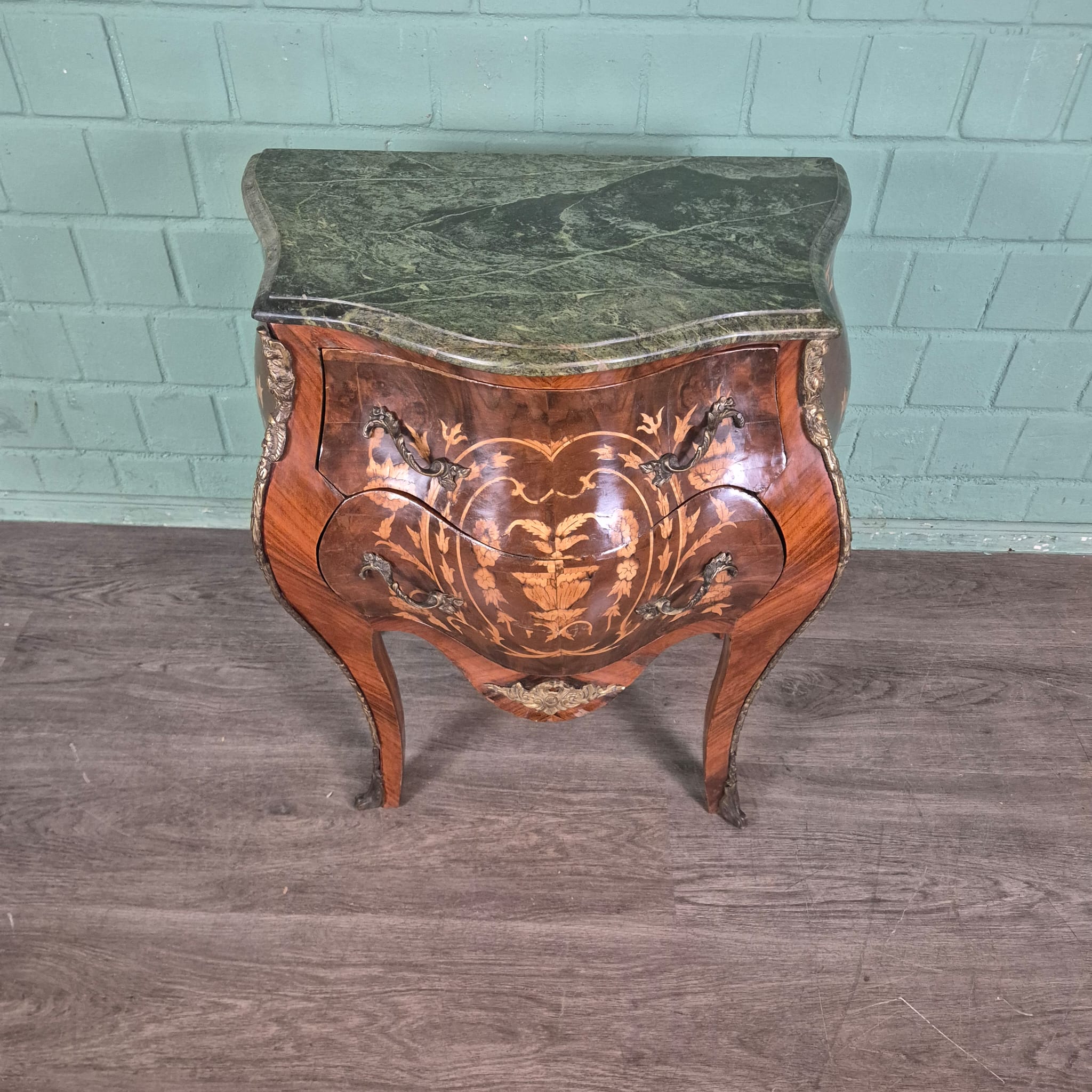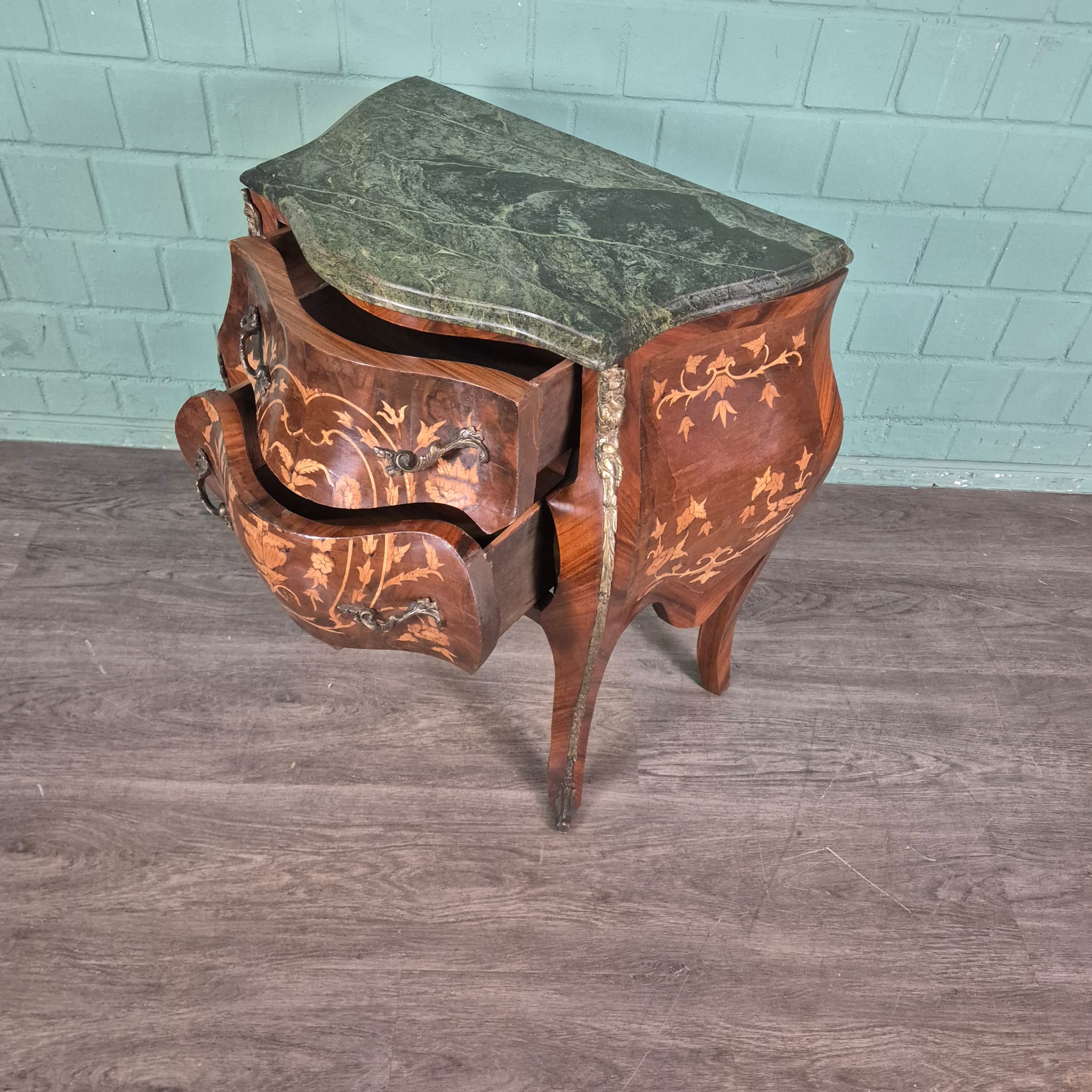 Stijlvolle reproductie van een barok commode noten gefineerd met inlegwerk en een groen marmeren blad. Showmodel voor een speciale prijs.