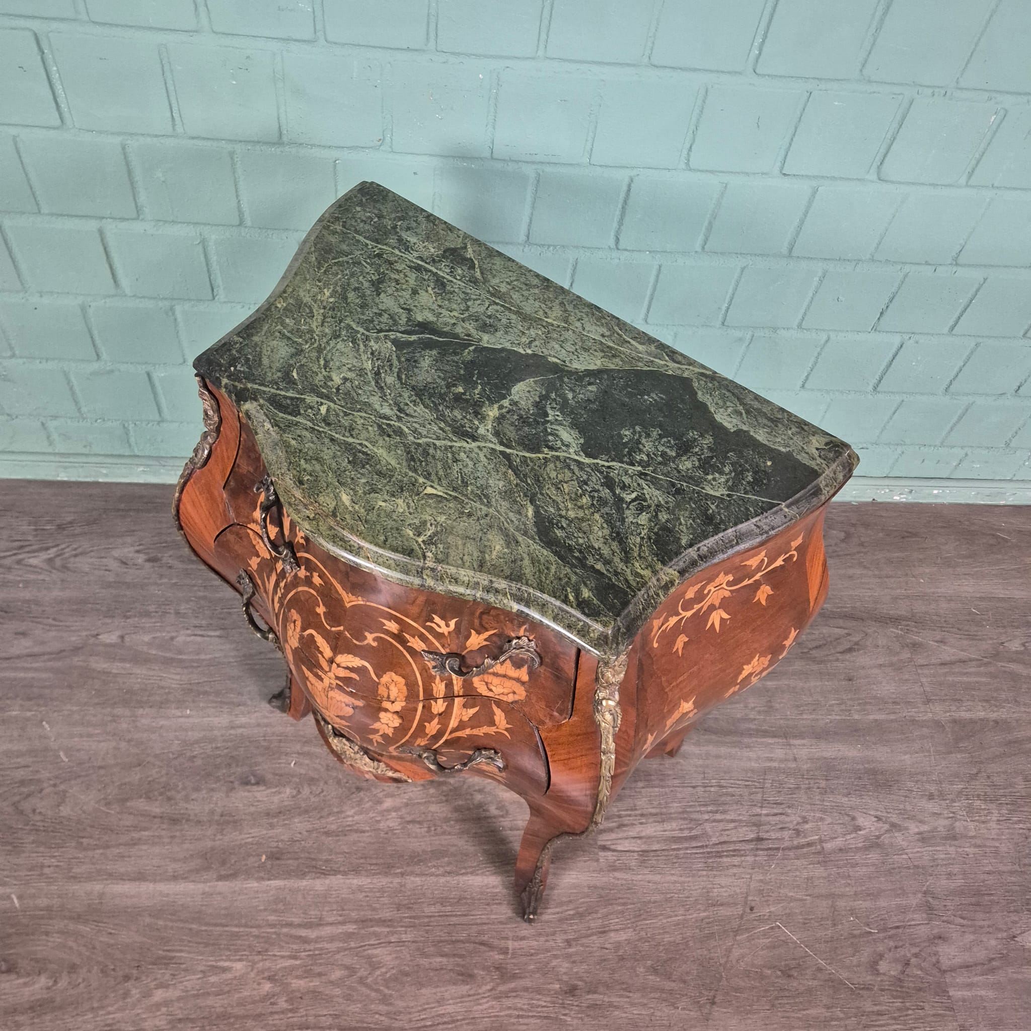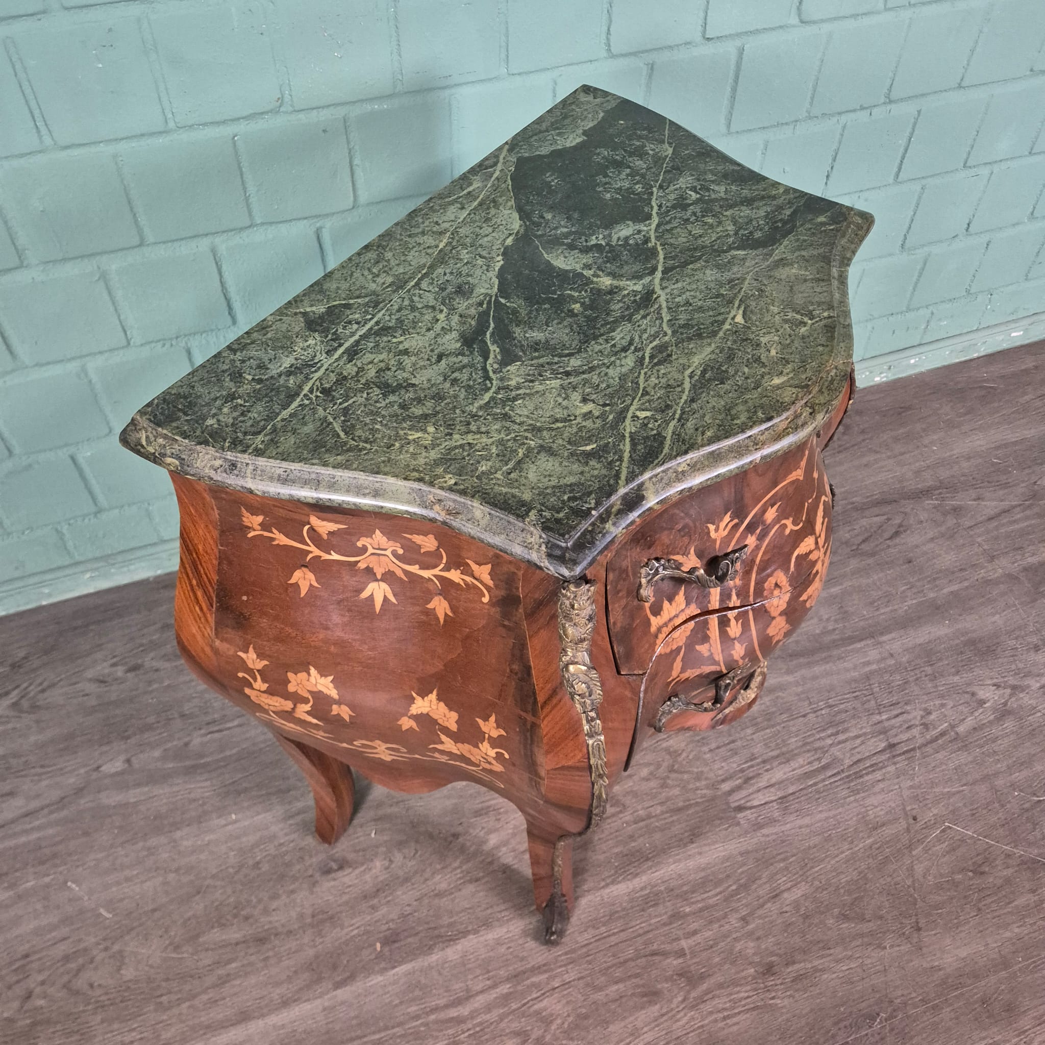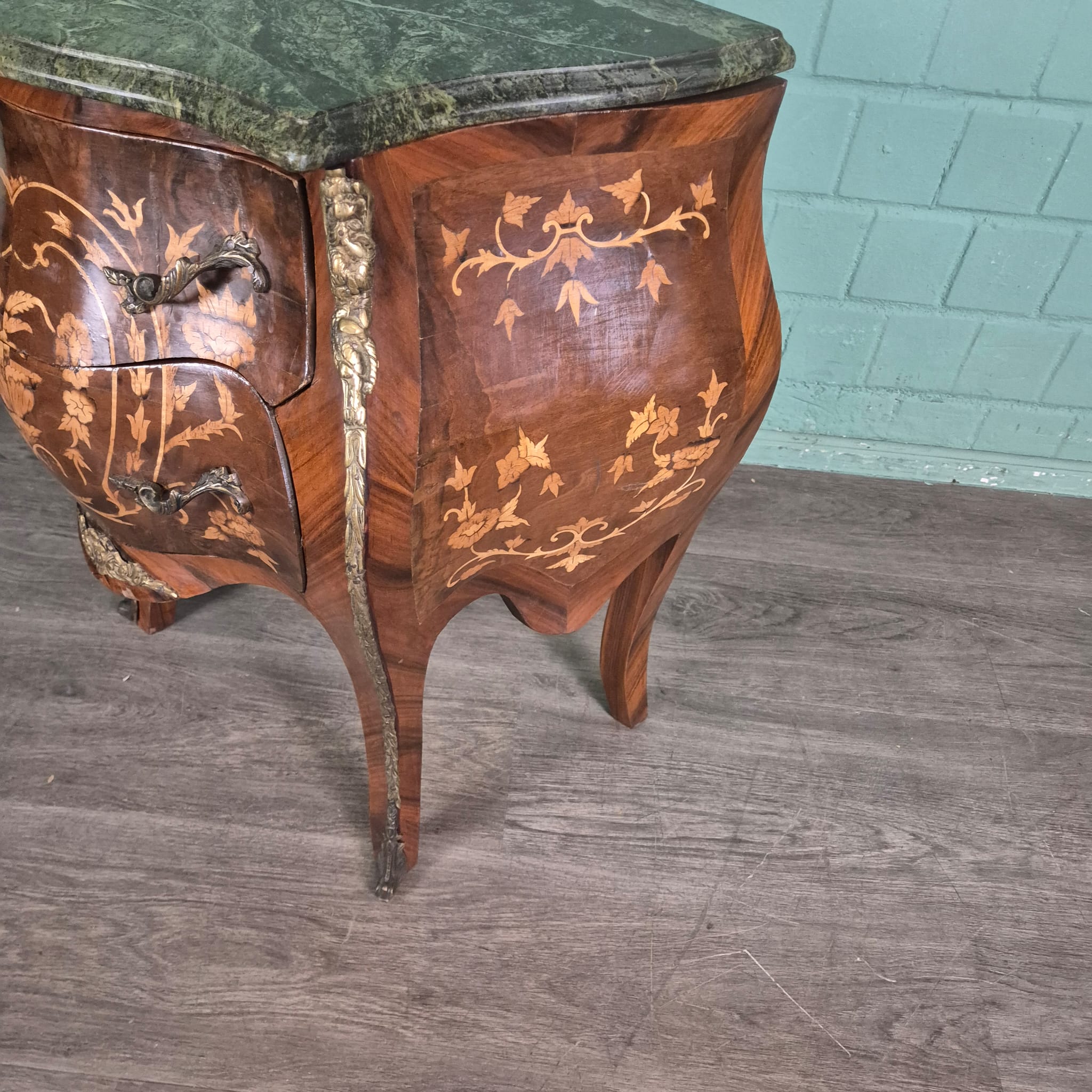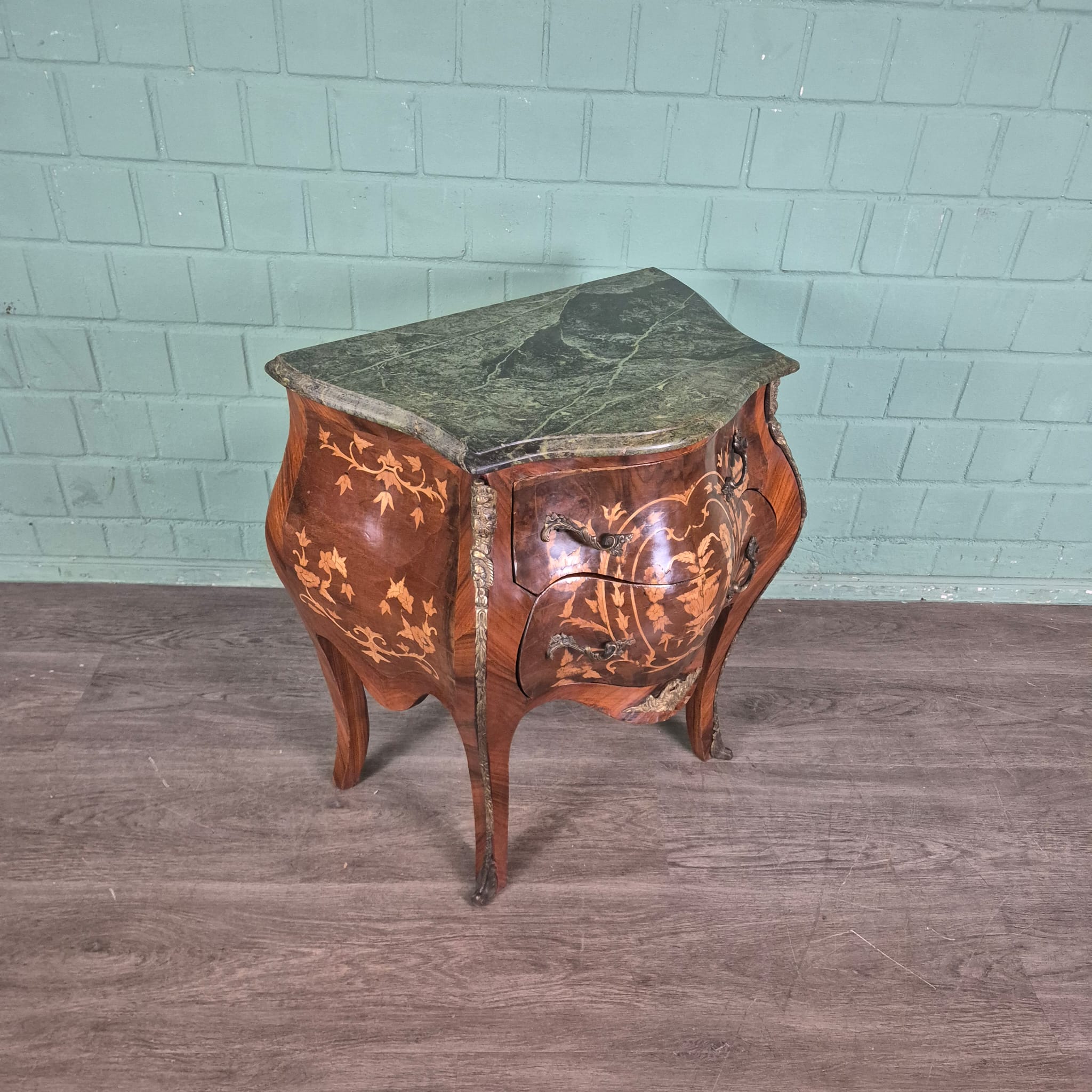Stijlvolle reproductie van een barok commode noten gefineerd met inlegwerk en een groen marmeren blad. Showmodel voor een speciale prijs.