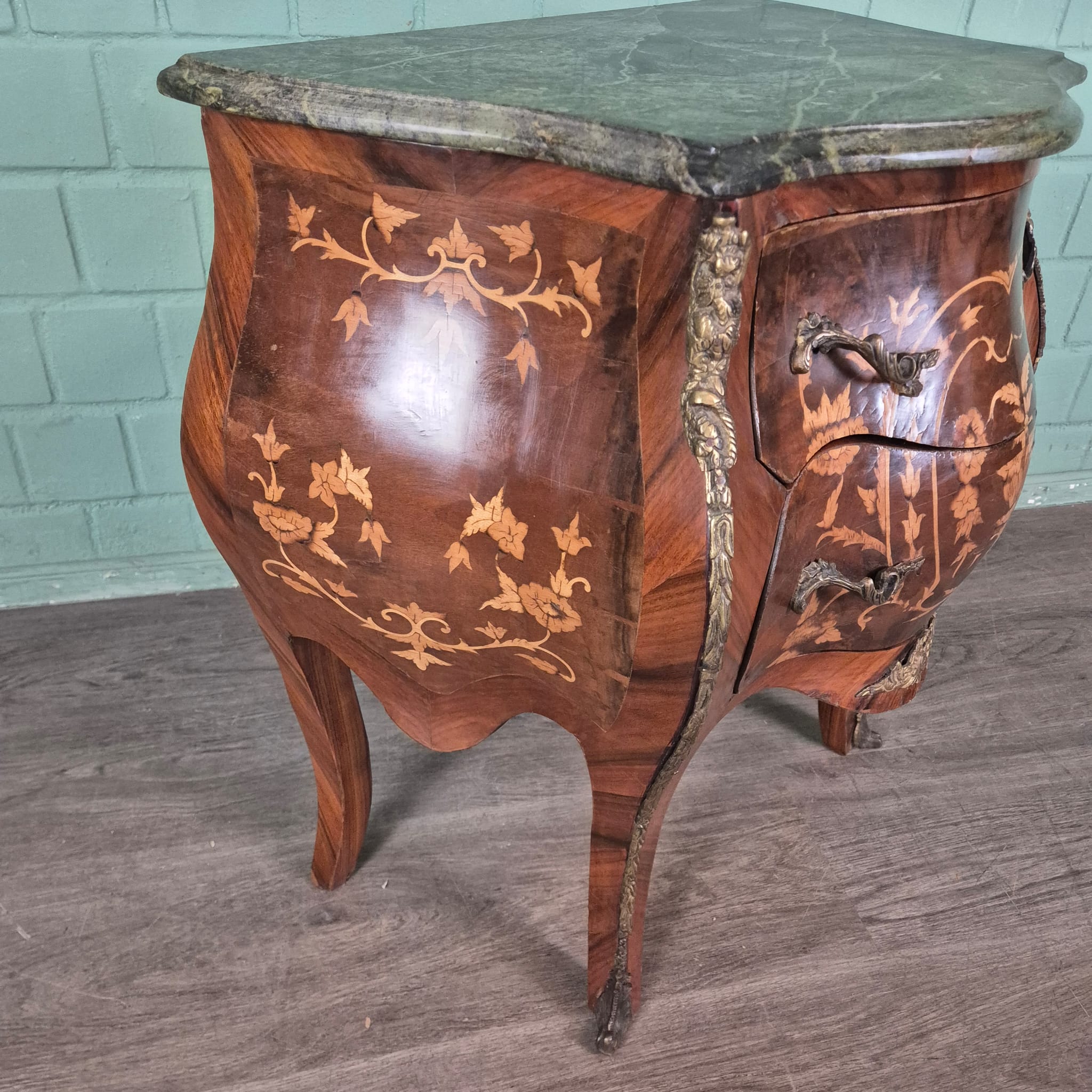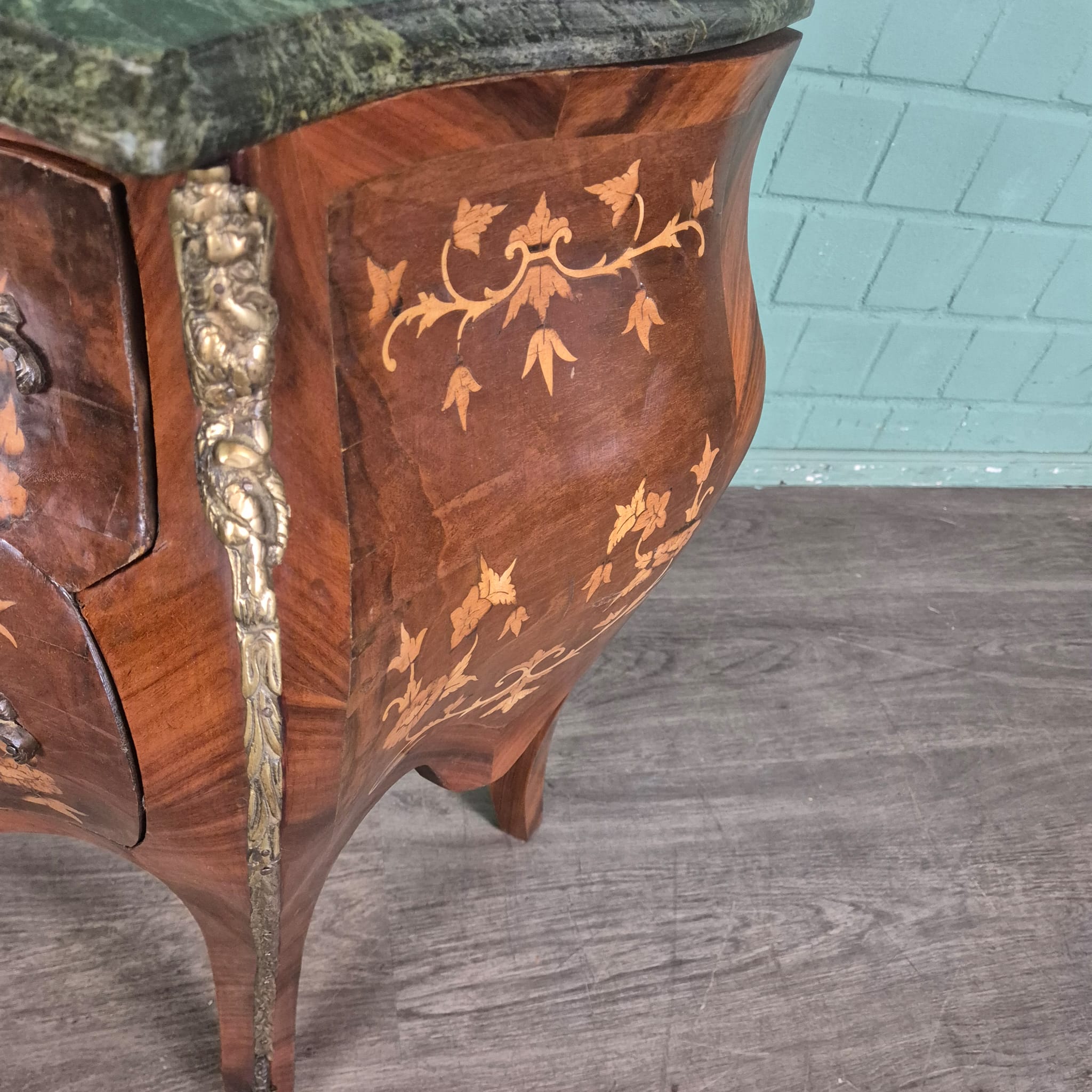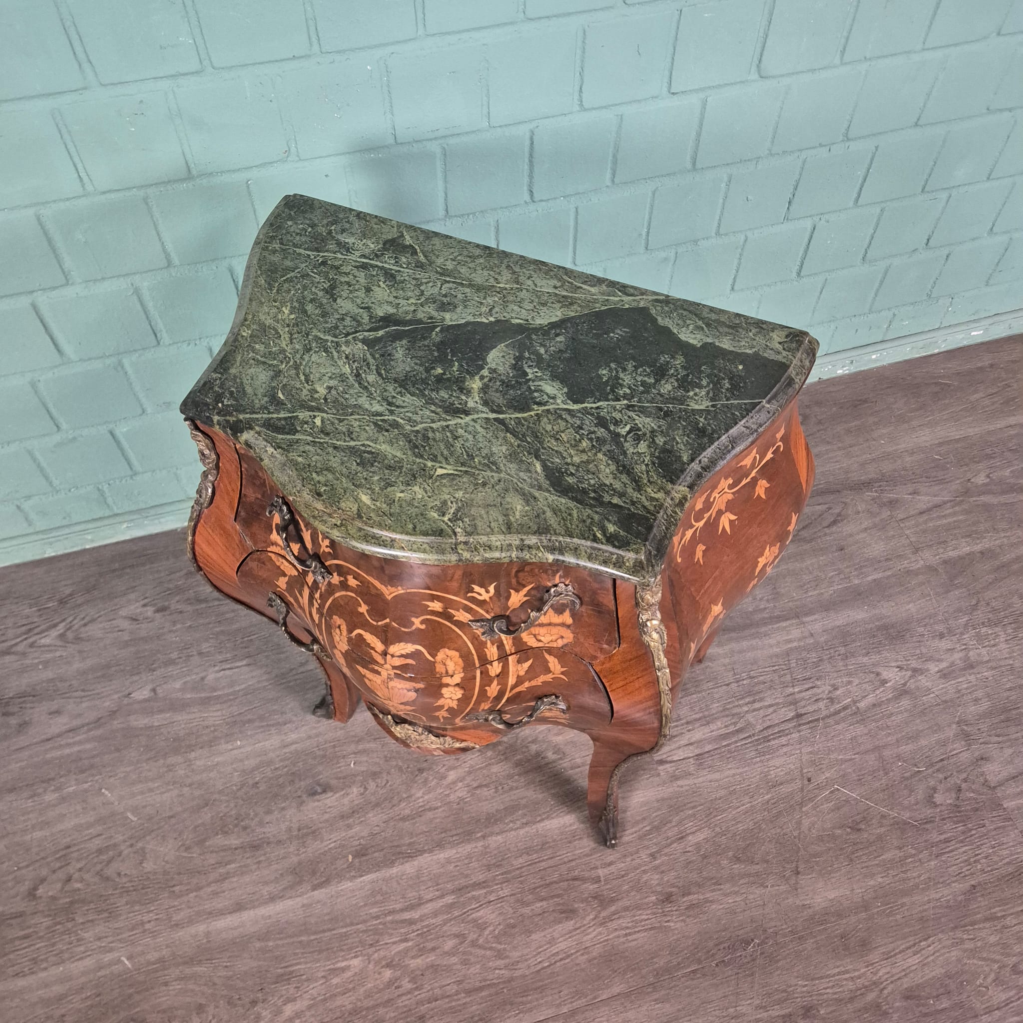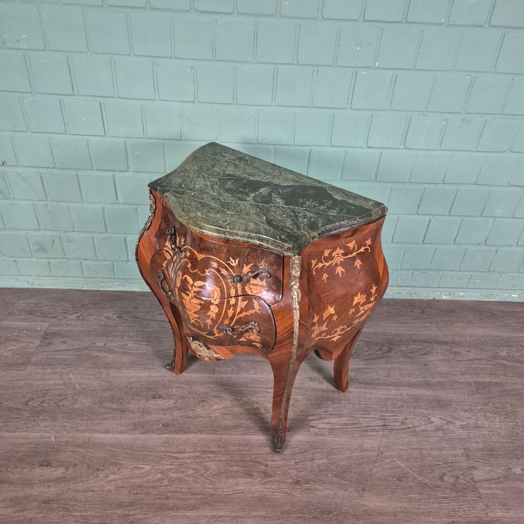 Stijlvolle reproductie van een barok commode noten gefineerd met inlegwerk en een groen marmeren blad. Showmodel voor een speciale prijs.