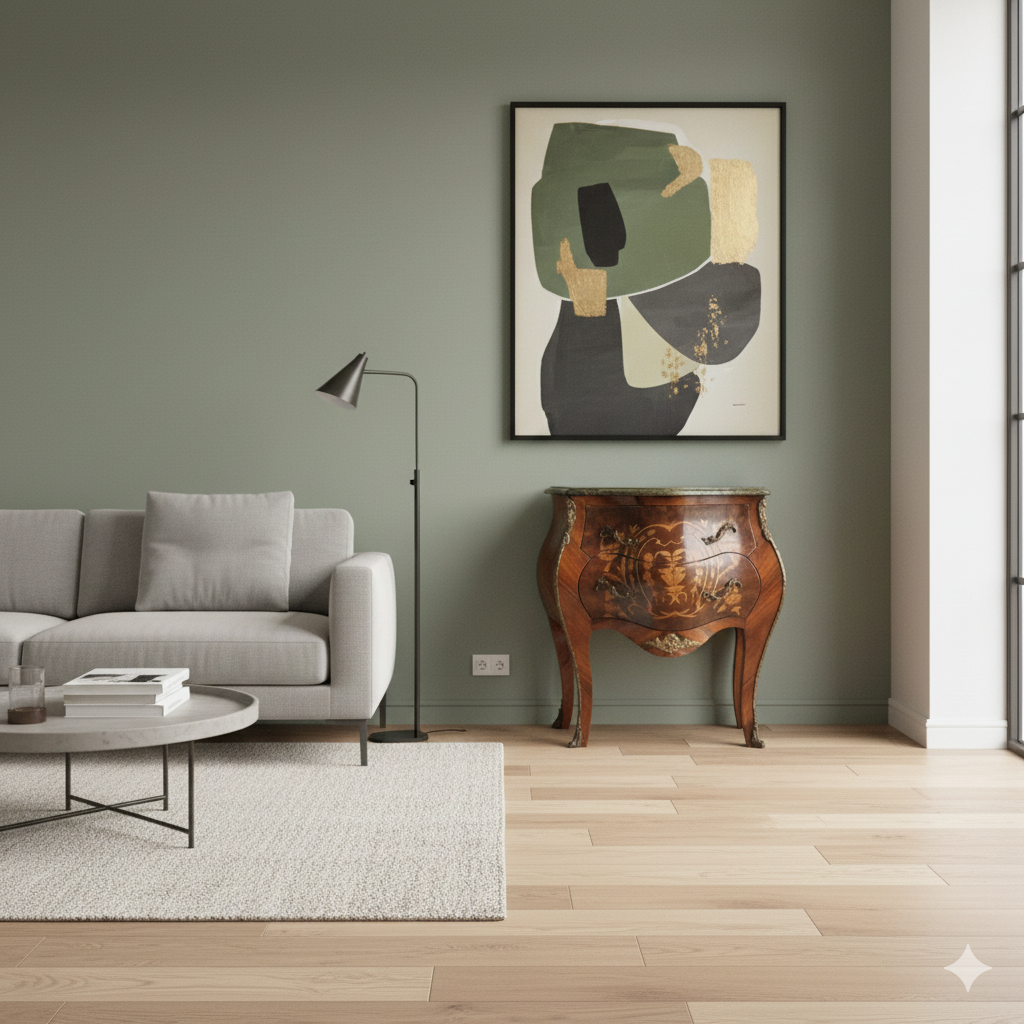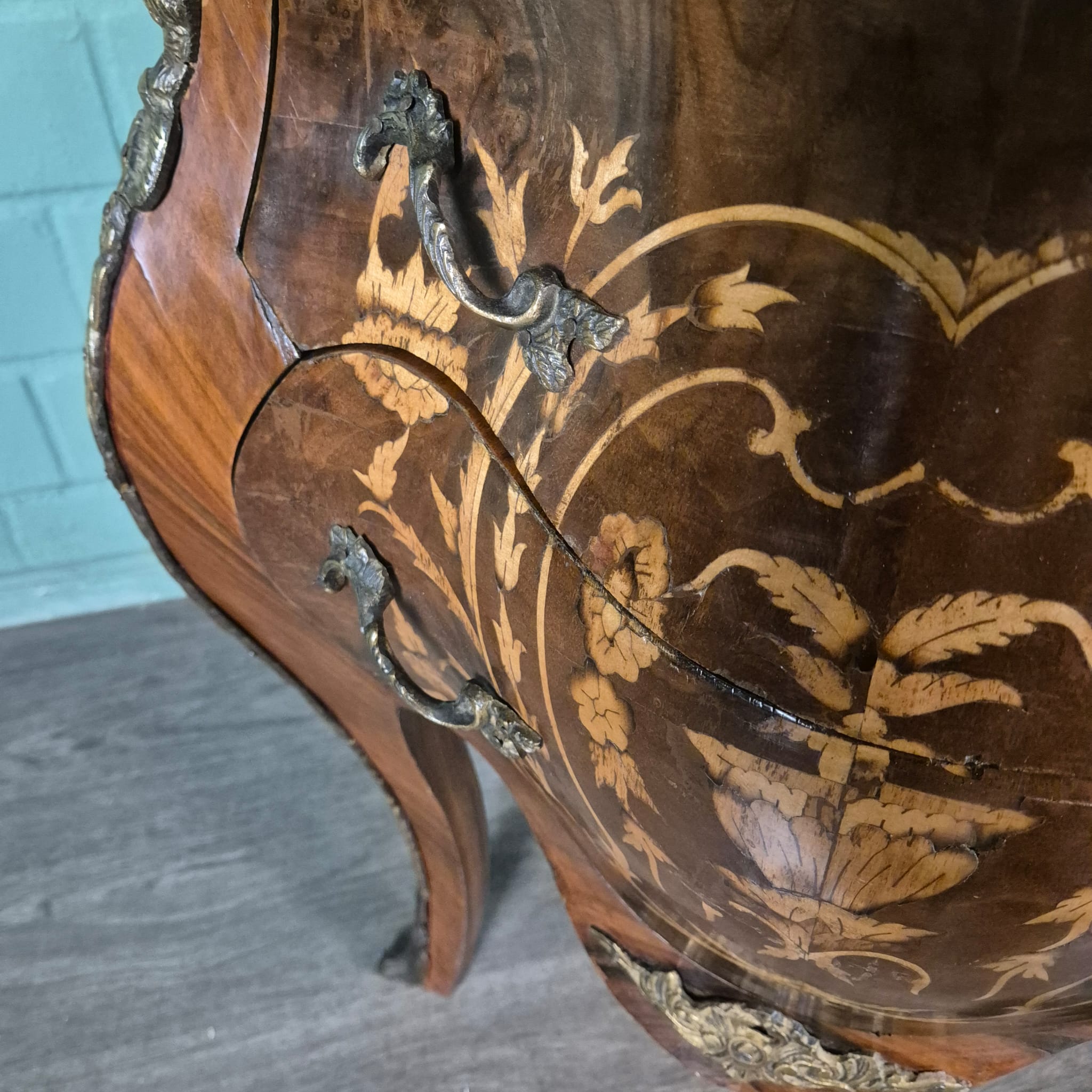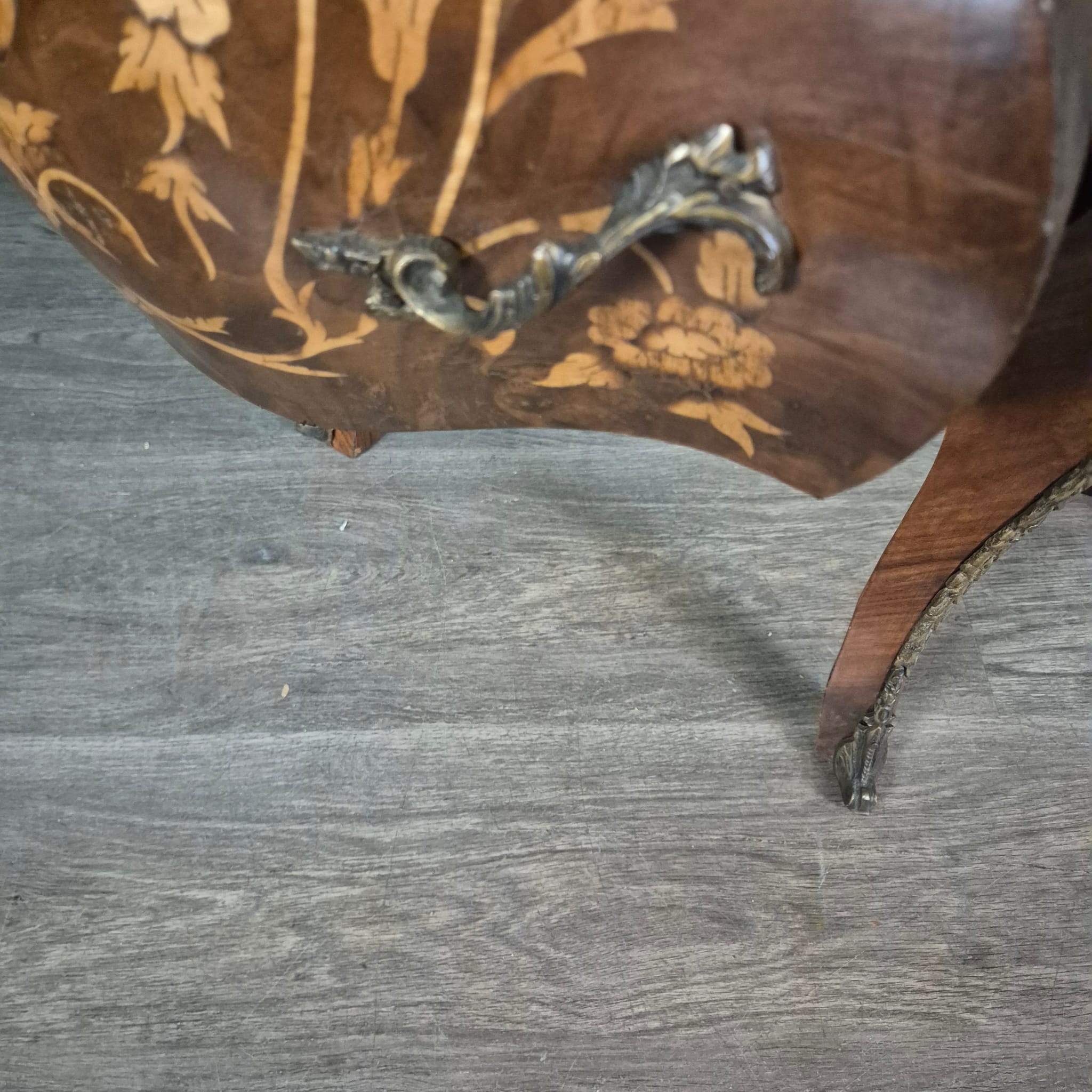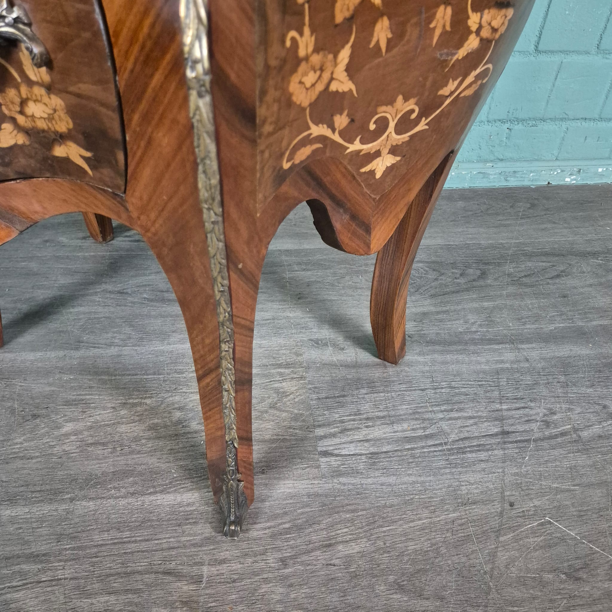 Stijlvolle reproductie van een barok commode noten gefineerd met inlegwerk en een groen marmeren blad. Showmodel voor een speciale prijs.