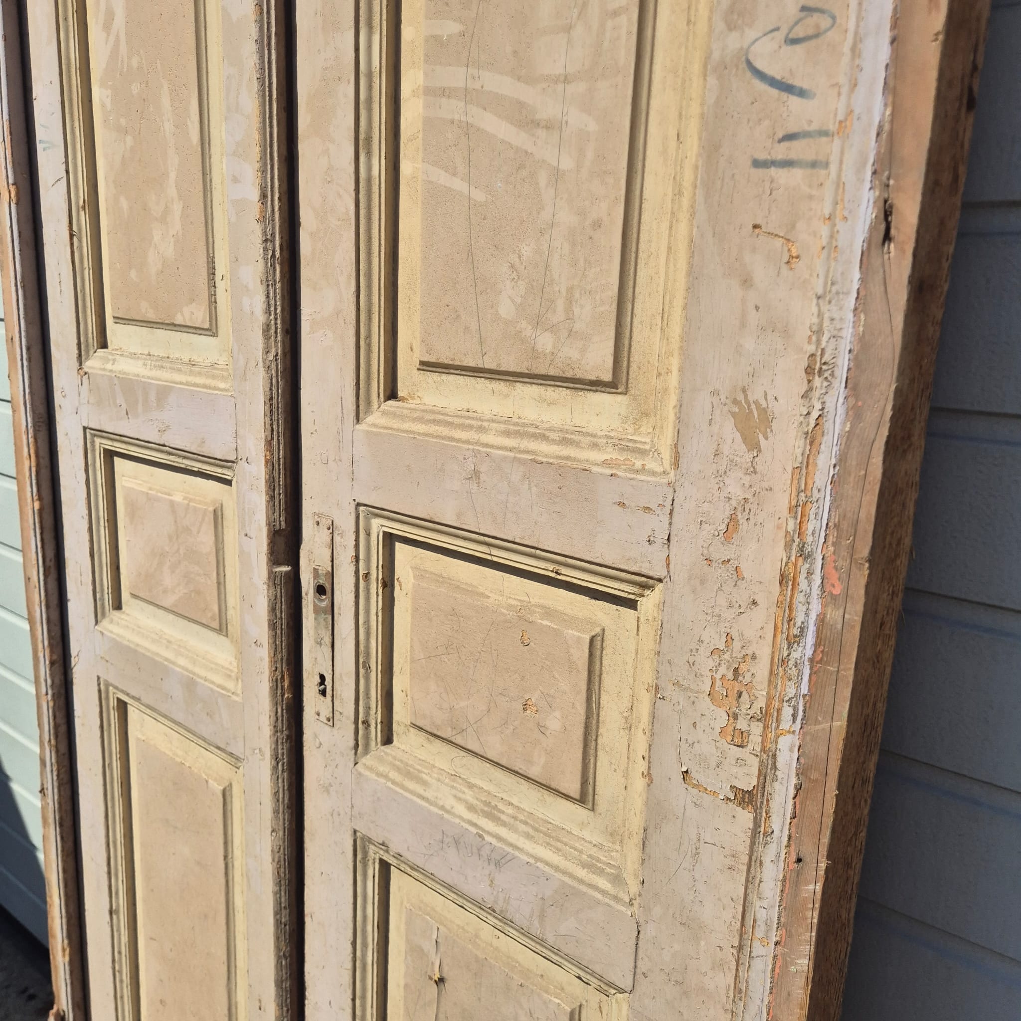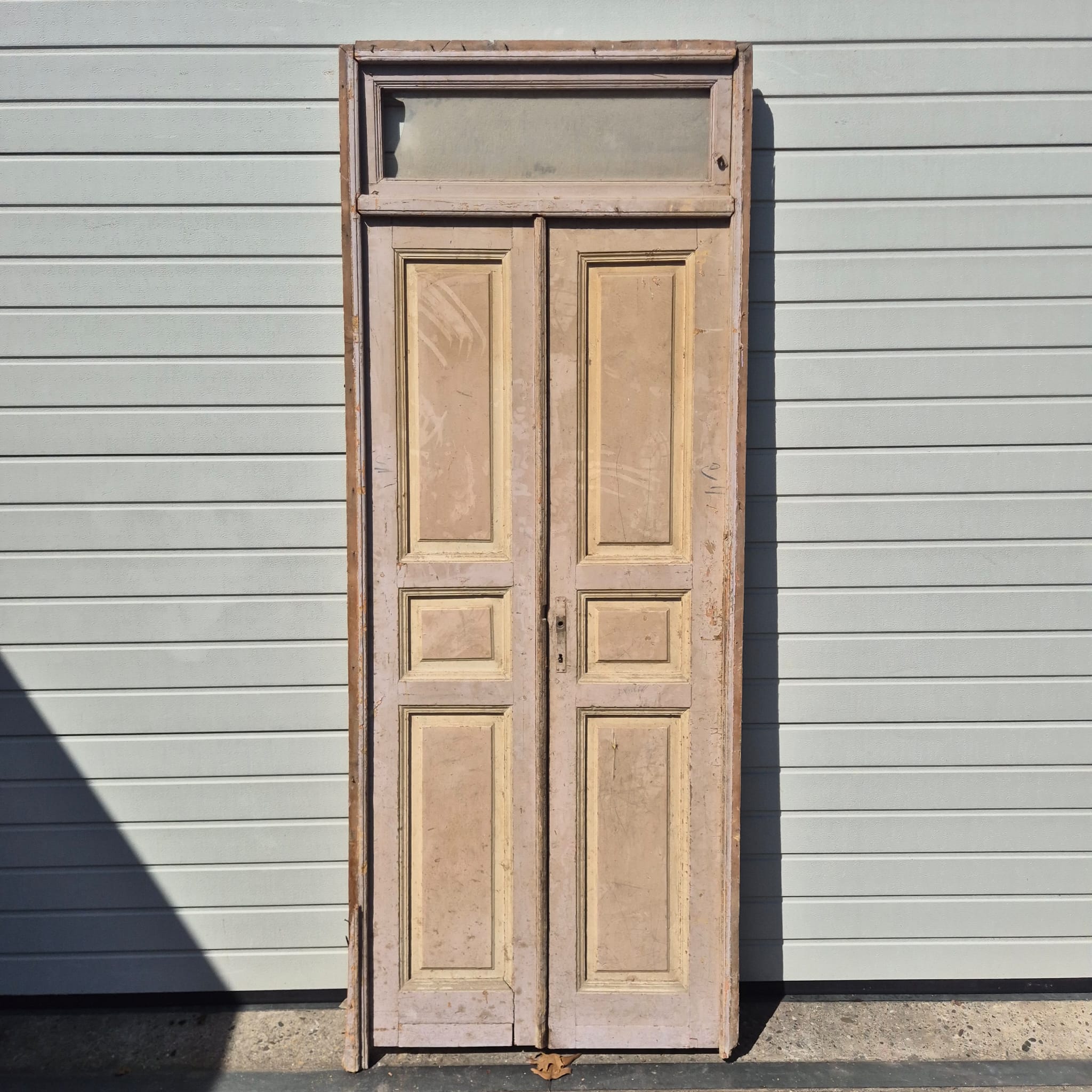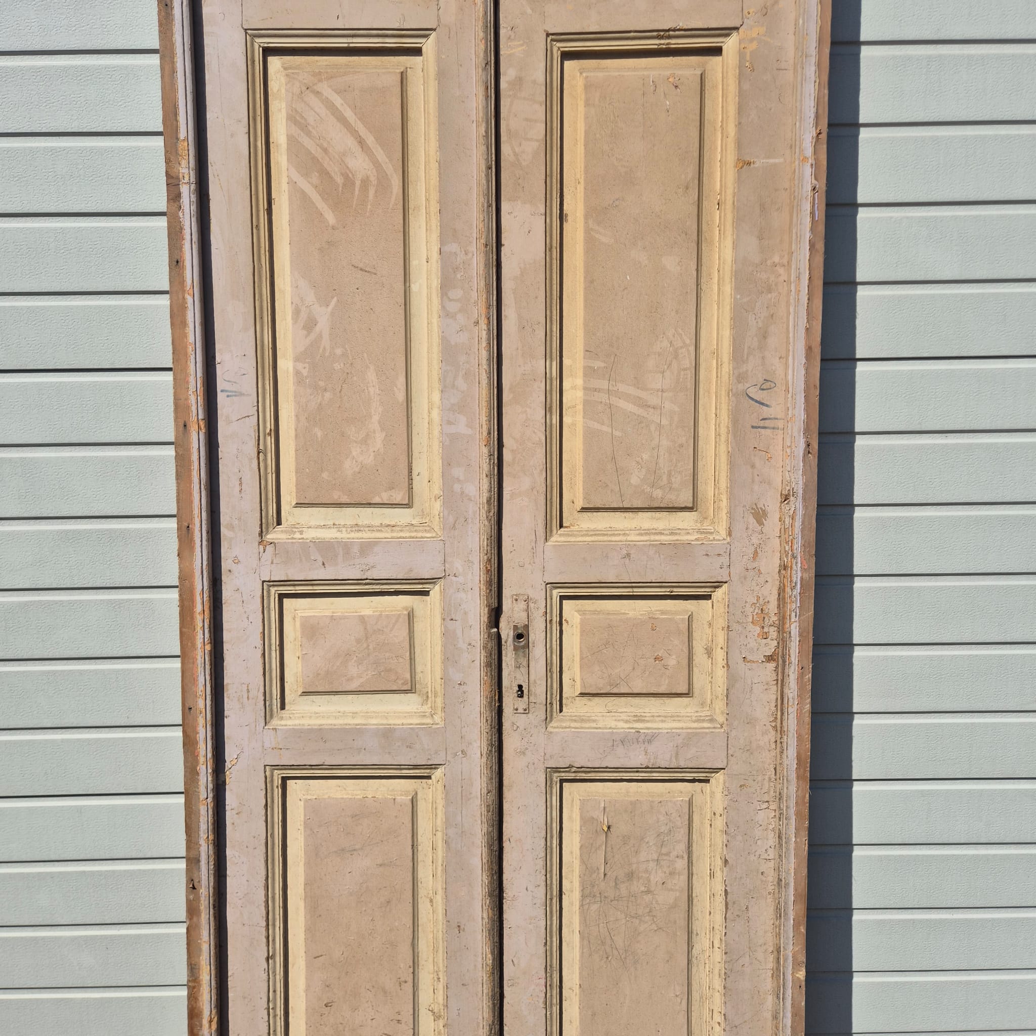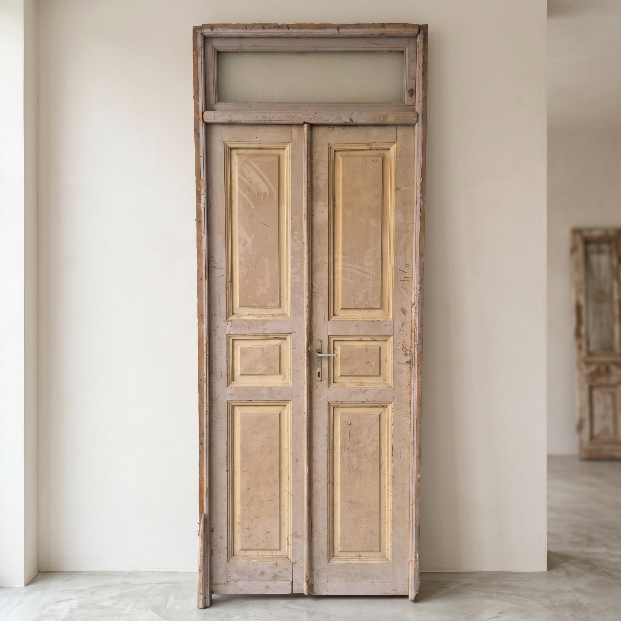 Historisch ontwerp: De deurvleugels en kozijnen zijn in ongerestaureerde originele staat met een fascinerende, meerlaagse beige afwerking die een unieke patina heeft ontwikkeld.