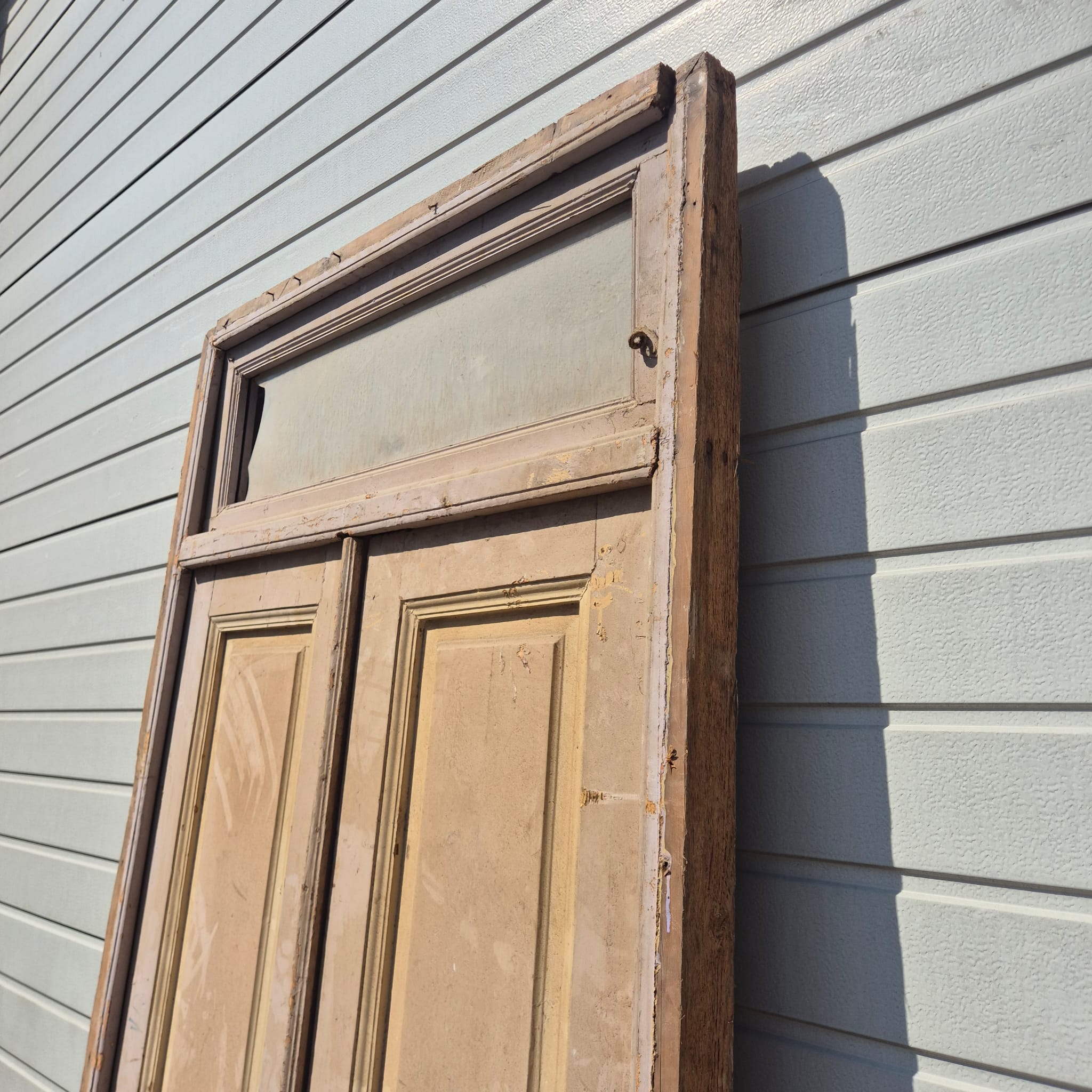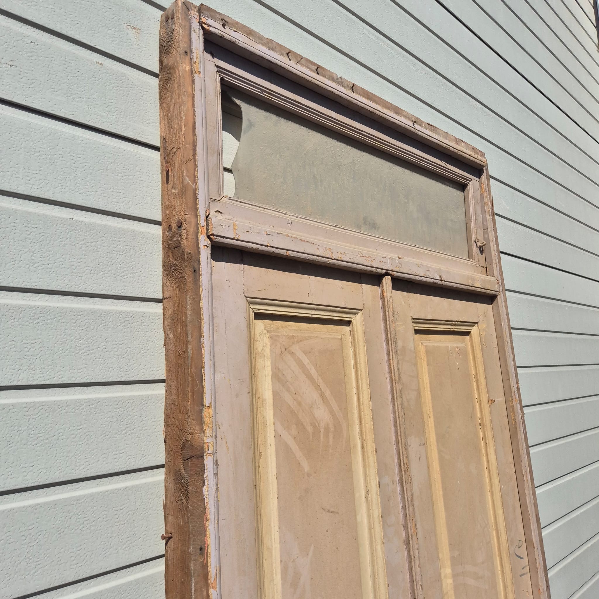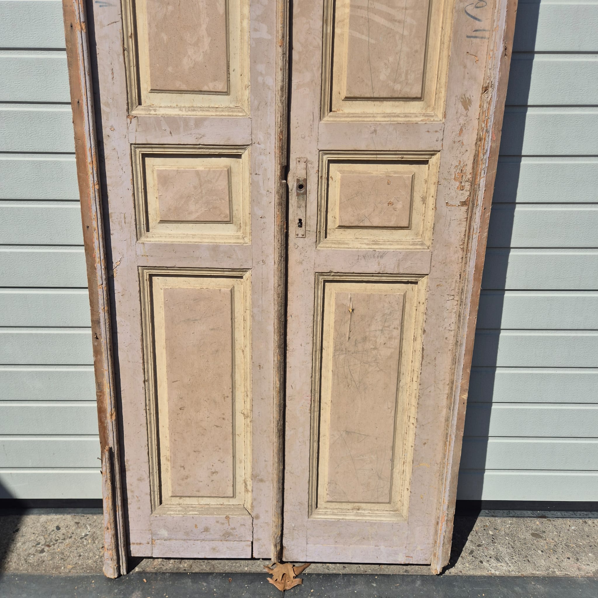 Historisch ontwerp: De deurvleugels en kozijnen zijn in ongerestaureerde originele staat met een fascinerende, meerlaagse beige afwerking die een unieke patina heeft ontwikkeld.