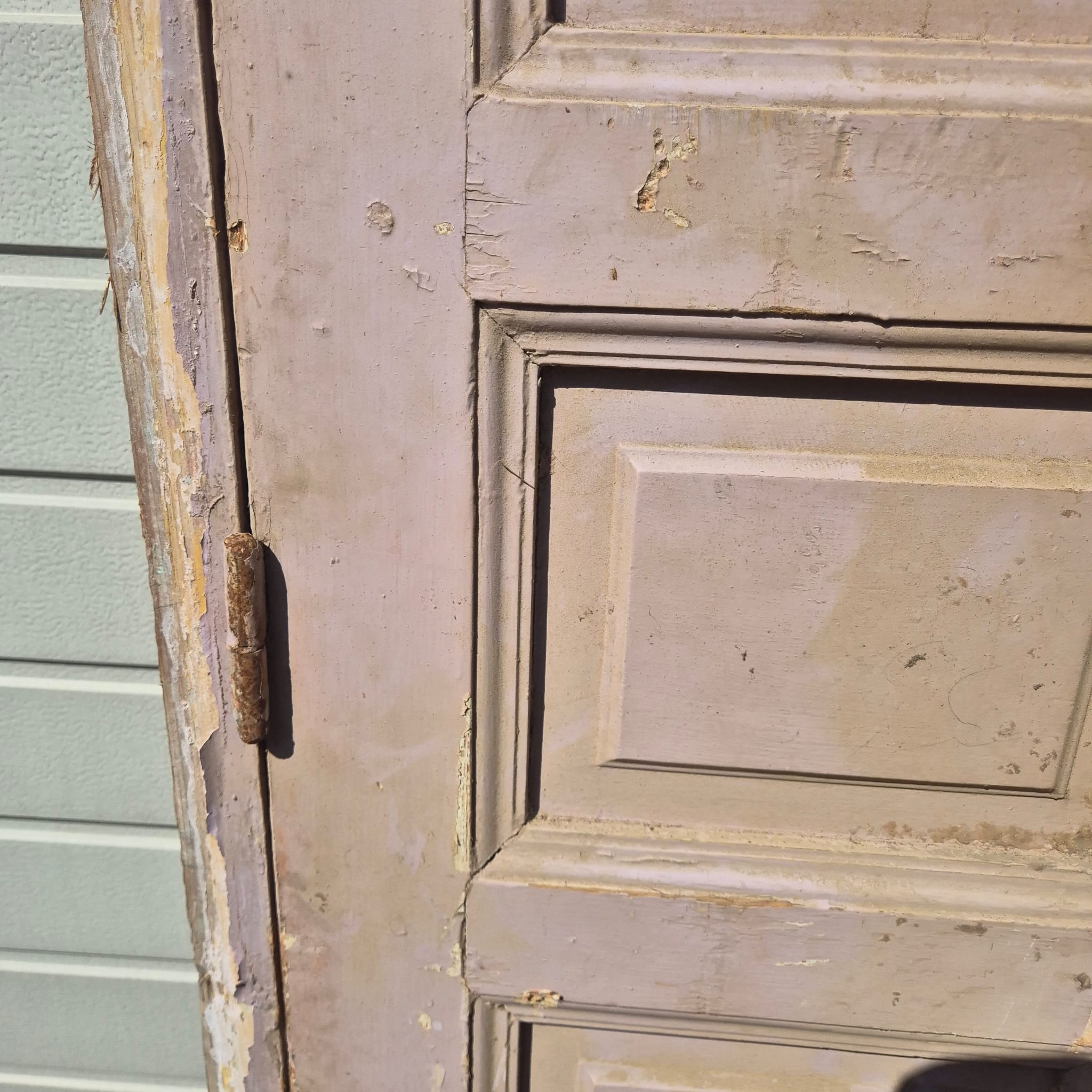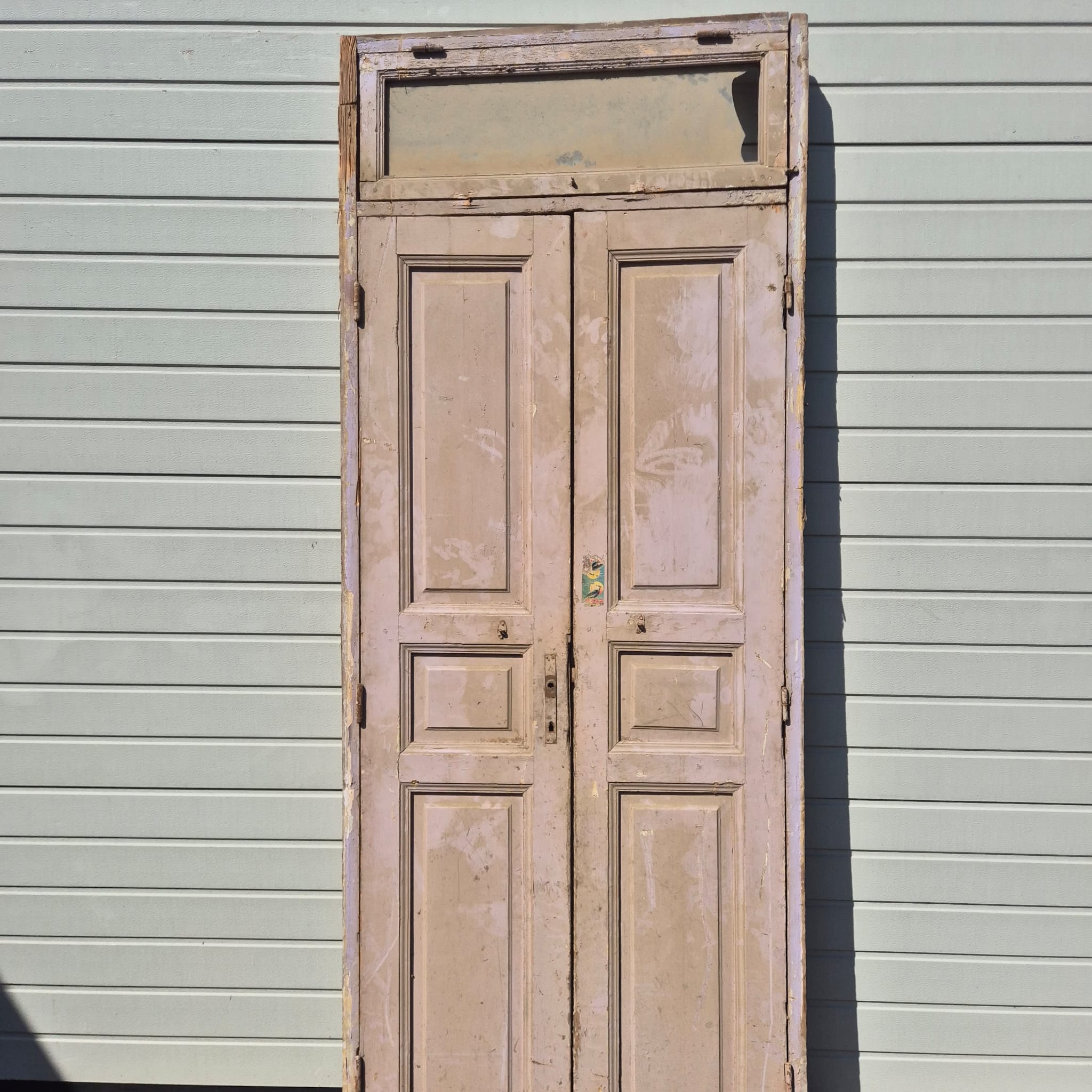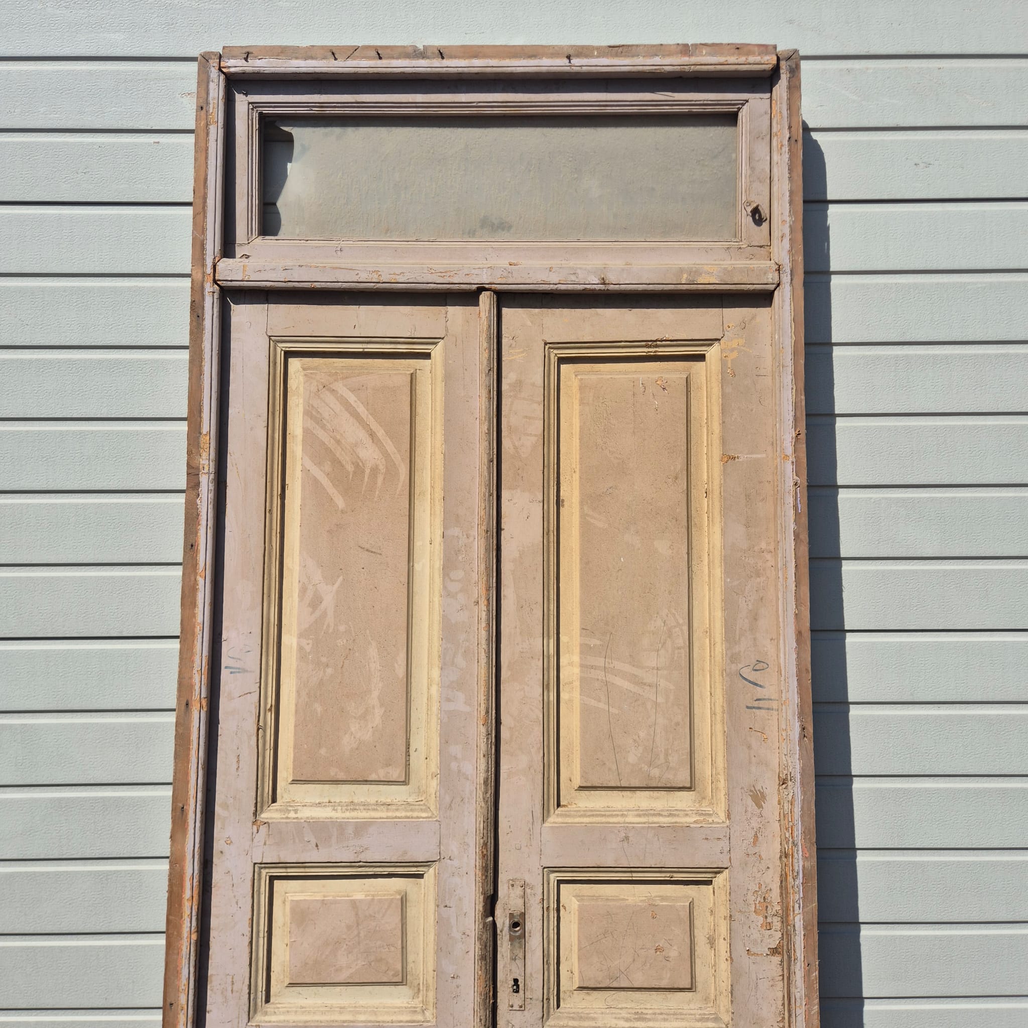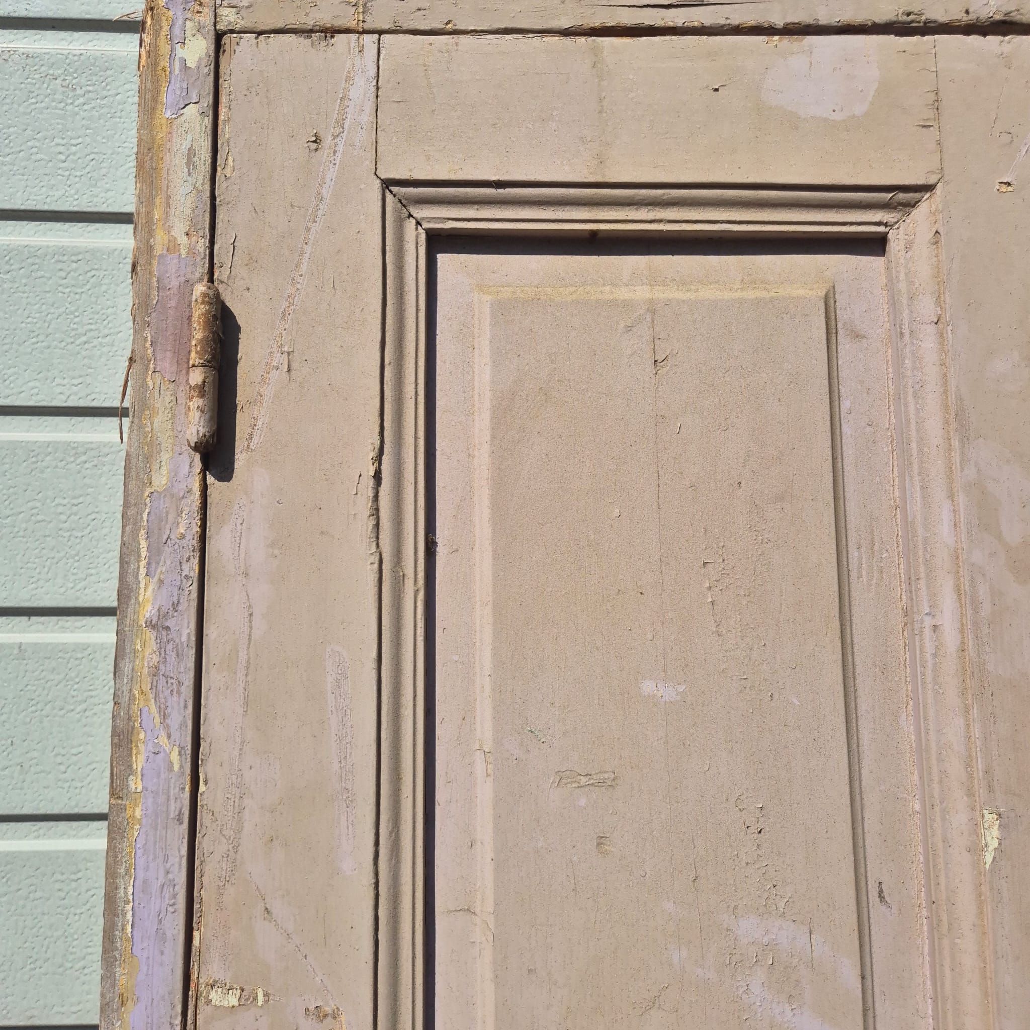 Historisch ontwerp: De deurvleugels en kozijnen zijn in ongerestaureerde originele staat met een fascinerende, meerlaagse beige afwerking die een unieke patina heeft ontwikkeld.