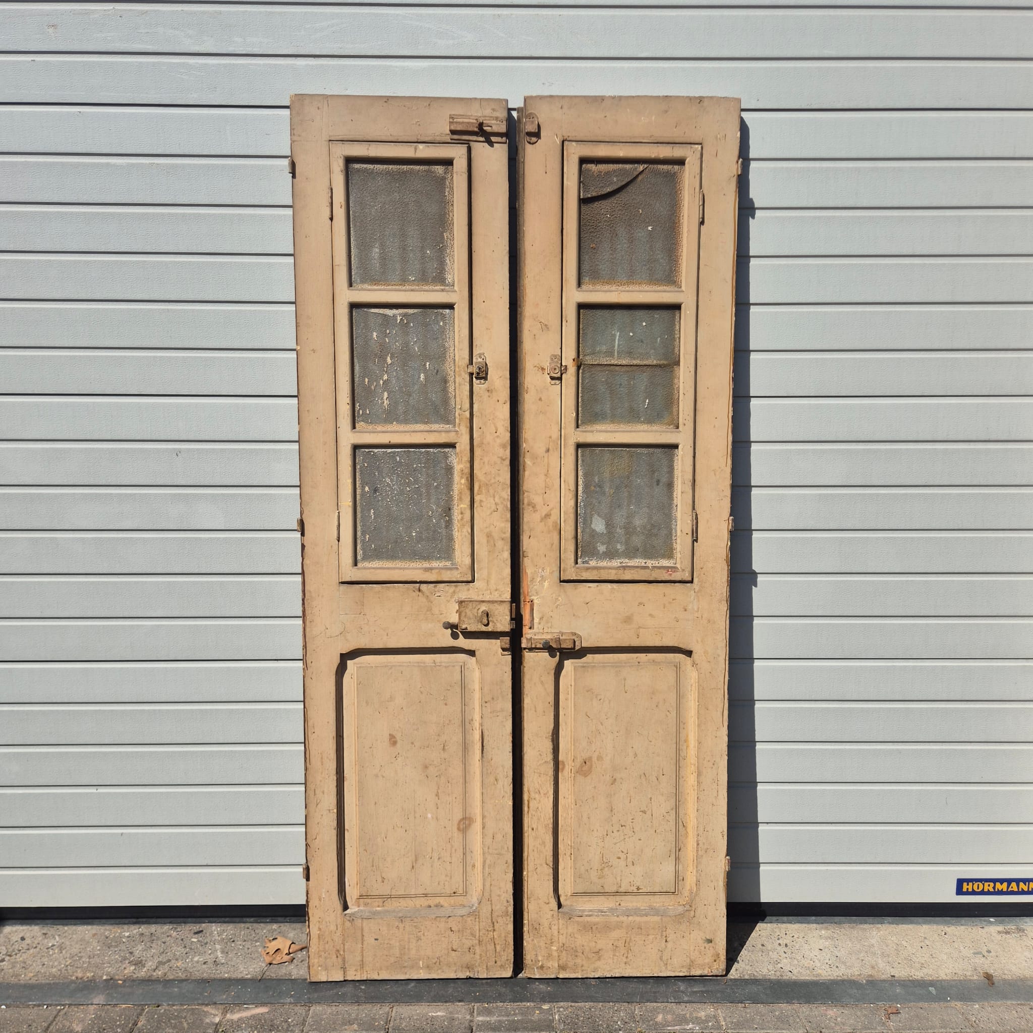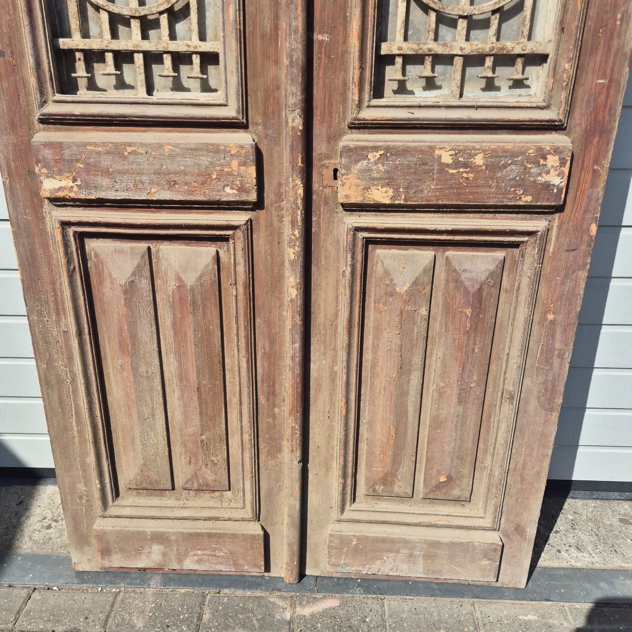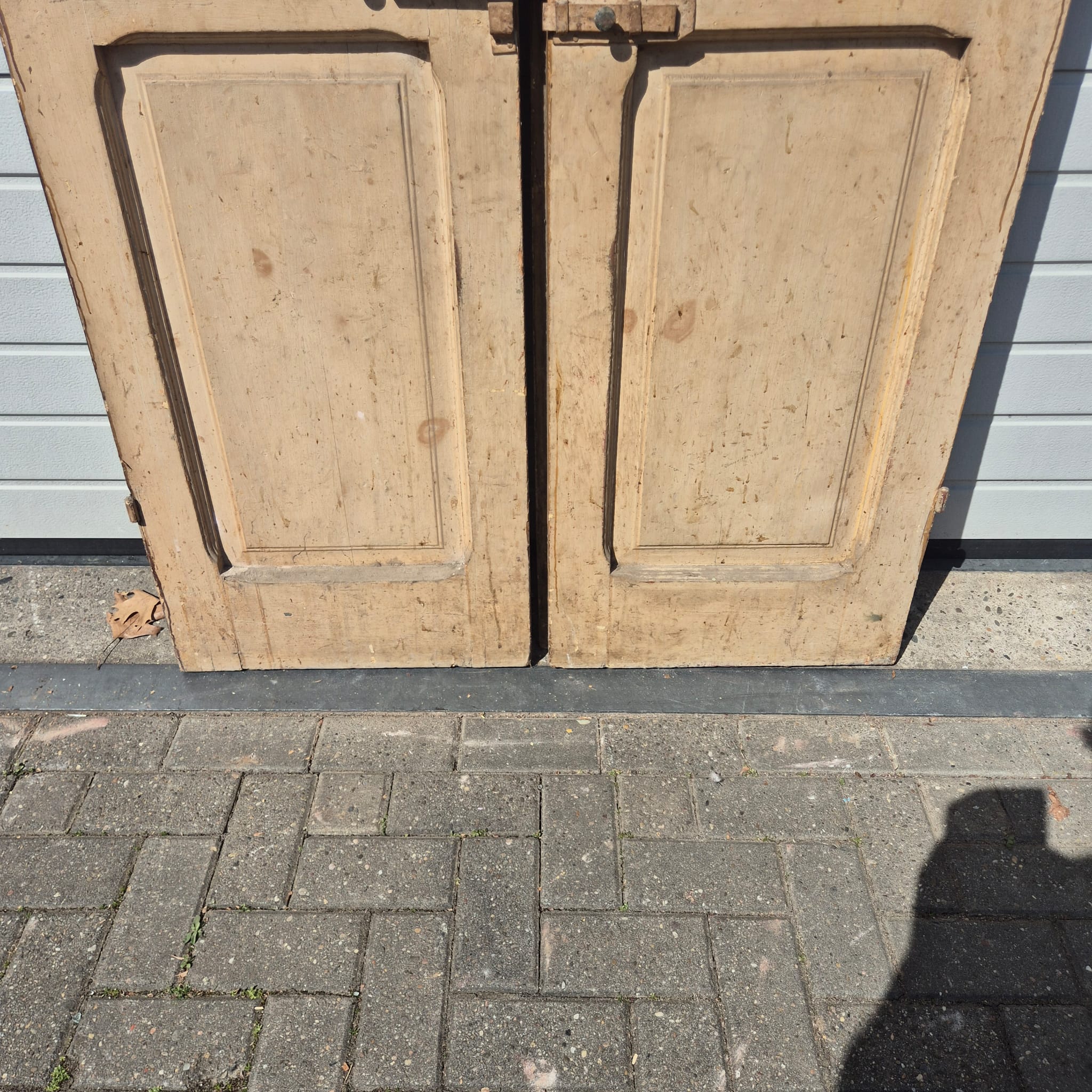 Geef uw bouwproject een uniek karakter! Te koop aangeboden: een indrukwekkende, massieve dubbele voordeur uit circa 1900. Dit architectonische juweel betovert met zijn imposante verschijning en meesterlijke vakmanschap.
